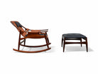 Introducing an exquisite ensemble of rocking chair and ottoman, designed by Liceu de Artes e Oficios in the 1960s, showcasing the essence of Brazilian Modernism. Constructed with a Brazilian Rosewood frame, this sculptural set exudes elegance and sophistication. The two-tone faux leather upholstery, adds a touch of sophistication to the overall design. Remarkably, the original upholstery remains in excellent condition; however, it can be customized upon request. The chairs and ottoman feature soft curves, evident in their legs and backrests, which harmonize perfectly with the abundant use of wood, further accentuating its modern aesthetic.