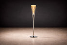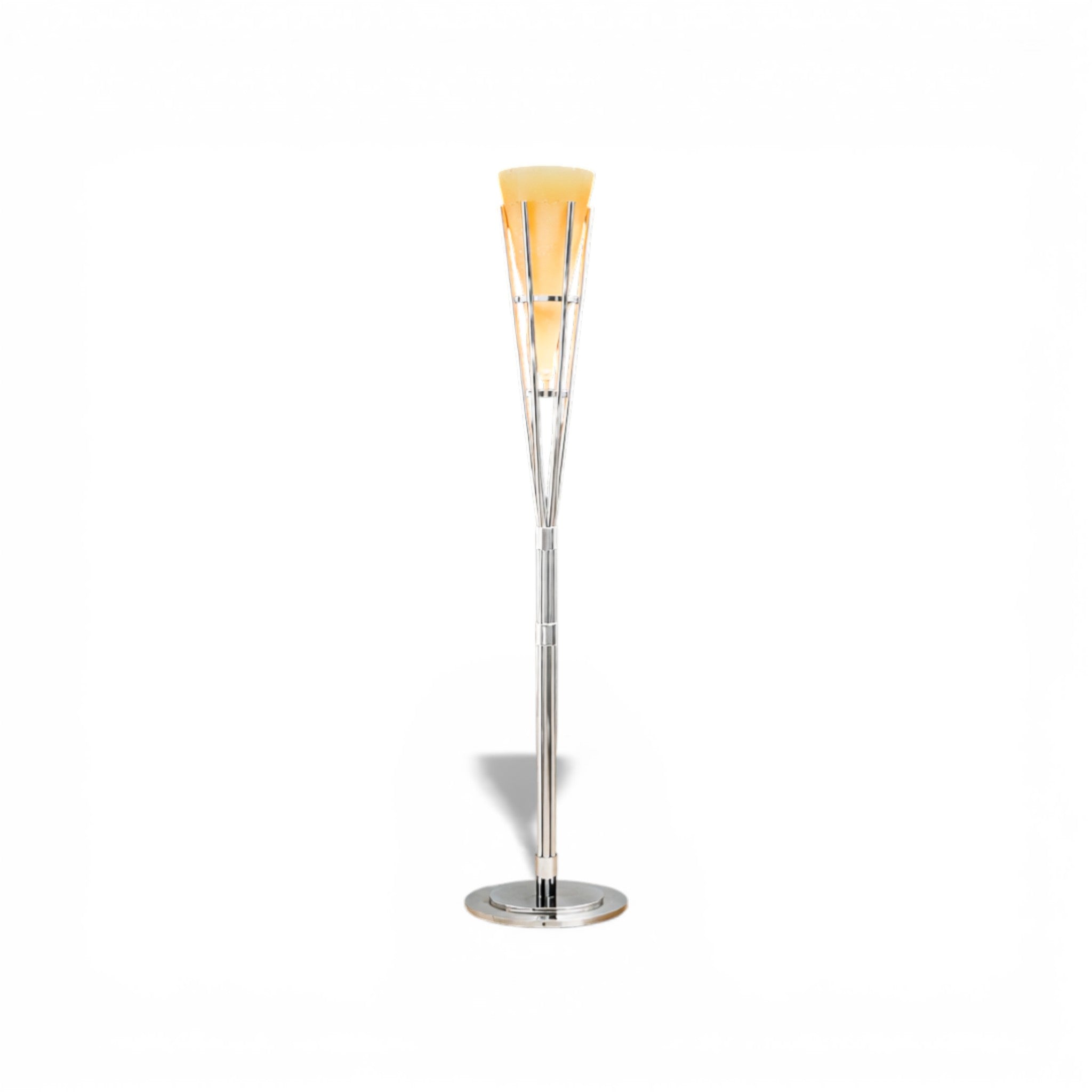 The six uprights form an open framework around the candle, allowing light to radiate softly while preserving the clarity of the structure. This interplay between exposed metal and diffused glow reflects the modernist interest in transparency and material contrast. The chromed surfaces, finely polished, introduce a reflective quality that responds subtly to surrounding light, reinforcing the lamp’s presence without excess ornament.