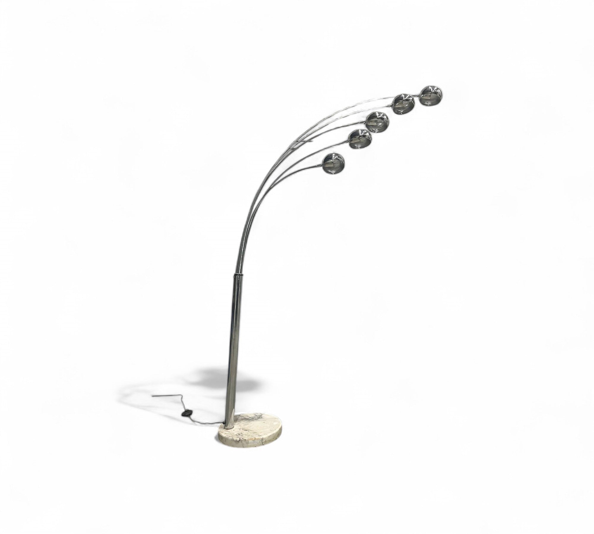 This elegant floor lamp is crafted from chromed metal and features supports for five lights. The rods and domes have lateral movements, allowing for various focusing possibilities. It stands on a Carrara marble base, adding a touch of sophistication. The lamp has been rewired specifically for use in the United States.