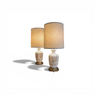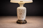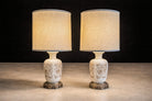 The lamps remain in excellent vintage condition, with minimal wear to the gilt decoration and light patina consistent with age on the metal bases. Measuring 19 inches from base to socket (excluding harp), the pair stands as a thoughtful example of mid-century lighting design—where ornament is disciplined, proportion is balanced, and utility is seamlessly embedded within form.