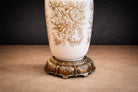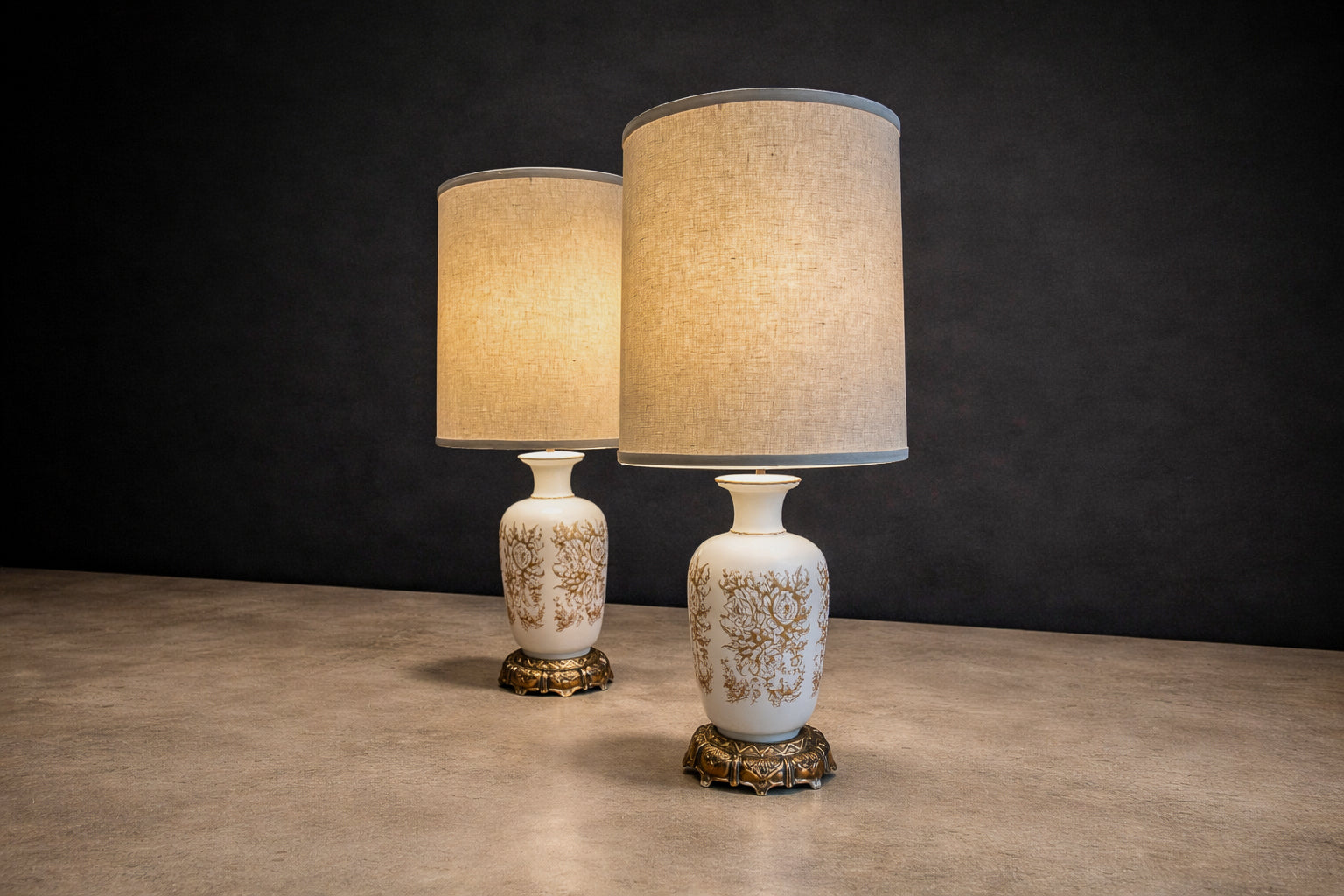 Each lamp is composed of a white satin glass body defined by a gently tapered neck and rounded urn form. A delicate gold floral motif encircles the central body, applied with measured detail that contrasts subtly against the matte translucence of the glass. The sculptural quality of the form is anchored by a cast metal base, whose aged patina provides tonal depth and visual grounding.