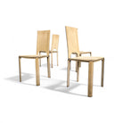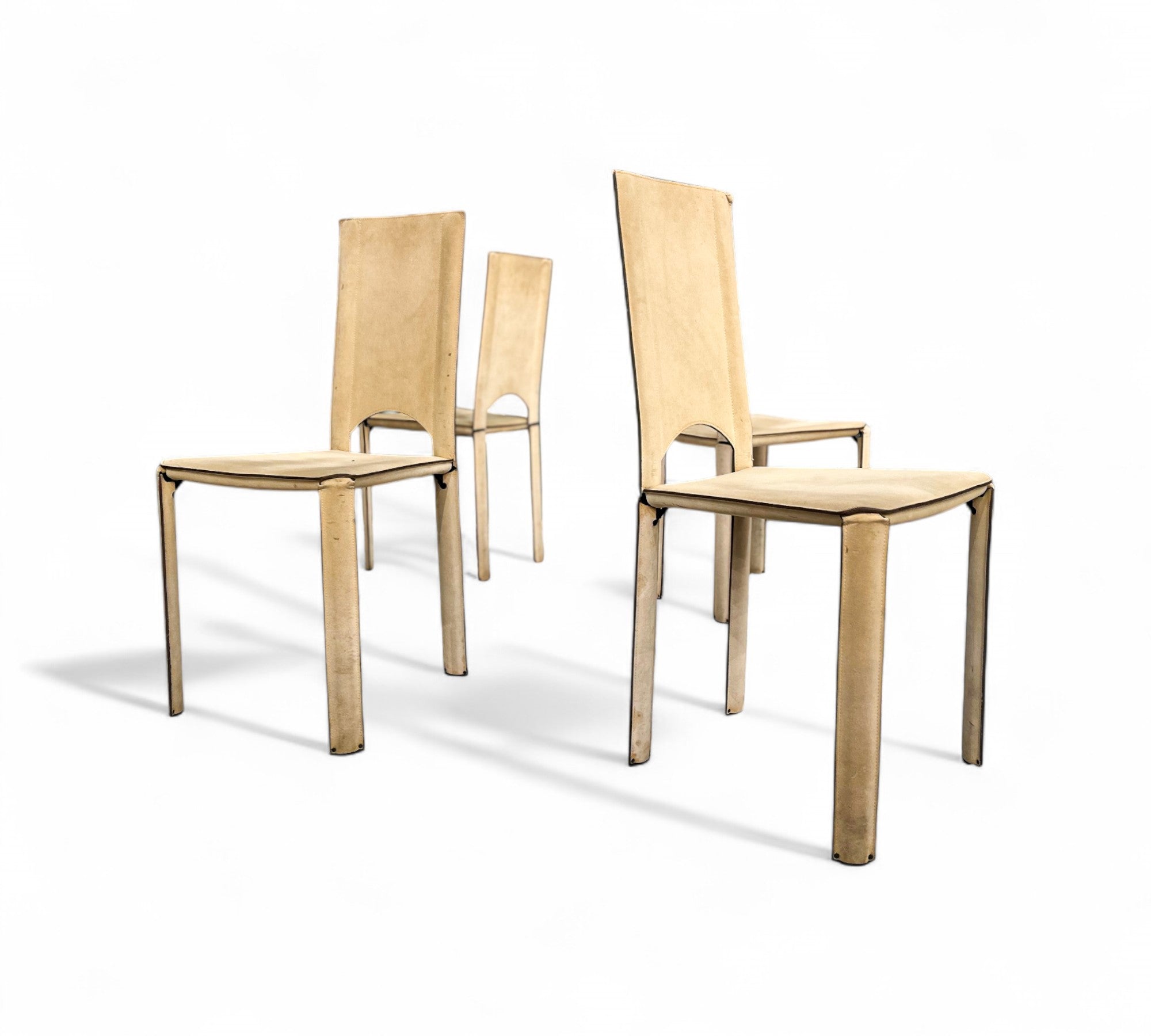 This set of four dining chairs, made with white leather, exudes stunning elegance. The upholstery is meticulously crafted with leathered parts, manually processed and sewn into a single piece, fitted snugly over a metal frame and closed with zippers. Mario Bellini aptly described these chairs as "a sewn leather dress mounted on the steel frame, stretched like skin over a skeleton, in a relationship of structural and organic symbiosis."