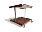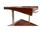 Introducing a stunning bar cart that seamlessly combines style and functionality. This exquisite piece boasts a sleek chrome frame, elegantly complemented by two removable trays. One side of each tray features a rich new rosewood veneer, while the other is finished with pristine white Formica—perfect for serving drinks. The trays are designed with sculpted edges in rosewood, adding a distinctive, modern touch.