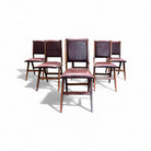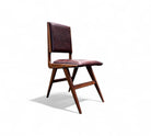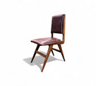 Designed by Forma Brazil, this set of six dining chairs showcases elegant refinished rosewood frames with the original faux leatherette upholstery in a richly textured finish. The clean lines, tapered legs, and striking dark veins of Brazilian rosewood exemplify the refinement and craftsmanship of Brazilian mid-century modern design. Created by Eisler and Hauner, these chairs balance style and functionality, offering comfort and timeless sophistication while complementing any dining table or interior setting. This set of six has 5 in the maroon leatherette and one chair that is in a cream leatherette, please inquire about our reupholstery services.