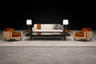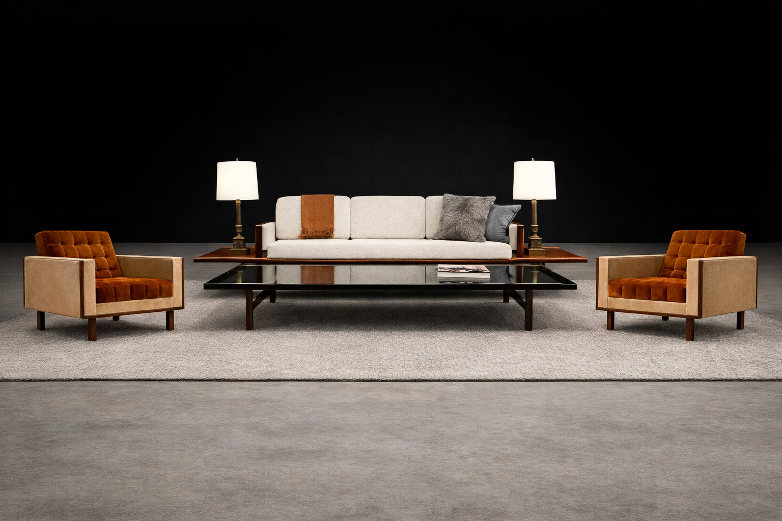 The seating surfaces are rendered in a warm tobacco / cognac brushed mohair, chosen for its directional nap and subtle luster, offering a rich, tactile counterpoint to the slightly lighter camel wool that wraps the outer shell. This duality—dense, luminous interior against a matte, architectural exterior—heightens both form and function, reinforcing the sculptural clarity of the frame.
