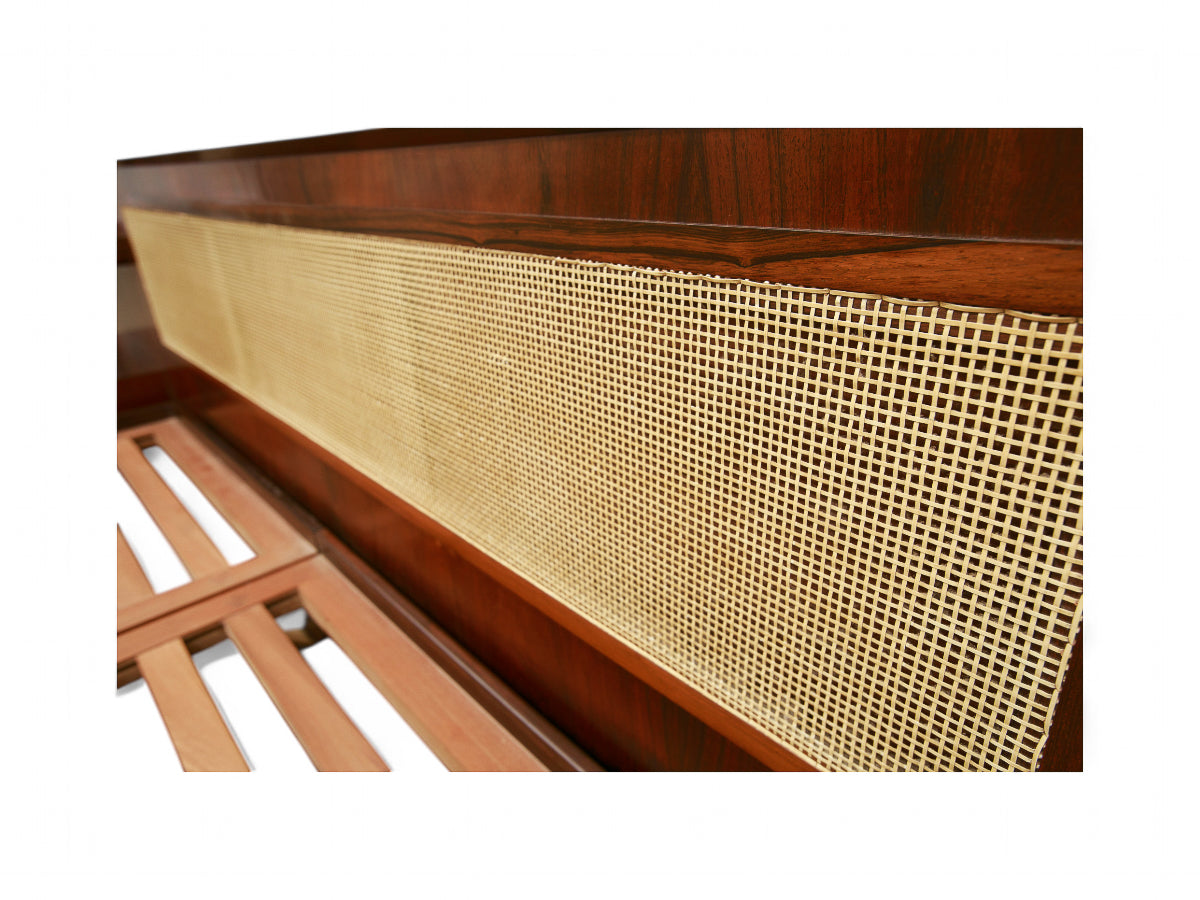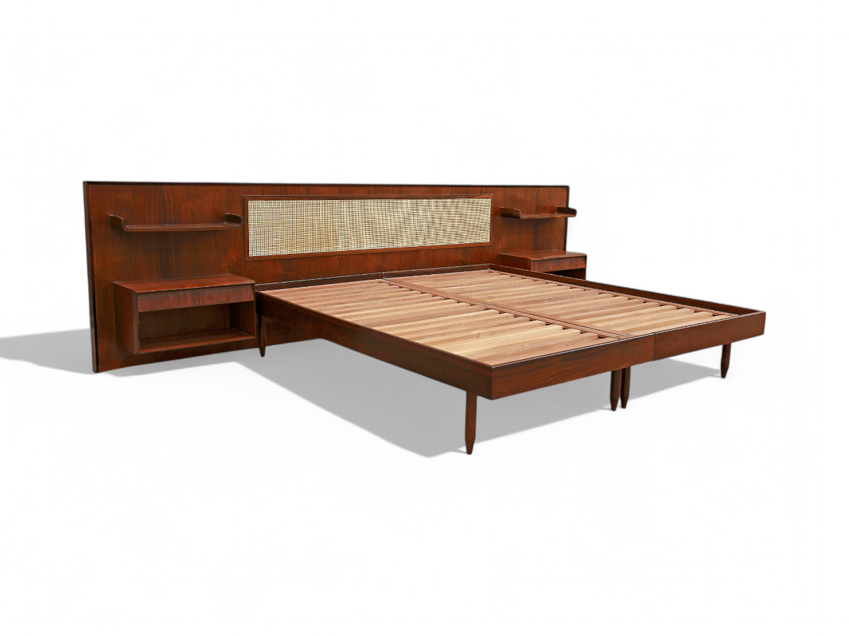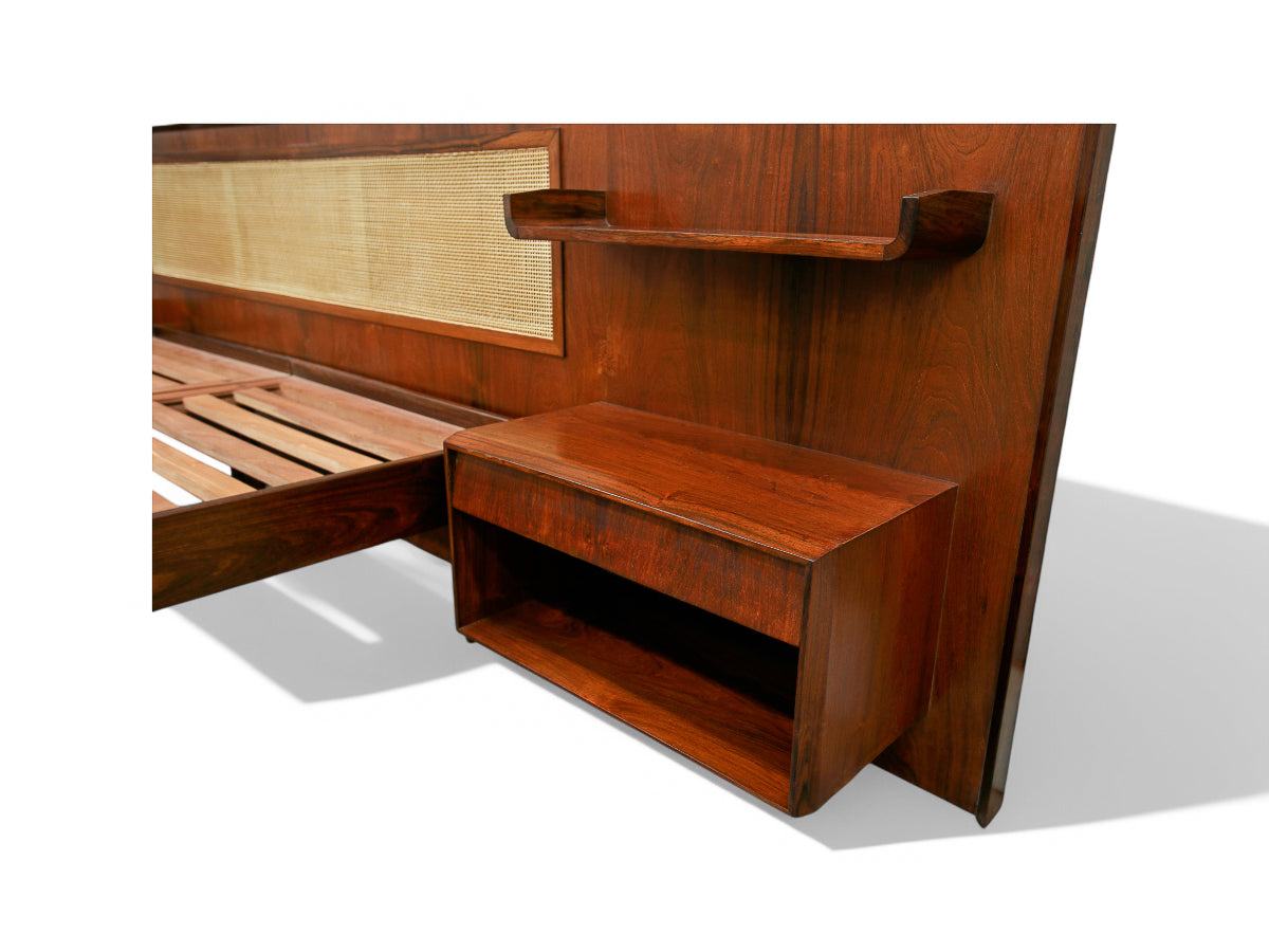 This one of a kind bed with headrest was designed by Carlo Hauner in the fifties and is truly a masterpiece. The set is entirely made in Brazilian Rosewood, known as Jacaranda. The king bed consists of two structures with sculpted cone shaped legs. The spectacular headrest has a caning panel in the middle (caning is new) with one shelf and drawer on each side. The wood has been refinished and displays colorful veins.