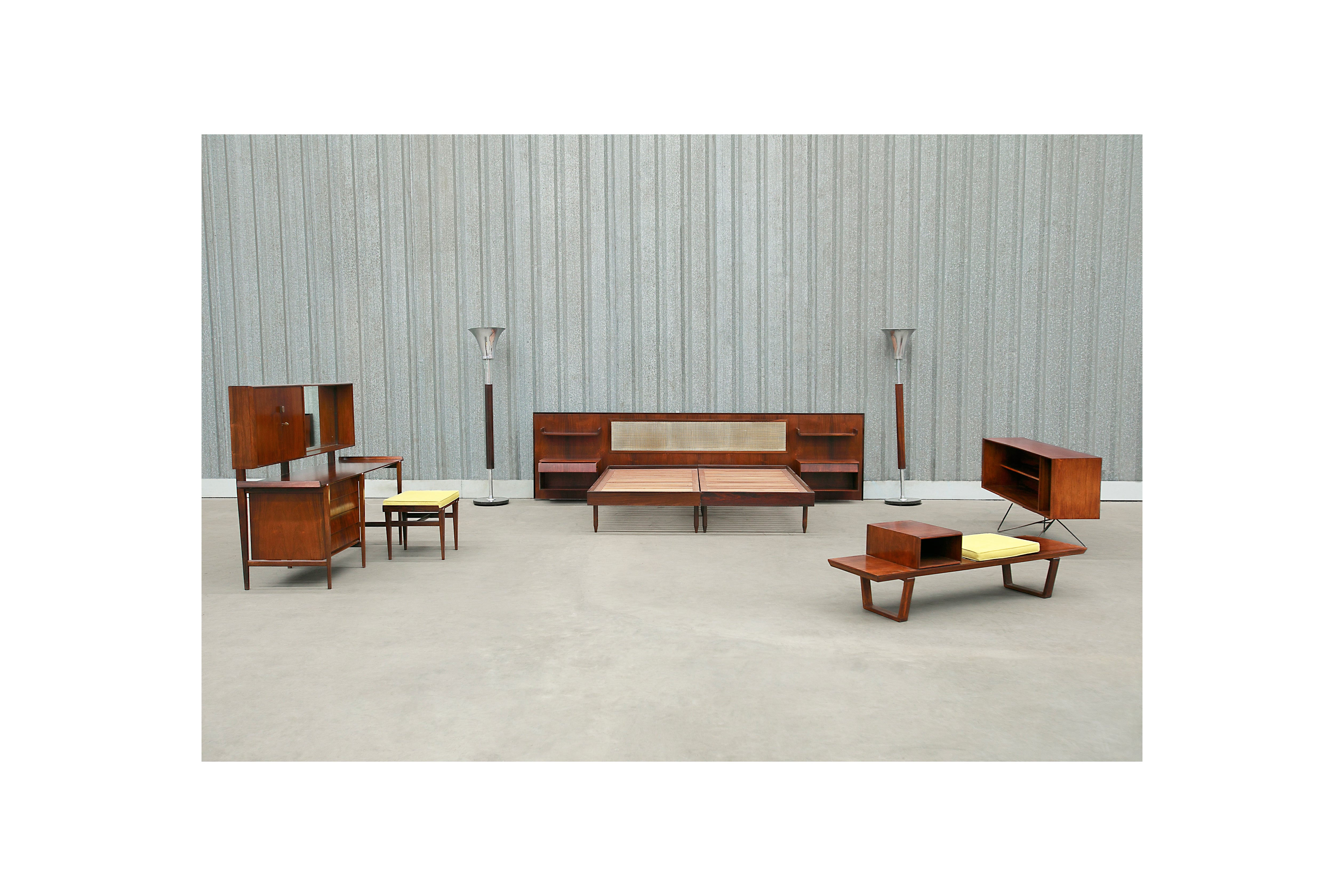 The bed and headrest are part of a room set consisting of a bench and a wall module as is showcased in one of the images (pieces are sold separately). We purchased this set from a house in Teresopolis, a known Modernist city two hours away from the city of Rio de Janeiro.