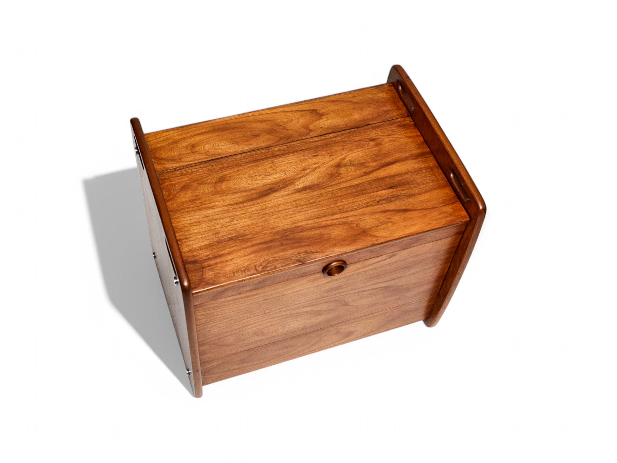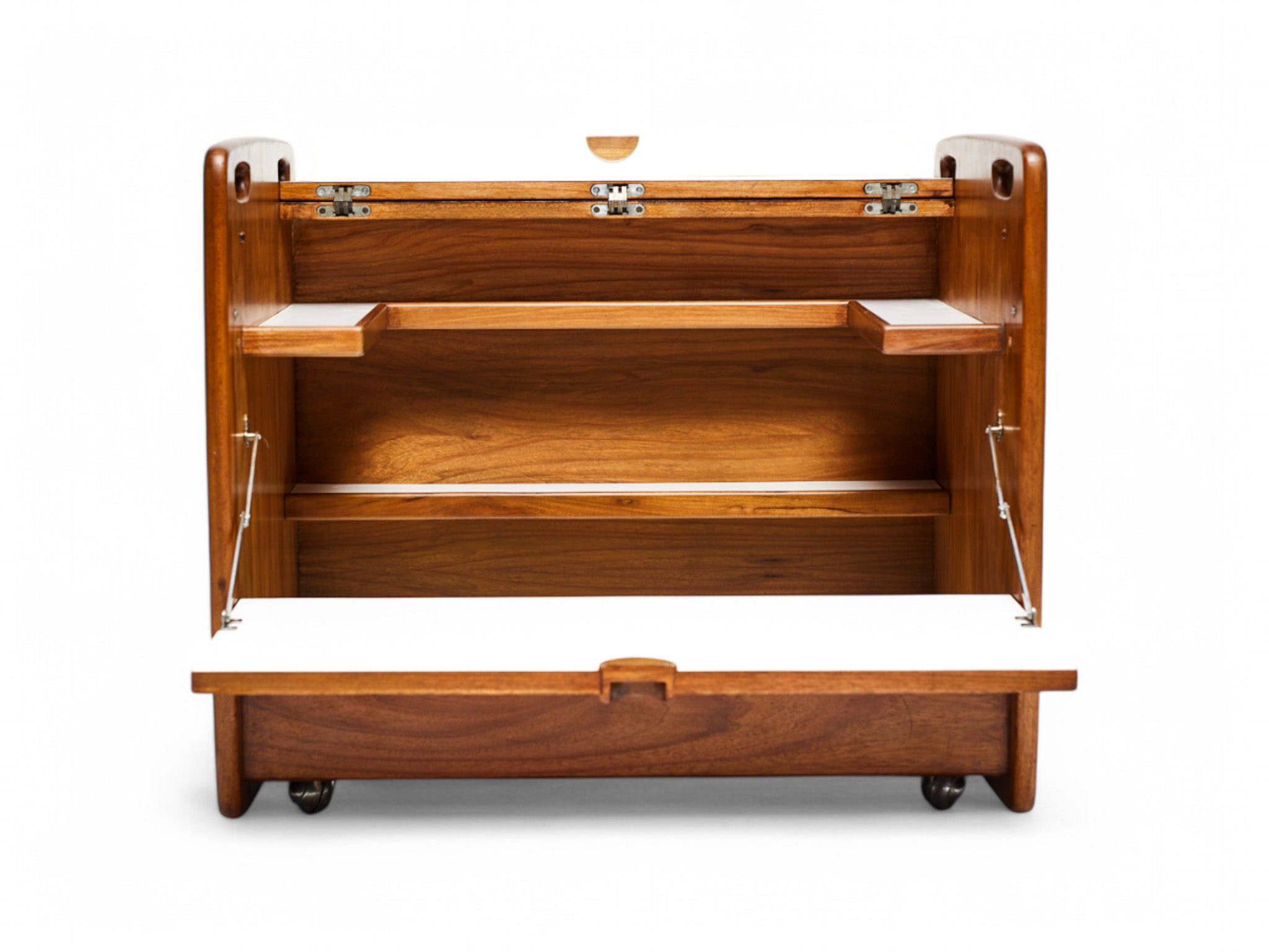 This mid-century modern bar cart is expertly crafted from Freijo hardwood, exhibiting two storage doors with two shelves and bottle holders, retaining its original four wheels. The wood has been refinished to maintain its excellent condition. The bar cart's exquisite design exudes elegance and innovation, enhancing any interior space. Celebrated for his unique and creative use of tropical wood, Sergio Rodrigues's legacy as one of Brazil's most iconic mid-century designers is reflected in this stunning piece.