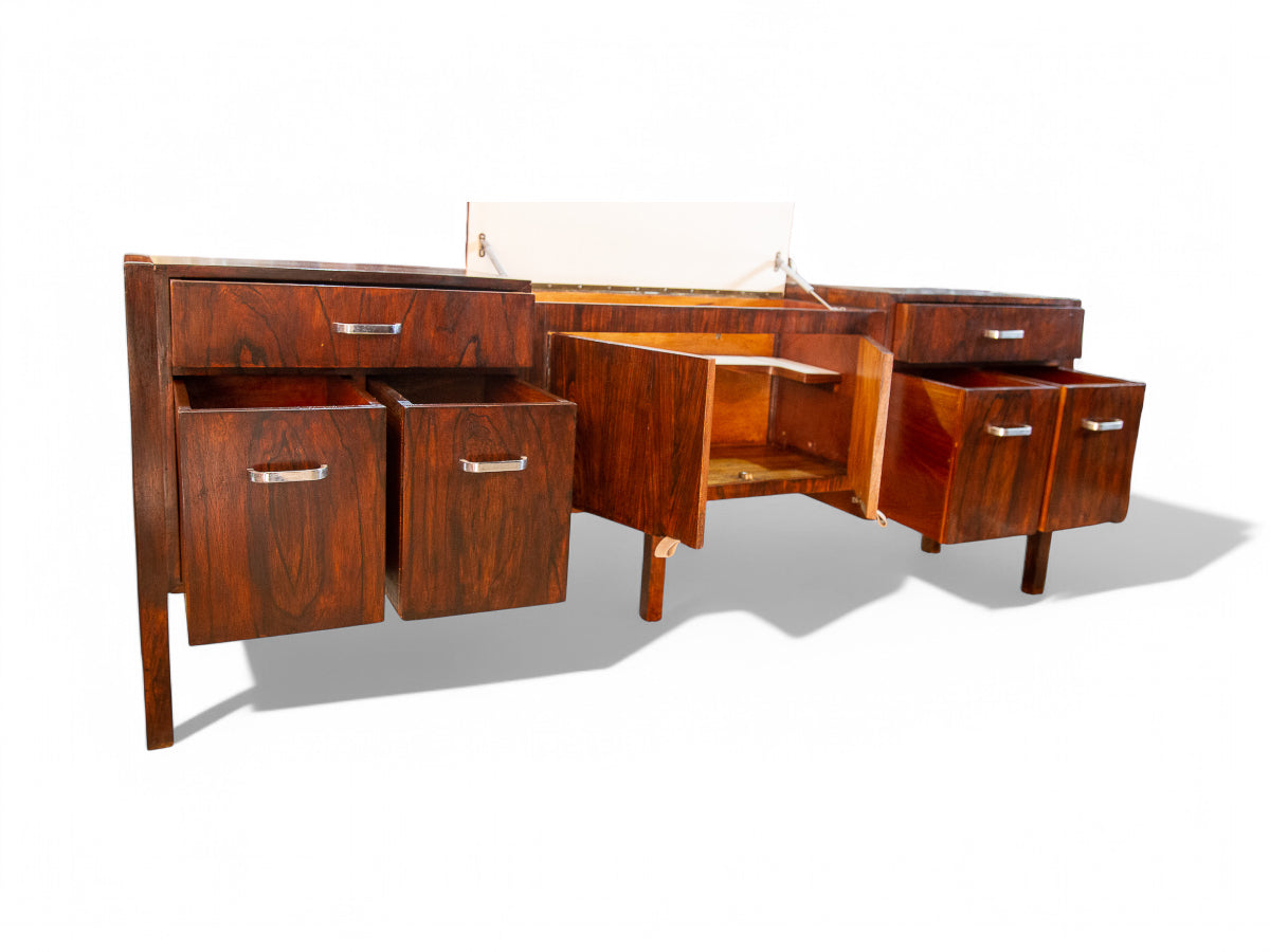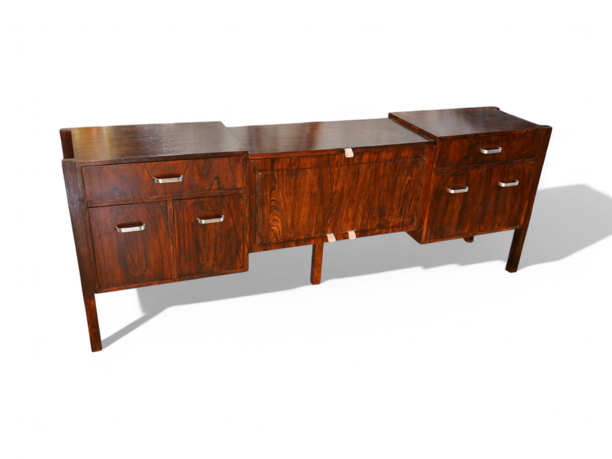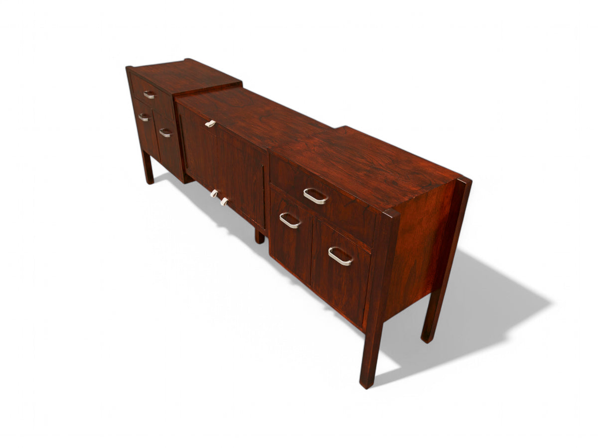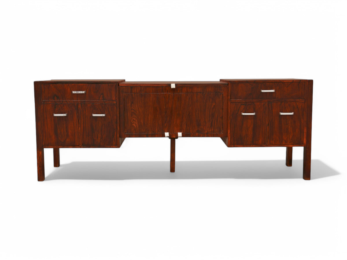 This credenza is crafted from Brazilian rosewood, also known as jacaranda, featuring seven drawers with metal handles. The design includes three pull-out drawers on both the right and left sides, with a lift-up chest-like drawer in the center. The drawers are particularly tall and deep drawers making it very convenient for storage.