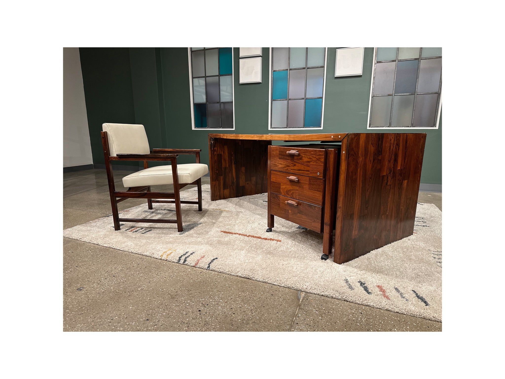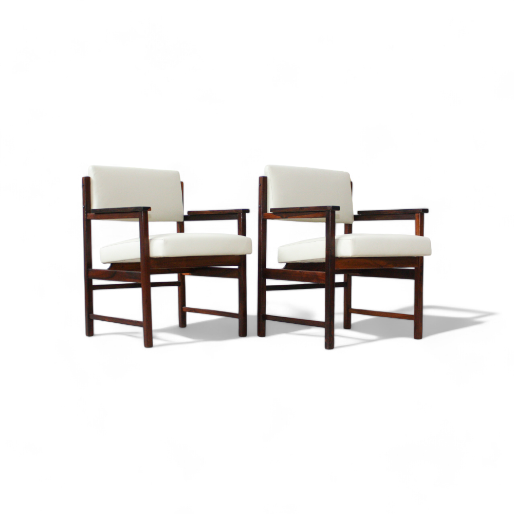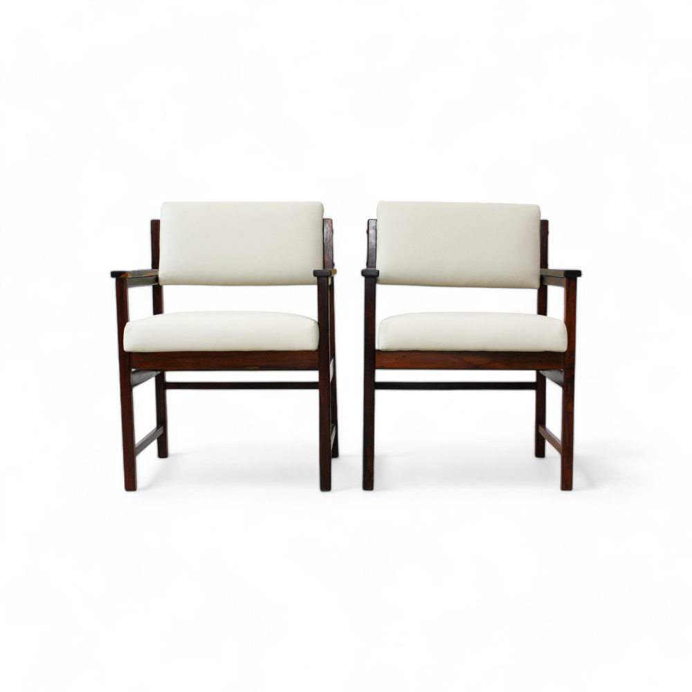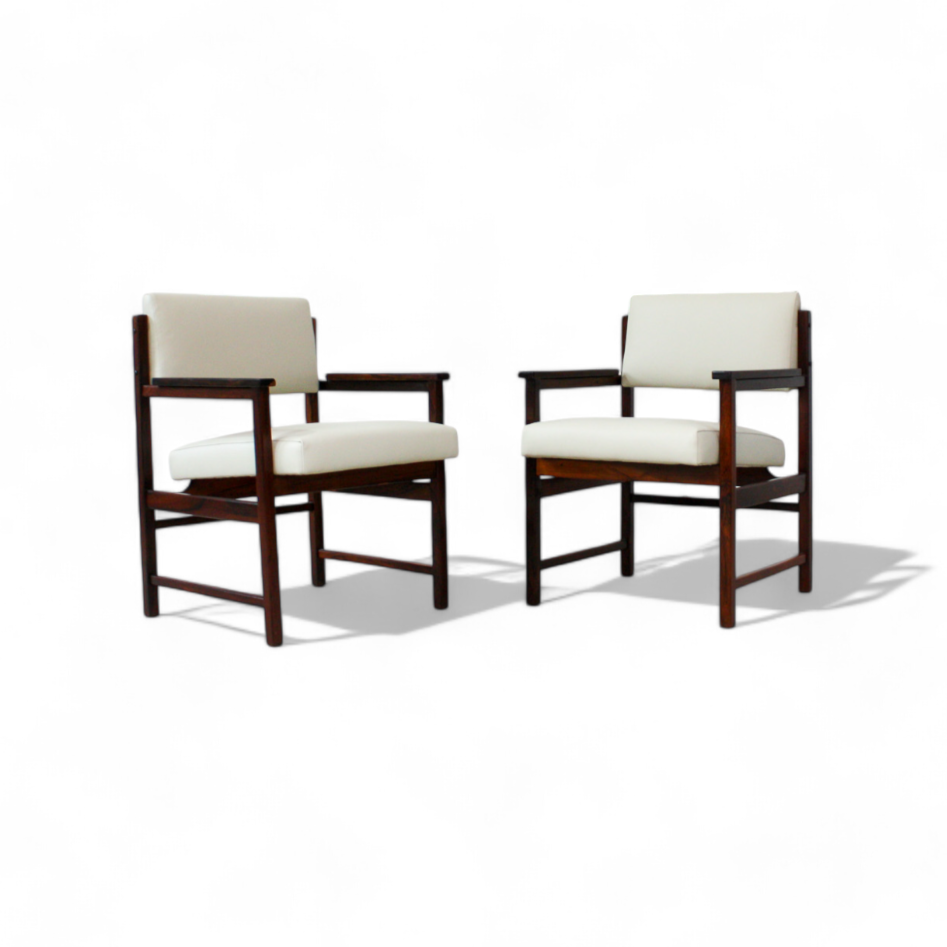 These two armchairs, crafted from hardwood and upholstered in beige leather, were originally owned by Infraero, the government institution responsible for airports in Brazil. If you're searching for a unique and historically significant piece, look no further. Produced by Bureau Moveis, this set exemplifies the outstanding design and craftsmanship of 1960s Brazil.