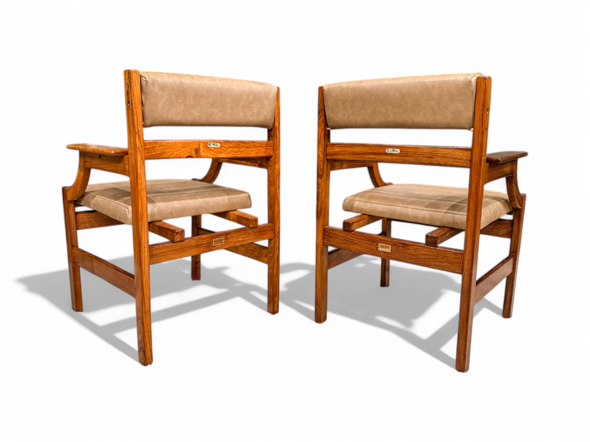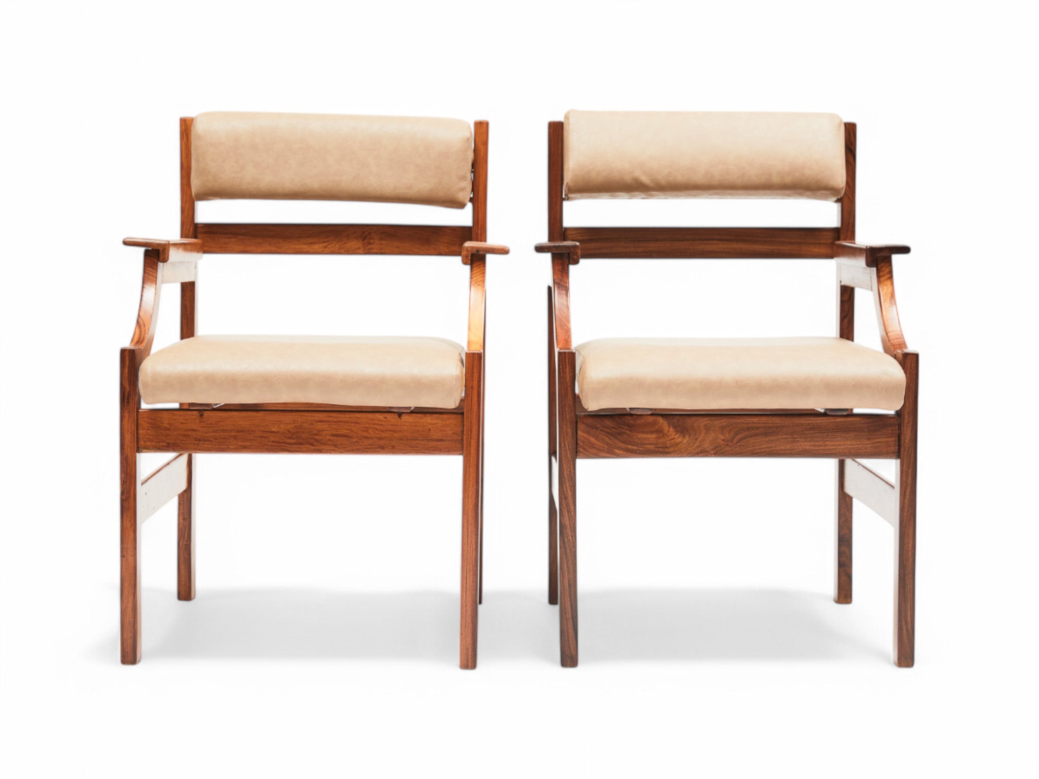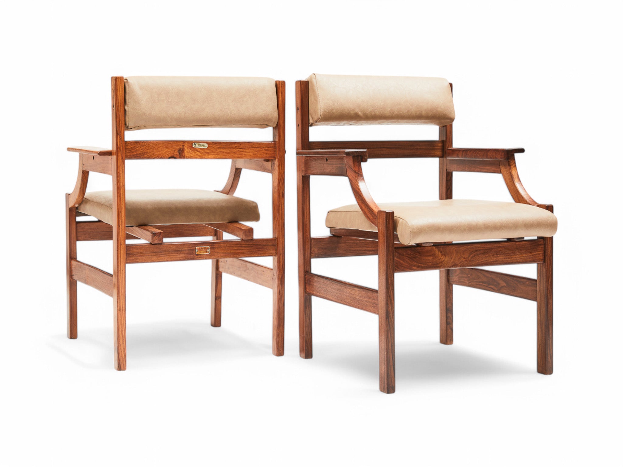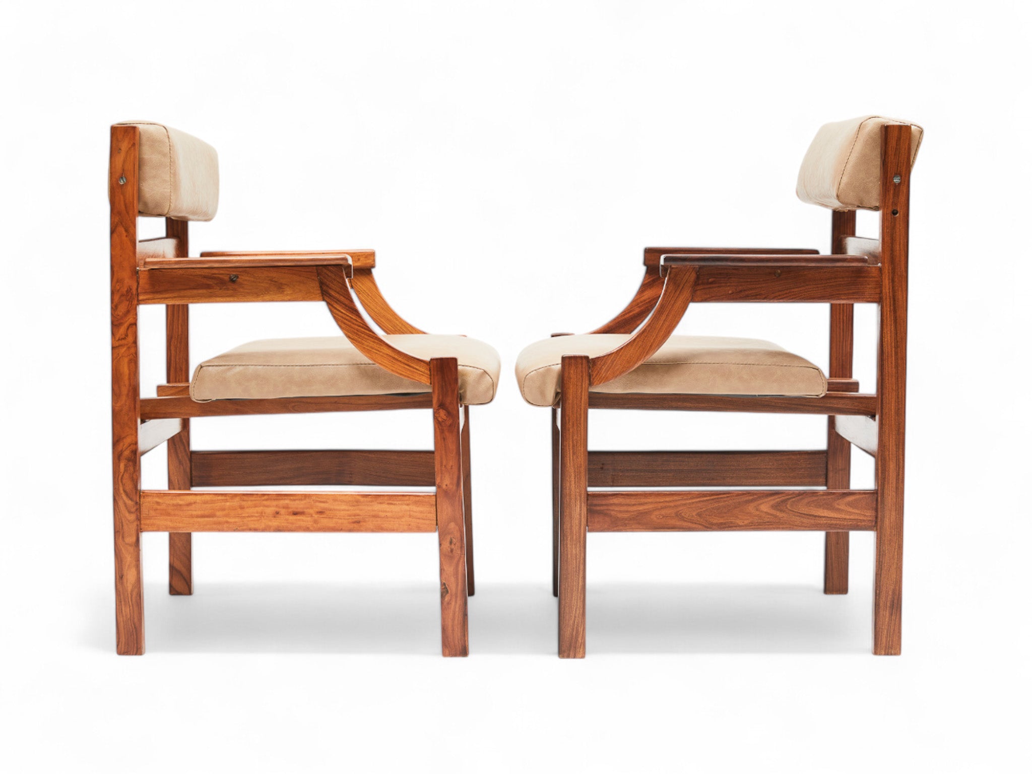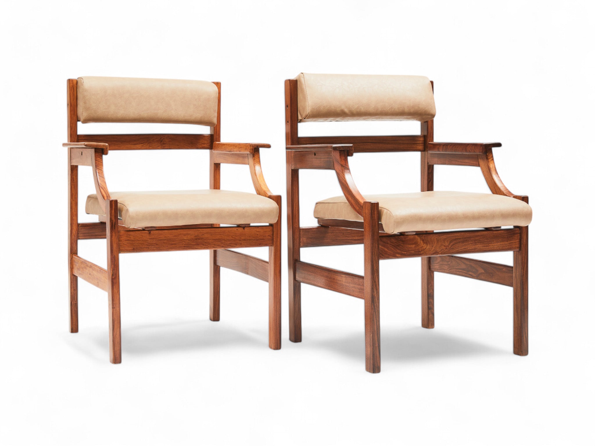These armchairs embody the essence of the Brazilian modernist movement and the architects commissioned to furnish Brazil’s new capital, Brasilia, in 1960. Originally owned by Infraero, the government organization responsible for Brazil's airports, they feature a caviuna hardwood frame with seats and backrests upholstered in beige faux leather. The seats are generously wide, and the backrest cushions can be adjusted to an angle for enhanced comfort.