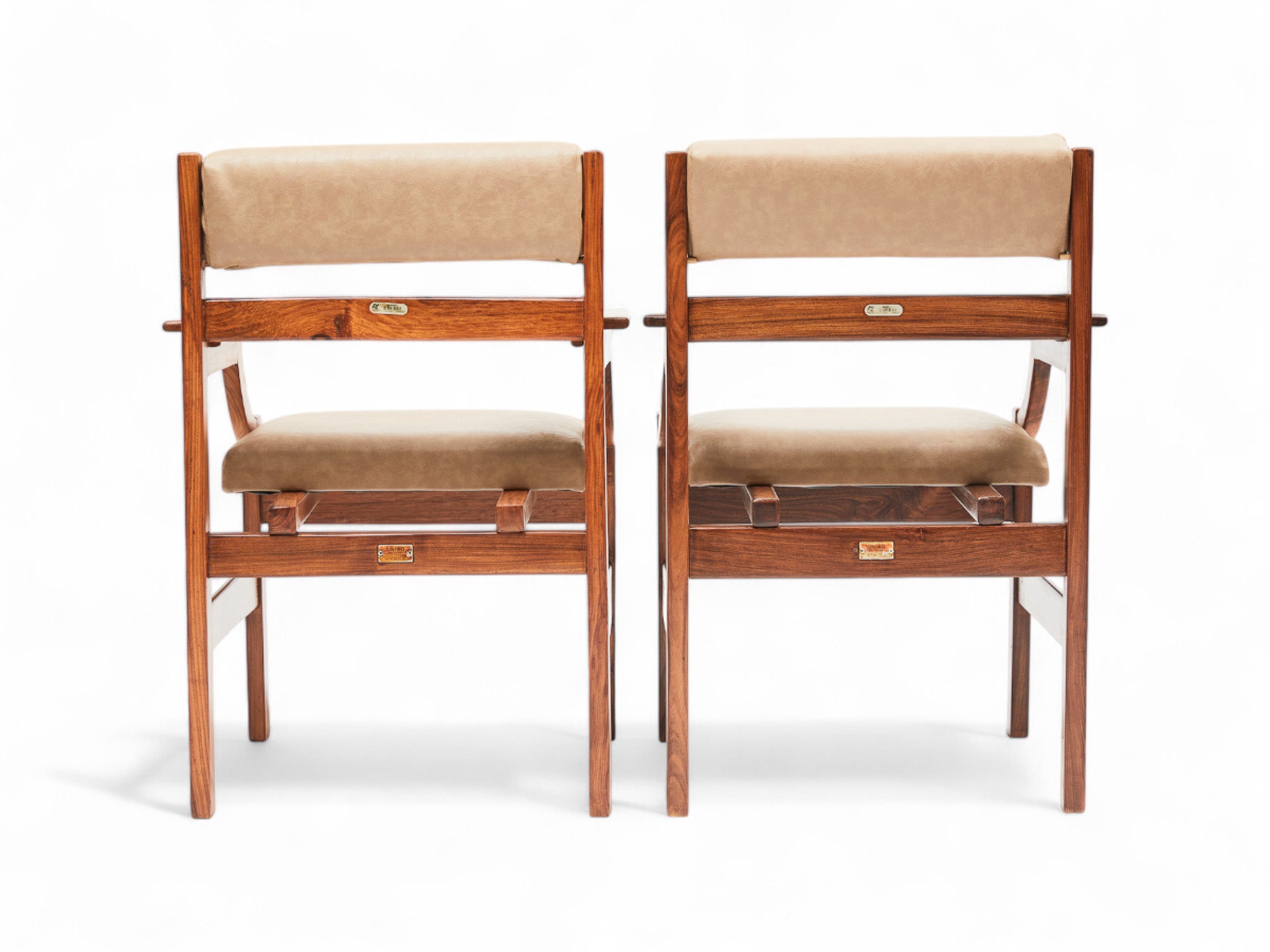 The wood has been refinished to highlight its vibrant veins, and despite showing signs of age that add character, the armchairs remain in excellent condition. Each chair bears a manufacturing seal located on its back.