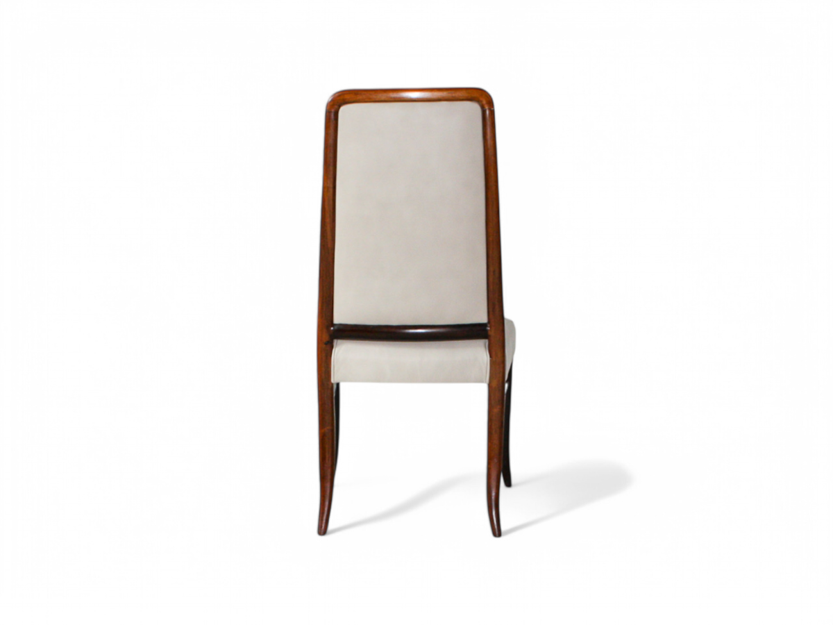 Each chair features a solid Brazilian Rosewood structure upholstered in beige Italian leather. The legs and backrest are delicately curved, providing both elegance and comfort. The woodwork is absolutely stunning, characteristic of Joaquim Tenreiro's craftsmanship. This set was designed specifically for Bloch Editors, a prominent Brazilian publishing and broadcasting conglomerate. Sergio Rodrigues and Joaquim Tenreiro were commissioned to create modern furniture for Bloch’s headquarters in Sao Paulo, and these chairs originally adorned the conference rooms.
