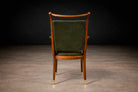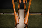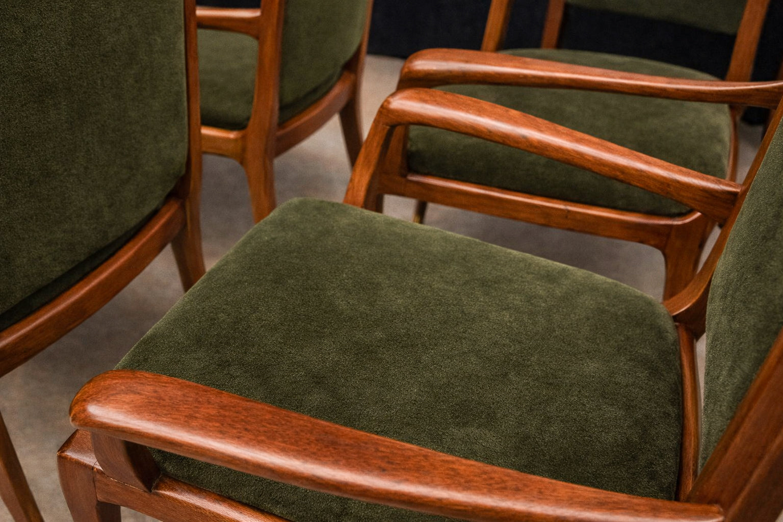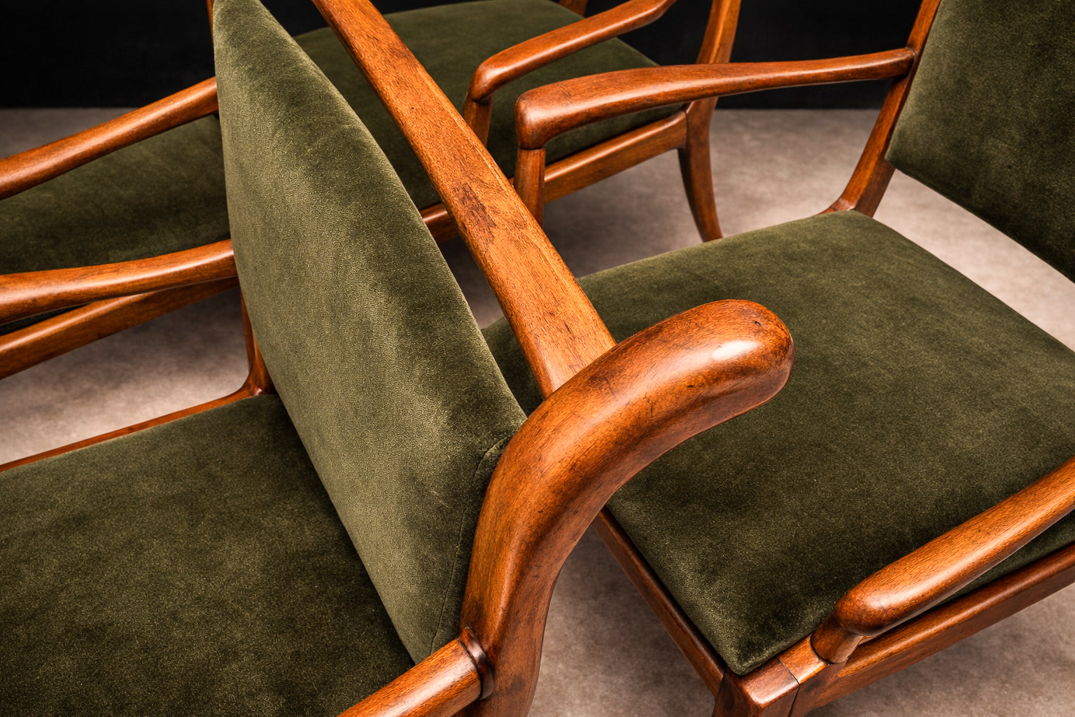 Newly upholstered in deep olive green cotton mohair velvet, the seats and backs introduce a luxurious tactile contrast to the warmth of the wood. The textile features a dense short pile with directional nap and matte sheen, creating nuanced tonal shifts across the surface—ranging from forest olive to darker moss hues depending on the light. This restrained yet sophisticated palette reinforces the sculptural quality of the frames while remaining faithful to the refined material sensibilities of mid-century Brazilian interiors.