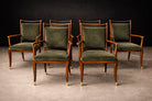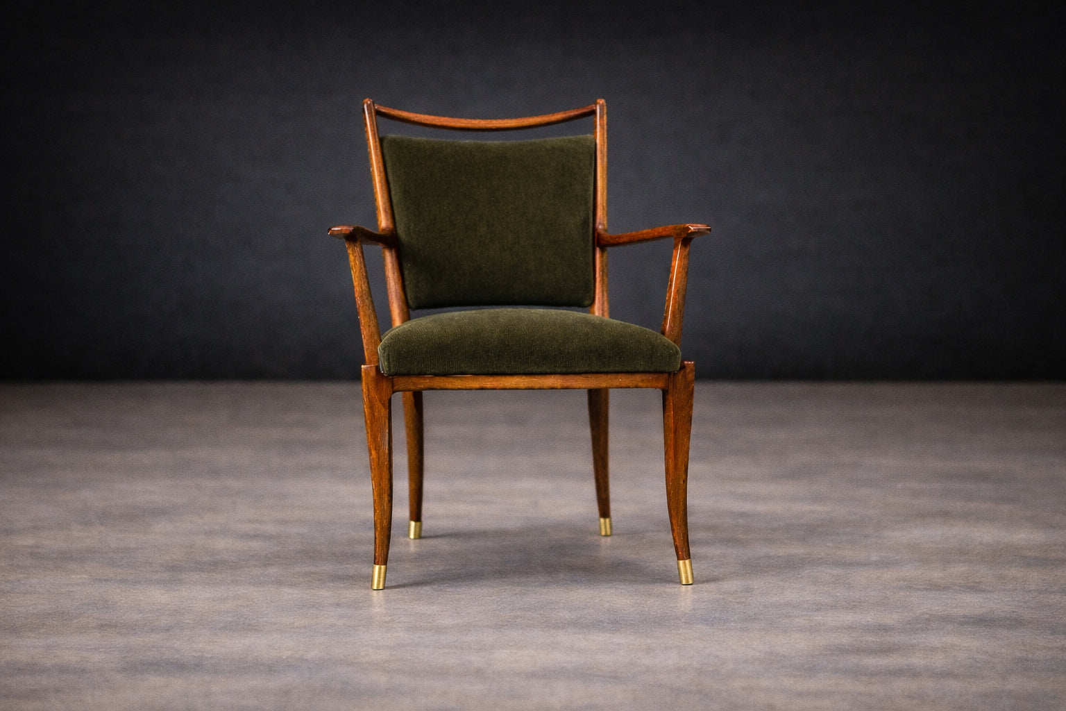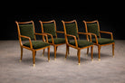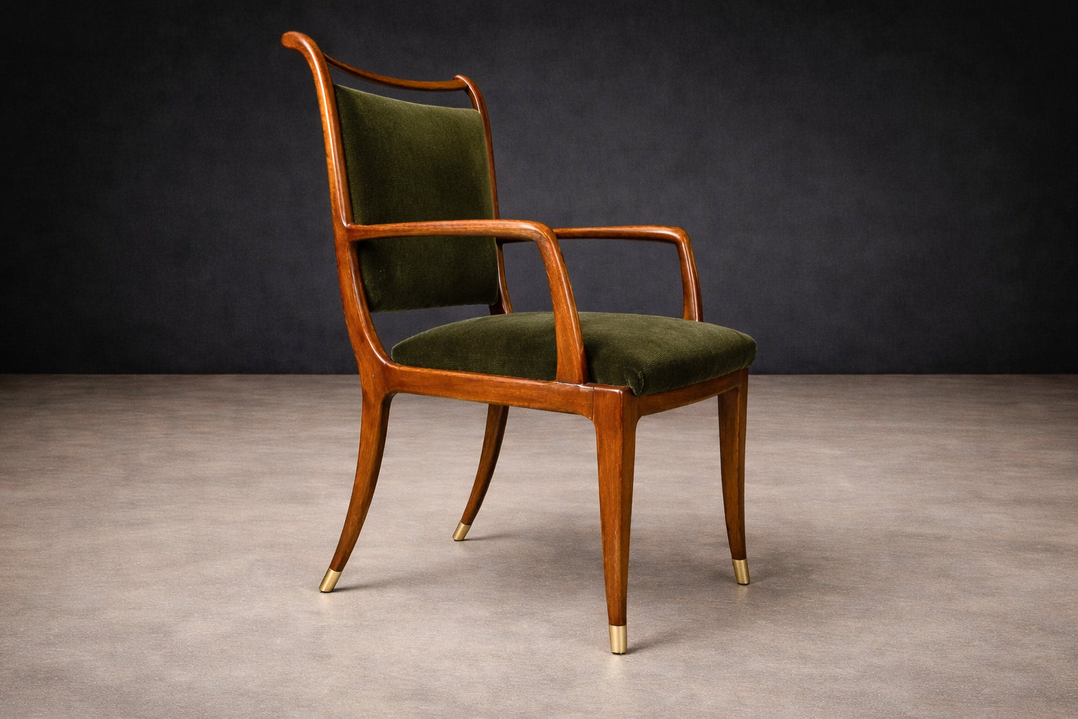 The silhouettes demonstrate Scapinelli’s signature sense of movement: gently tapered legs, sculpted arm supports, and subtly arched back rails that give the chairs a poised, almost architectural rhythm when viewed together. Brass sabots complete the composition, adding a refined accent at the base while protecting the legs.