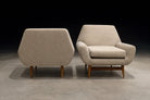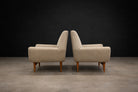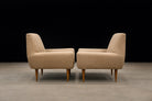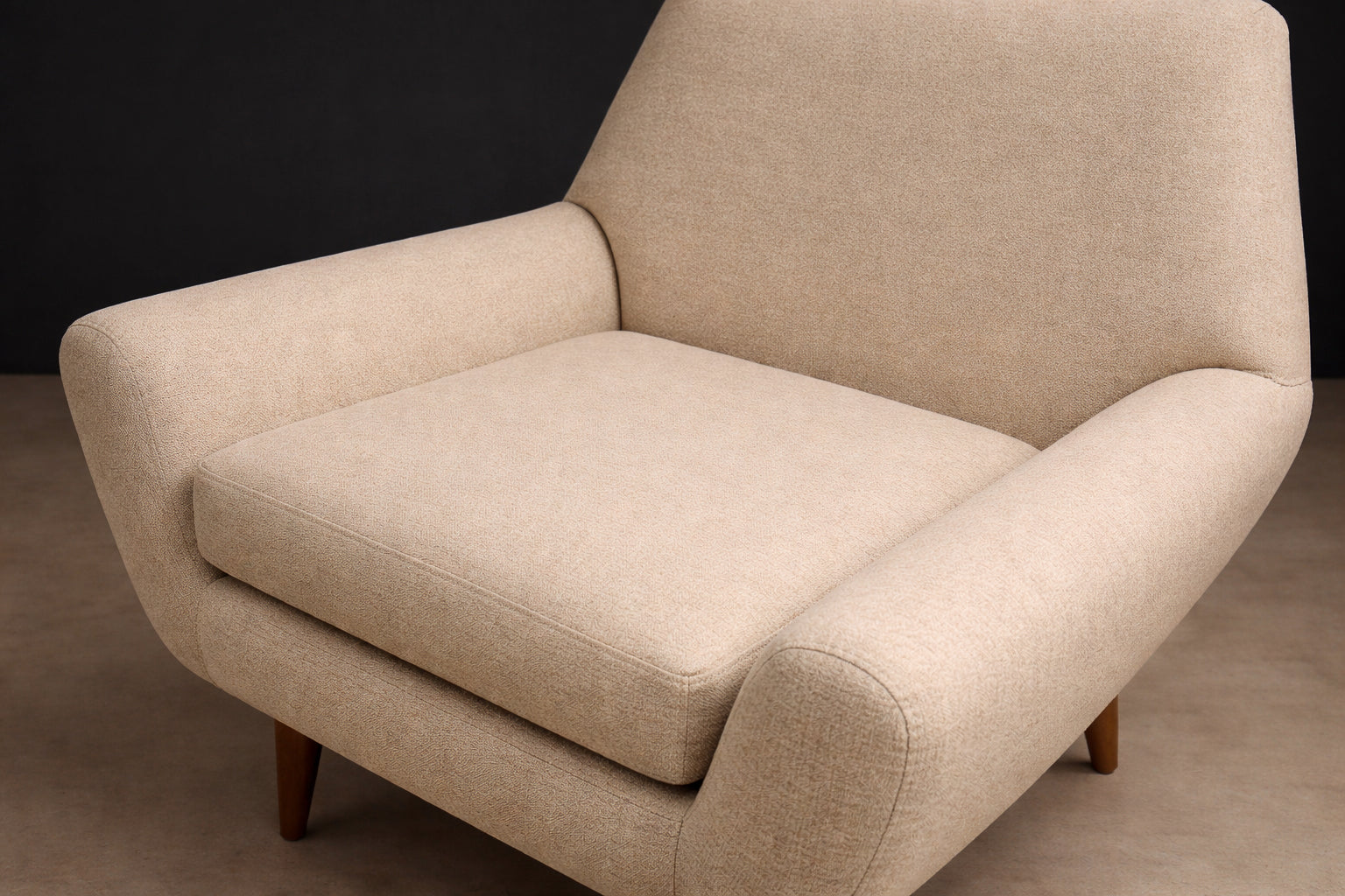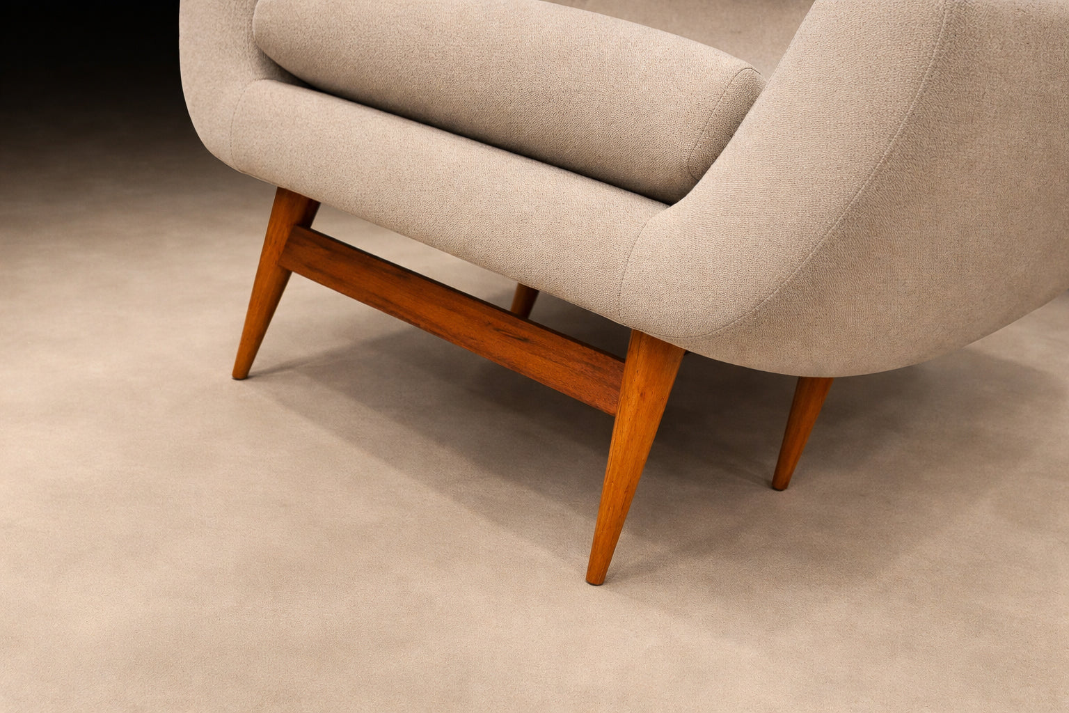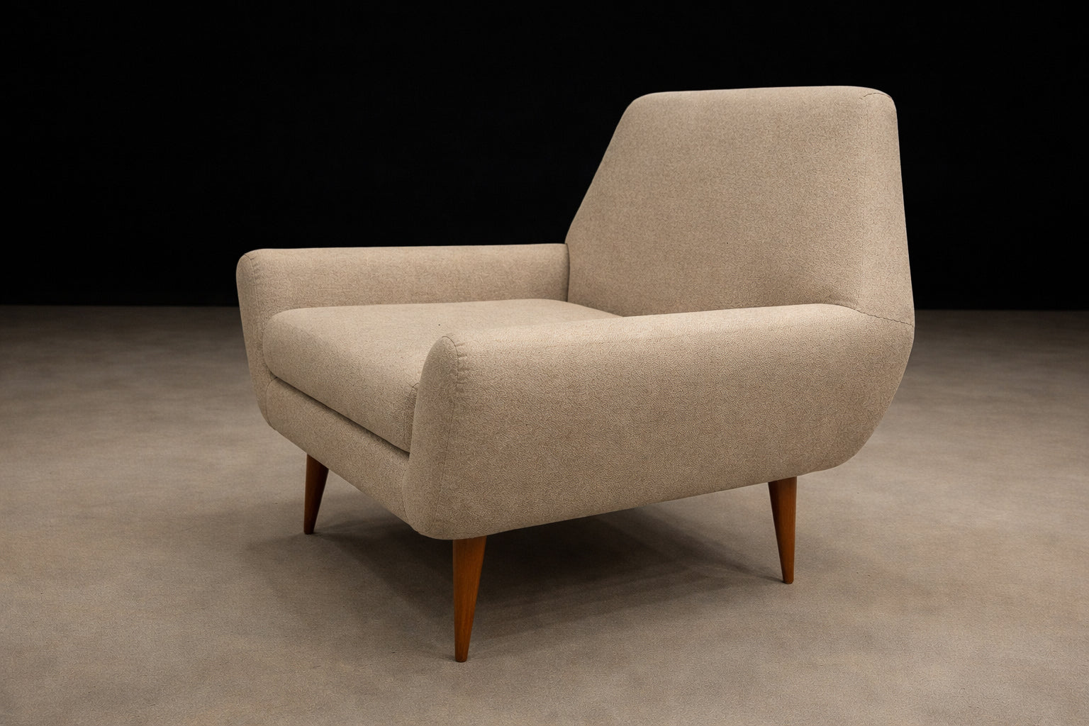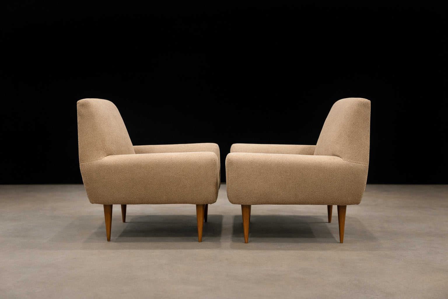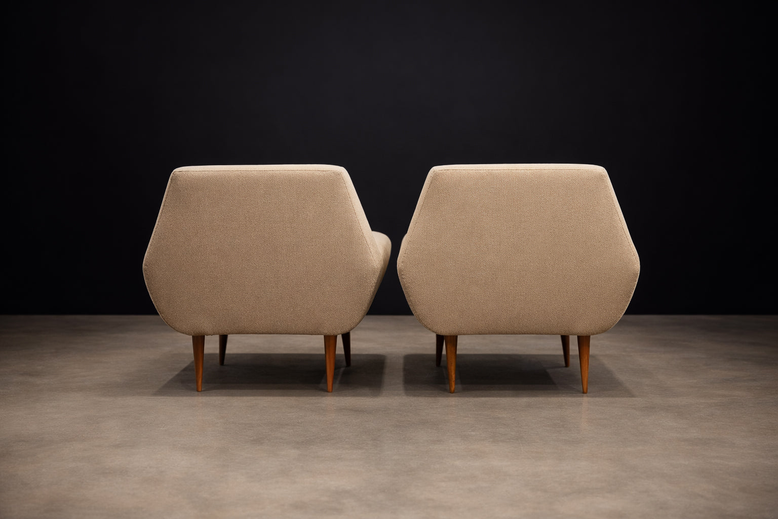 The design balances comfort and structure through a generously proportioned seat and gently inclined backrest supported by a compact architectural frame. Subtle curves along the armrests soften the geometry, while slender tapered legs introduce visual lightness and rhythm. The chairs’ silhouettes reflect the elegant proportions associated with the golden period of Brazilian mid-century design.