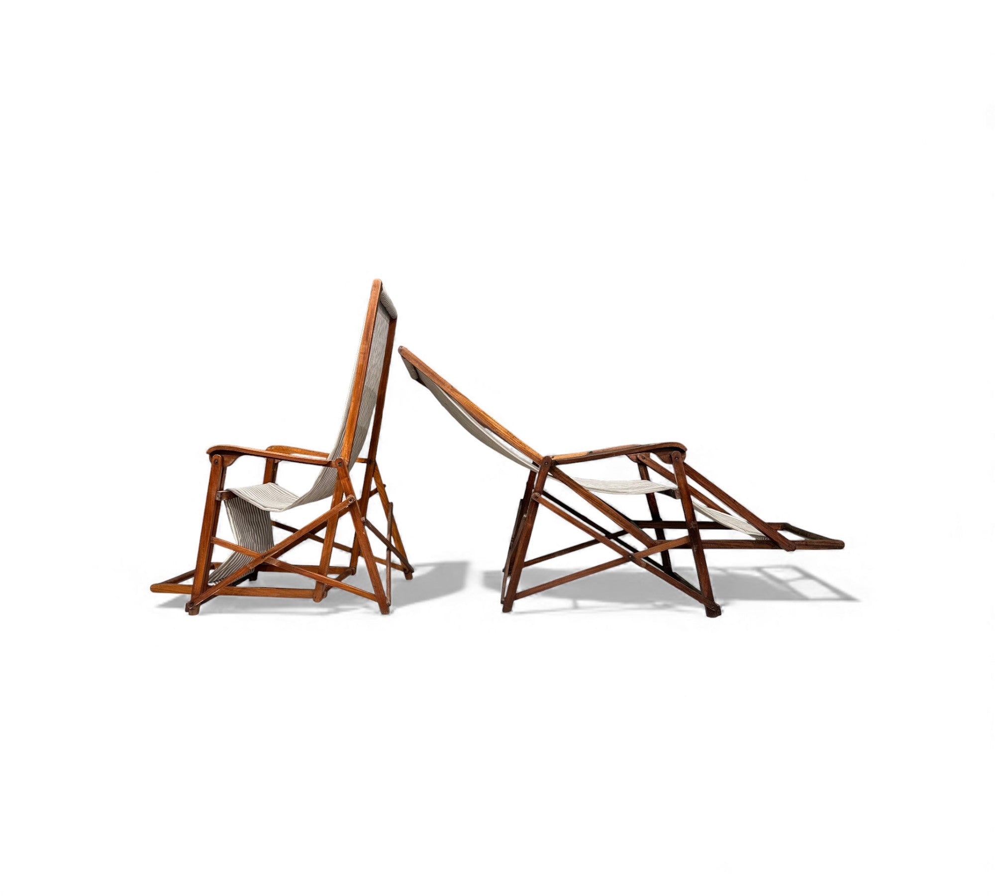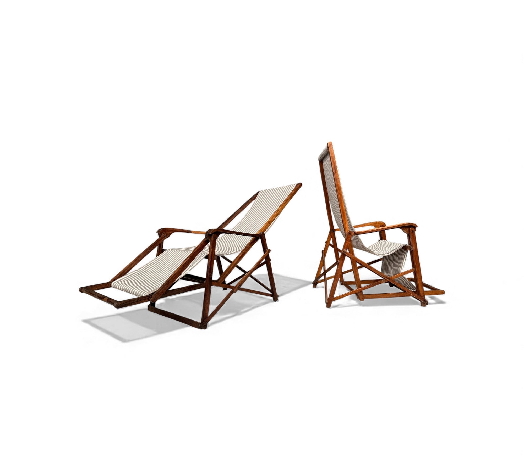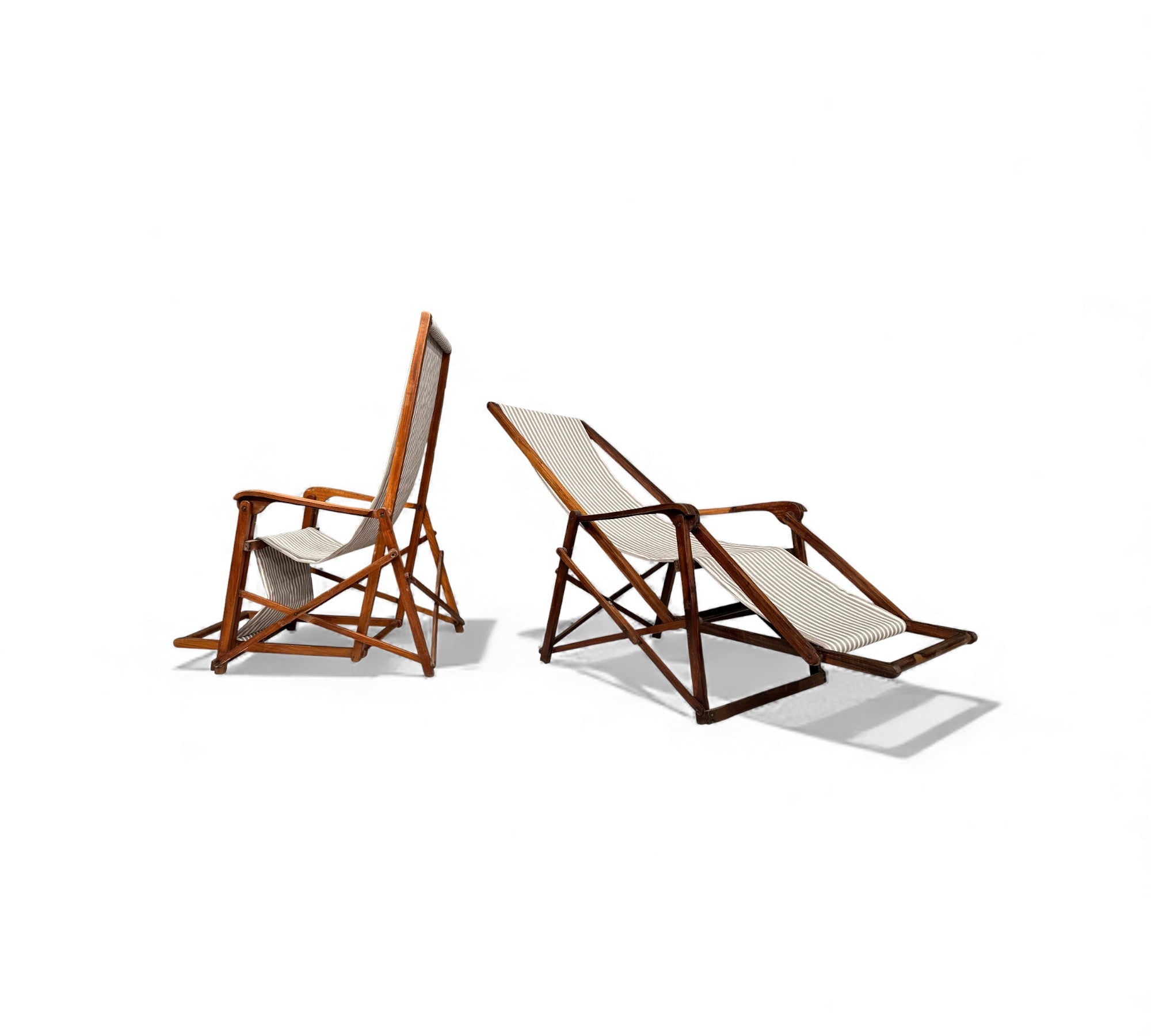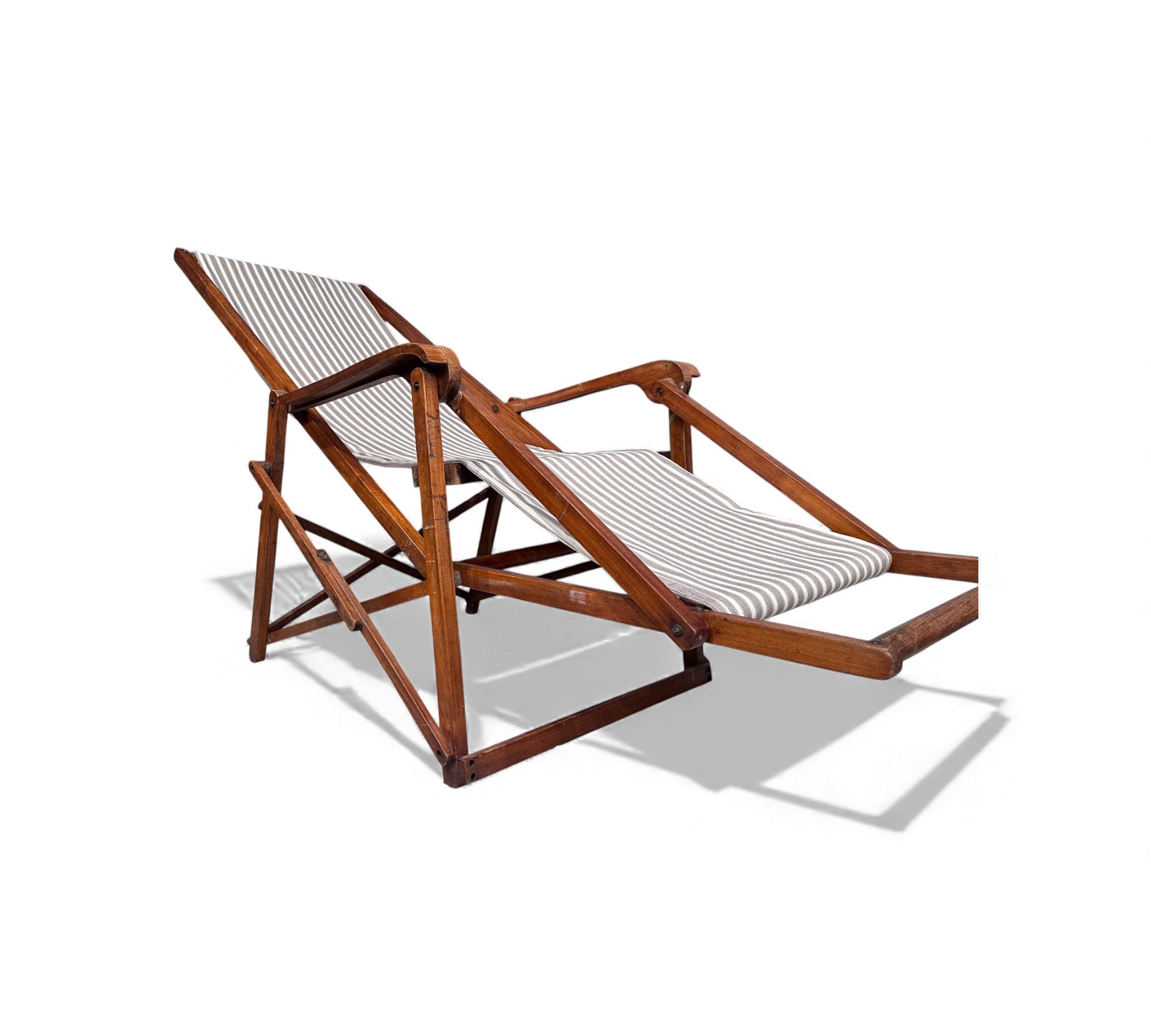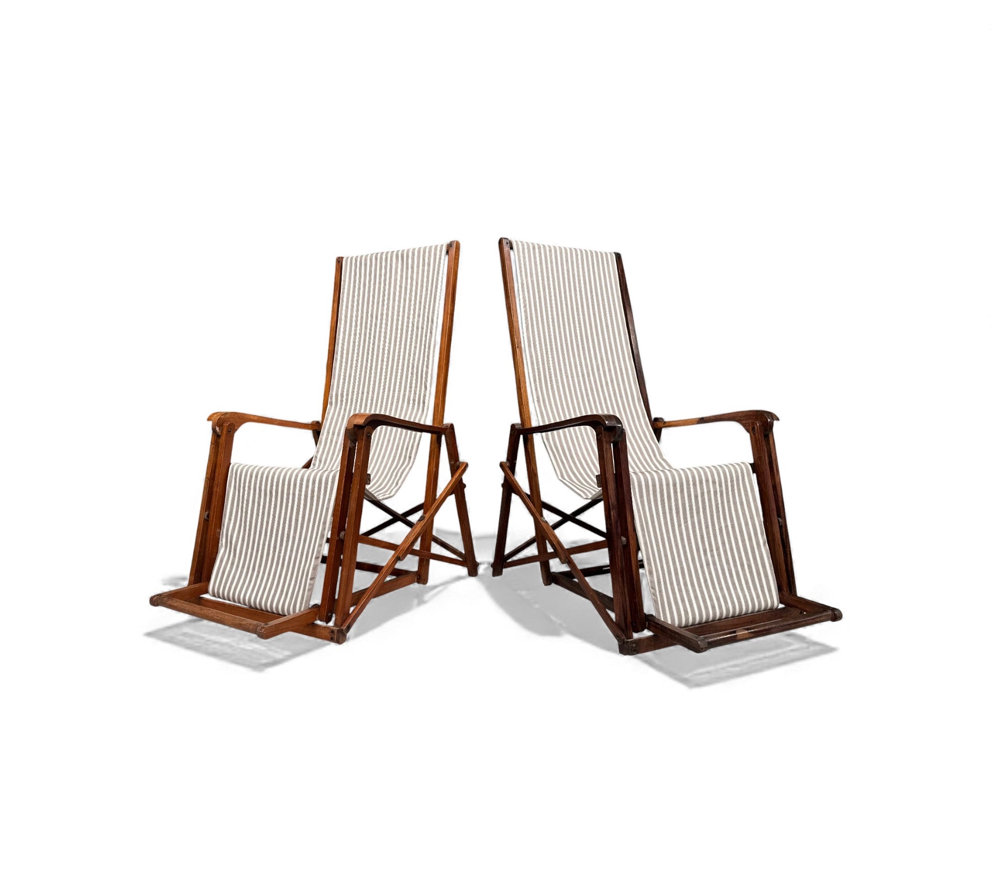 The wood of these chaise lounges has been meticulously restored and is in excellent condition, showcasing its original beauty. They are now upholstered in new outdoor fabric, enhancing their durability and suitability for contemporary use while preserving their historical significance.