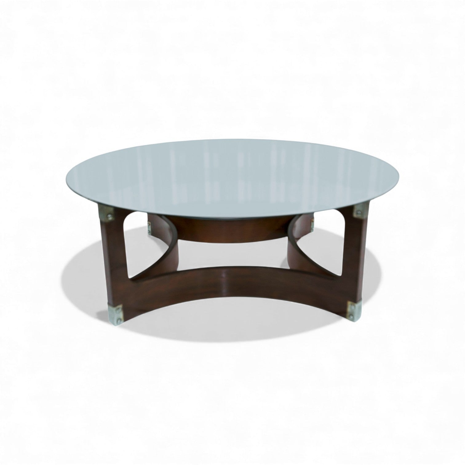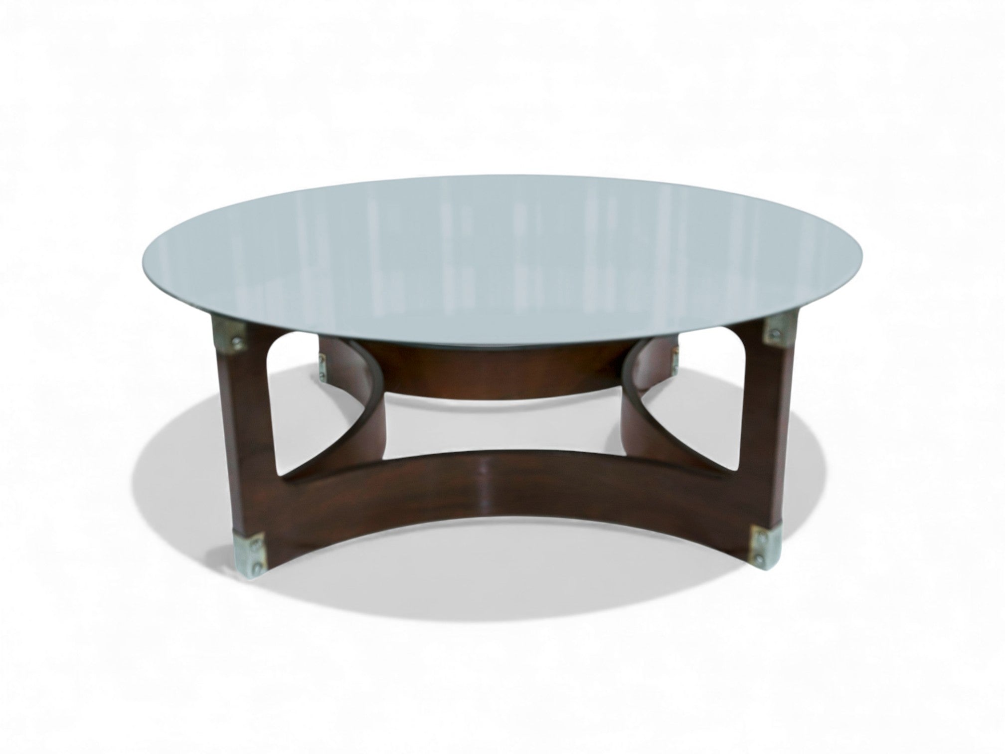 Crafted in the 1960s by São Paulo–based Novo Rumo, this round coffee table features a beautifully bent rosewood (jacarandá) base that showcases the expressive grain and warm tonal variation of the wood. Expertly refinished, the structure is in excellent condition. A sleek glass top, secured by chromed metal accents, provides a crisp modern contrast while allowing unobstructed views of the sculptural wood frame.