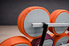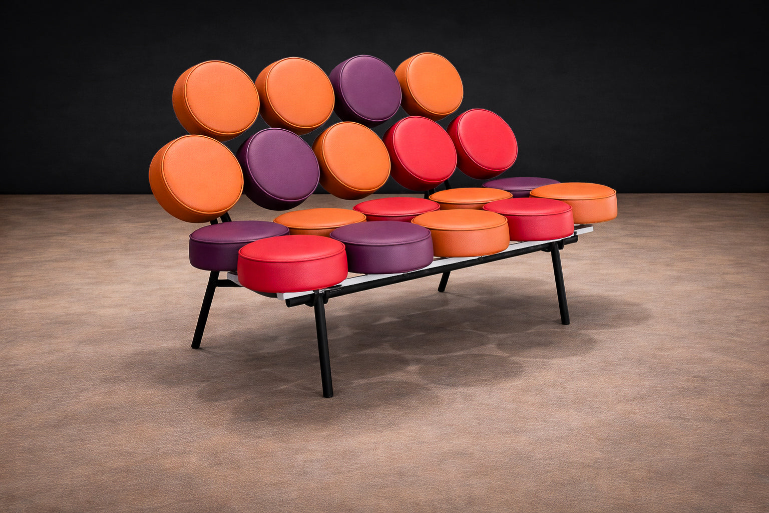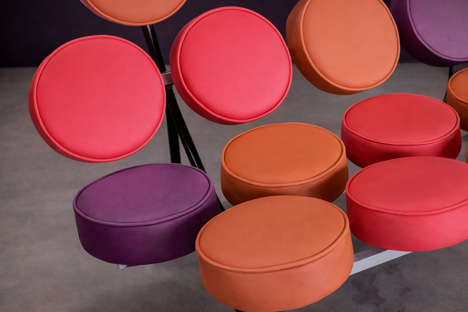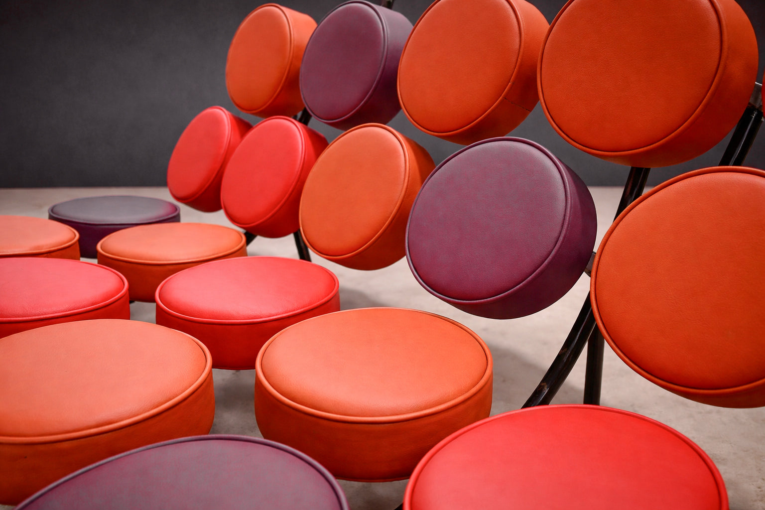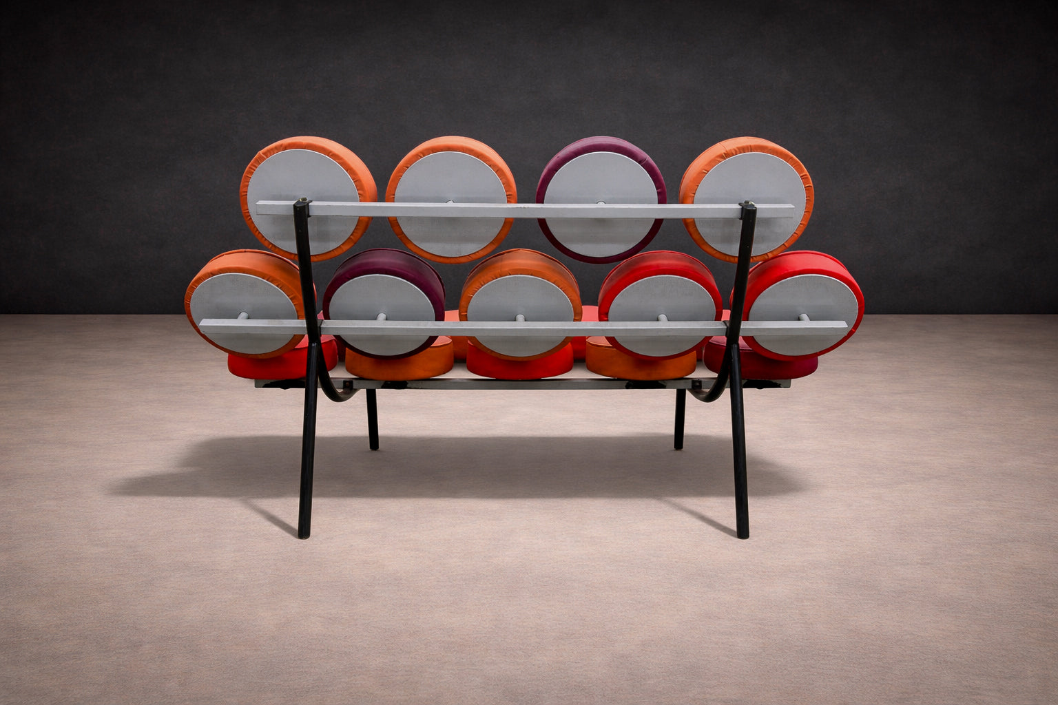 The frame is made from welded steel, providing the structure that supports the discs while keeping the form lightweight and open. This use of steel paired with repeated upholstered elements represents a shift toward industrial materials and experimental forms in American furniture of the time.