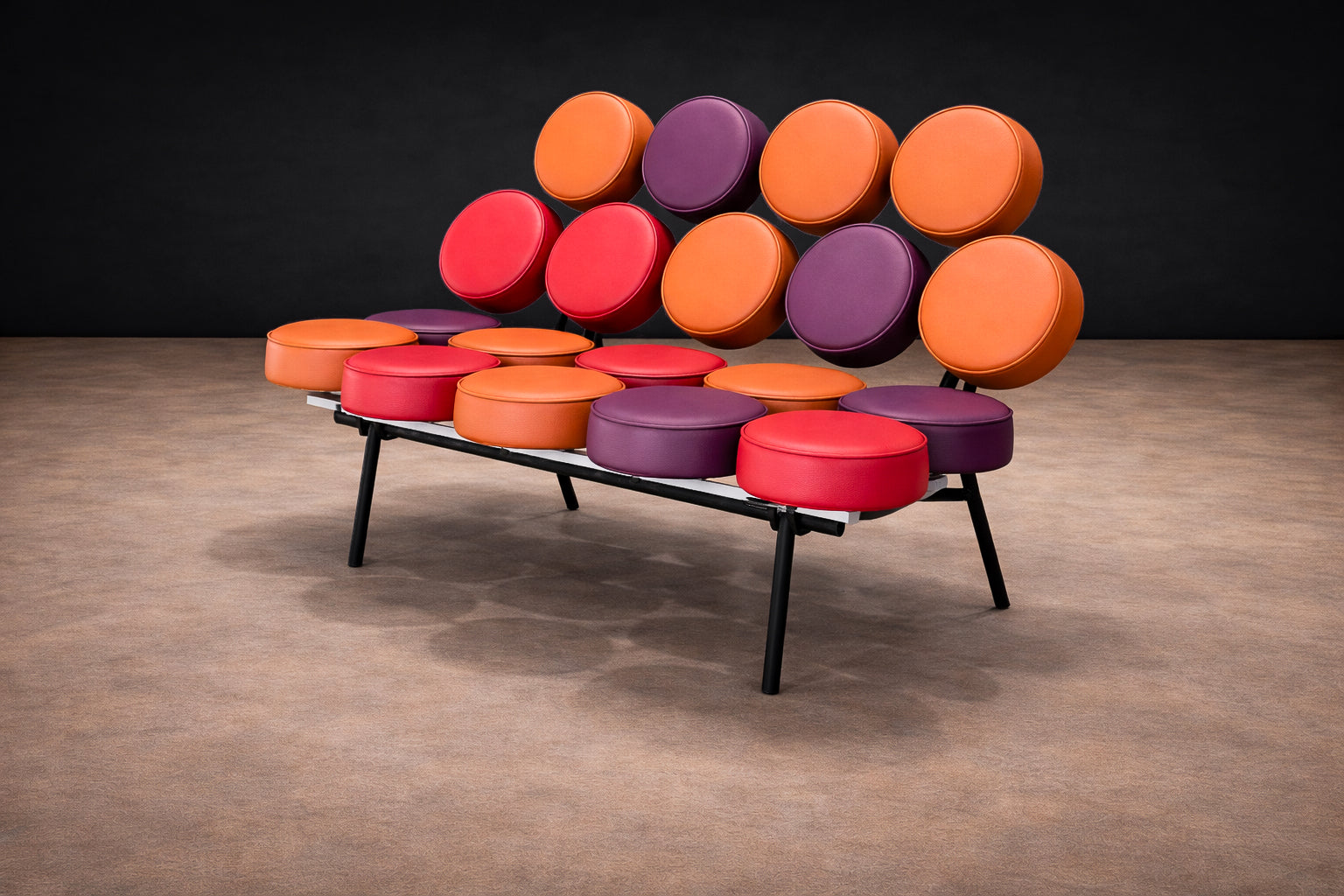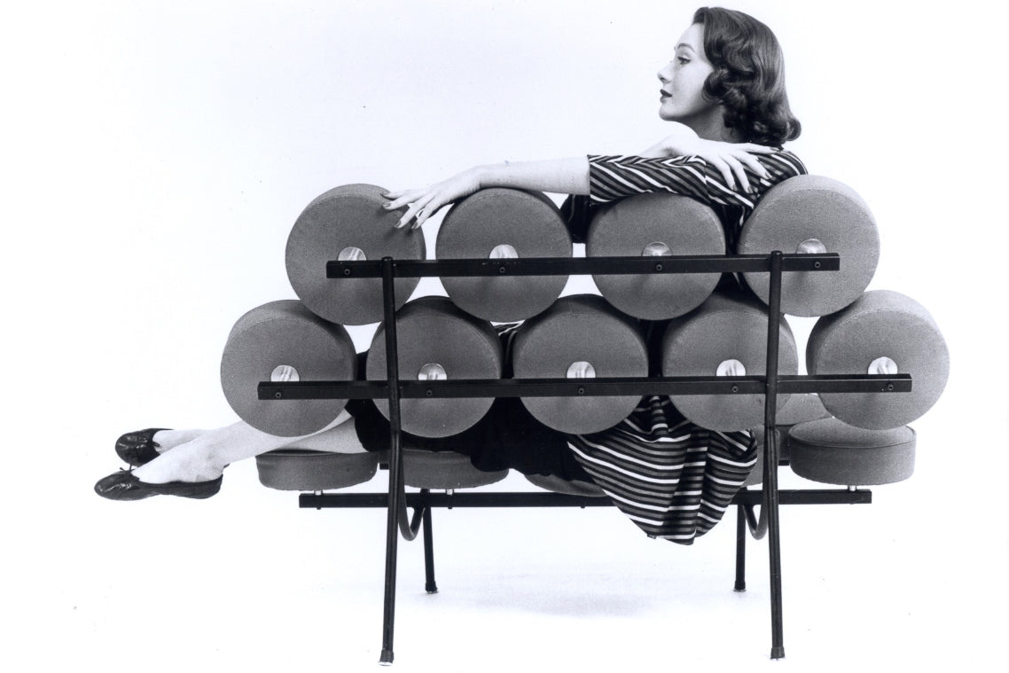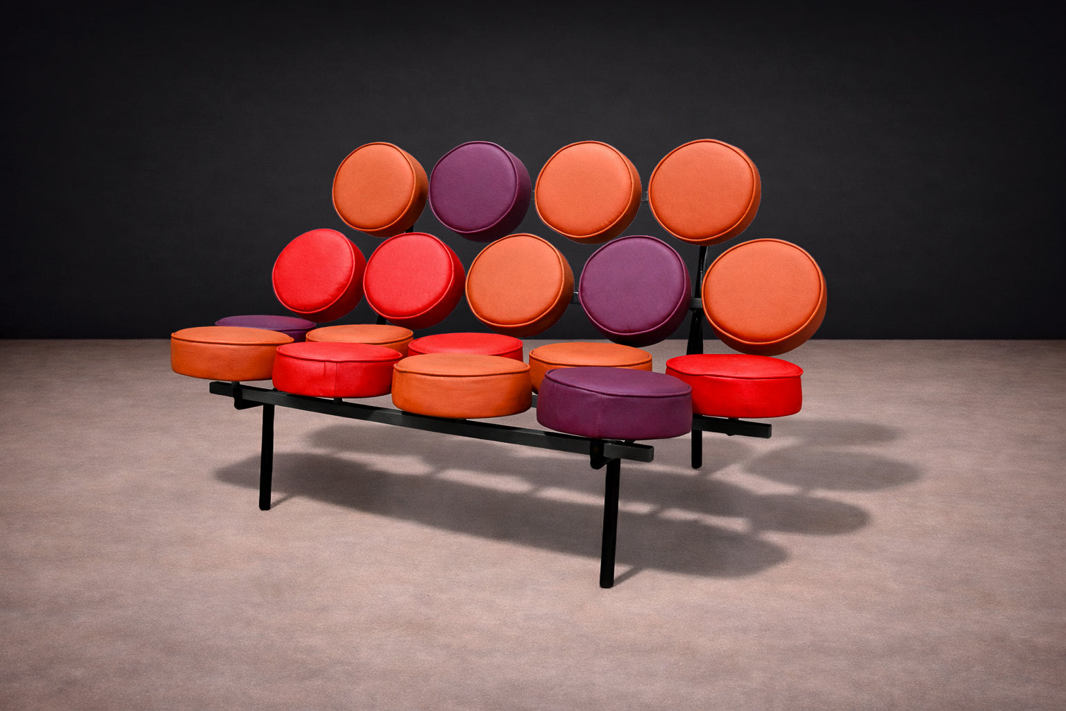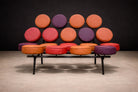 Designed by George Nelson and Irving Harper in 1956, the Marshmallow Sofa is known for its construction of individual, circular upholstered discs mounted on a steel frame. The discs sit in evenly spaced rows, creating the recognizable “marshmallow” appearance. Each disc is a separate upholstered unit, a modular approach that was unusual for the period and allowed for different color combinations and straightforward replacement.