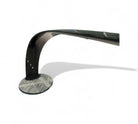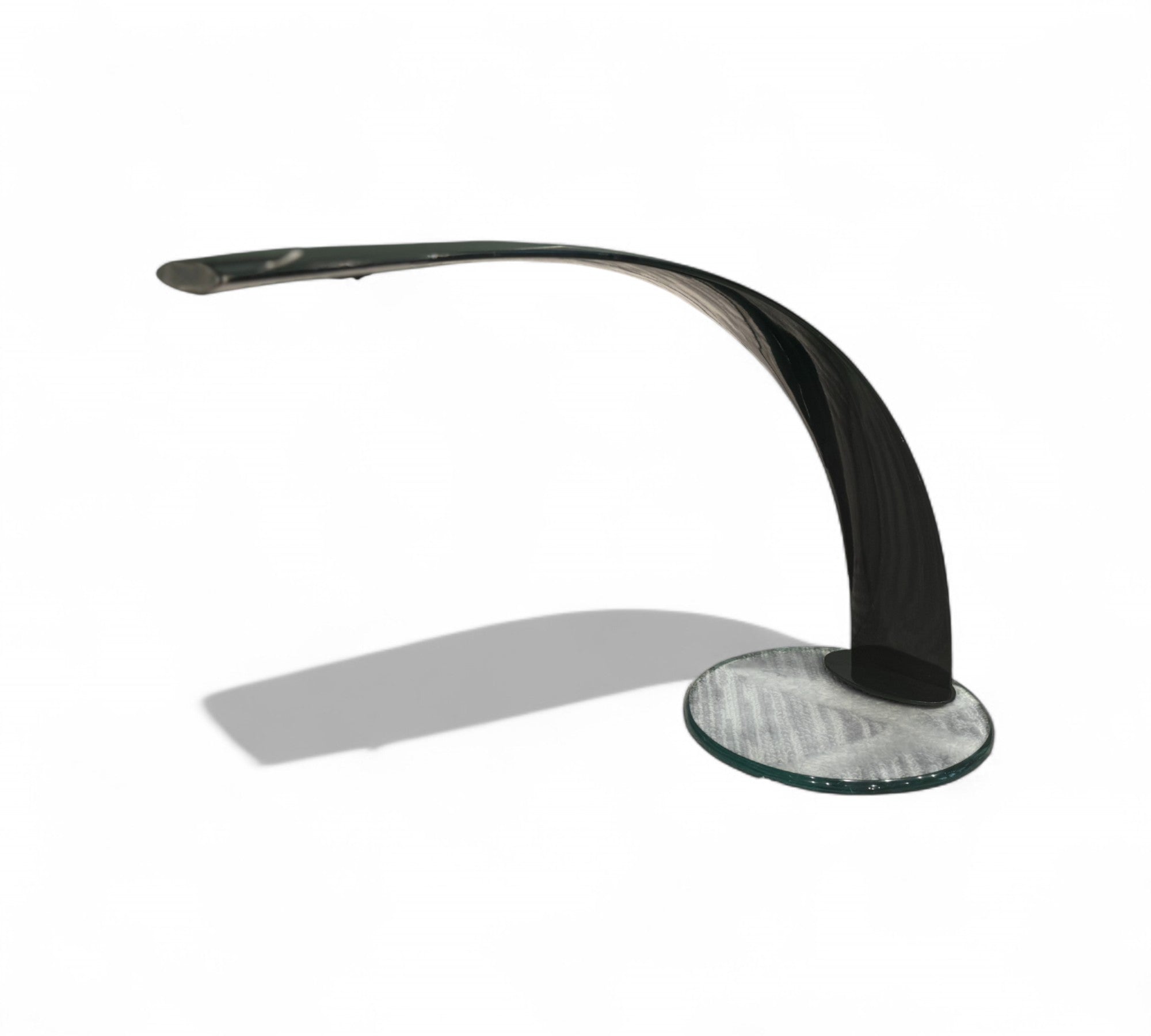 This modern desk lamp showcases a refined minimalist aesthetic, highlighted by its elegantly curved silhouette and glossy black finish. The lamp features a gracefully arched neck that extends from a sleek, circular glass base, providing both visual balance and a stable foundation. Recently rewired for safety and longevity, it now includes a durable braided power cord and a black power adapter, blending contemporary convenience and safety with timeless design.