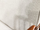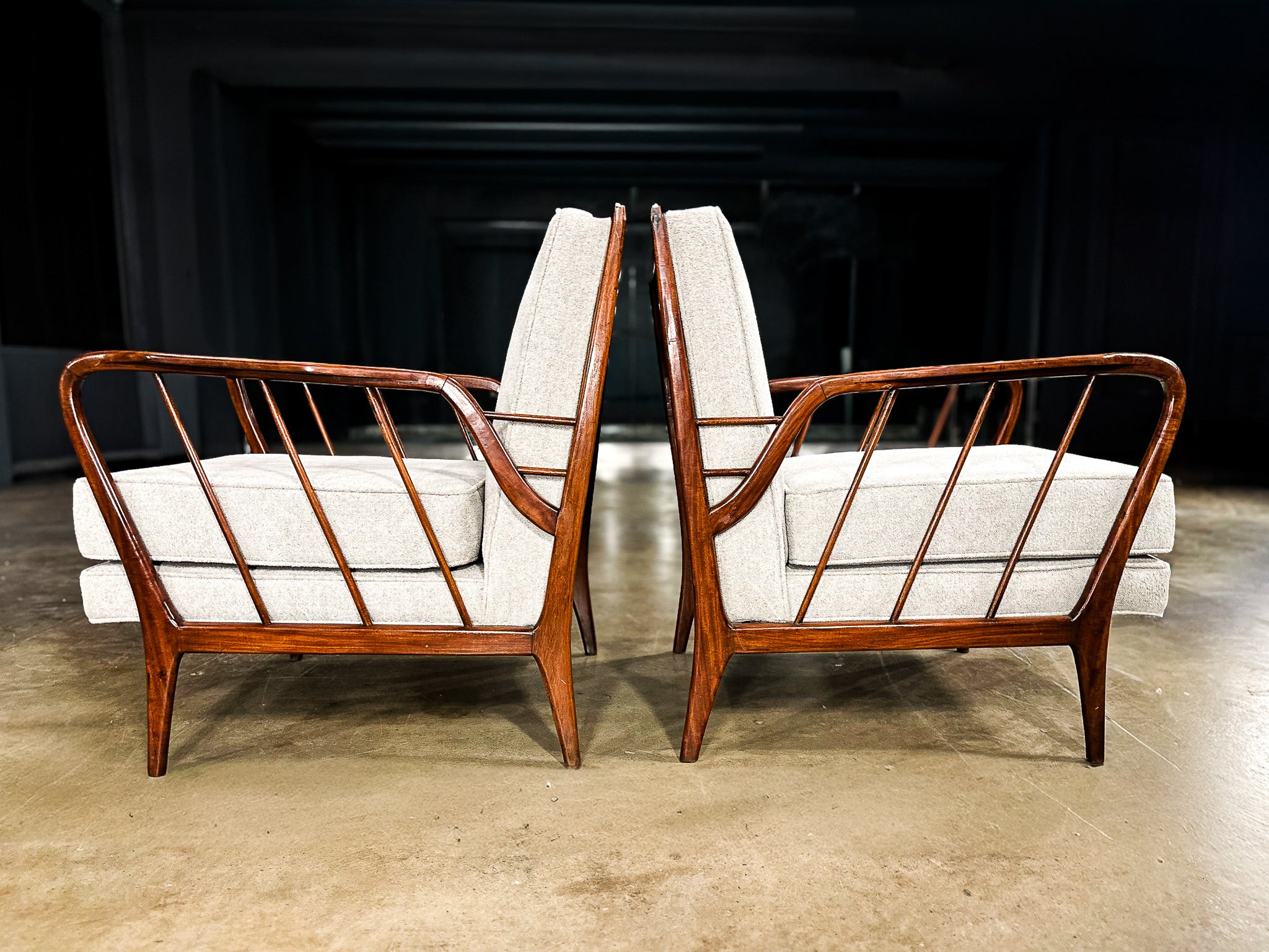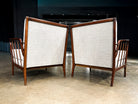 The chairs feature sculptural solid wood frames, carefully shaped to create a light yet architectural silhouette. Slender, angled legs and gently curved armrests lend the composition both visual tension and balance, while the exposed joinery underscores the rigor and precision of Levi’s design approach. Newly upholstered cushions introduce softness and comfort, offering a tactile contrast to the warm, expressive wood grain.