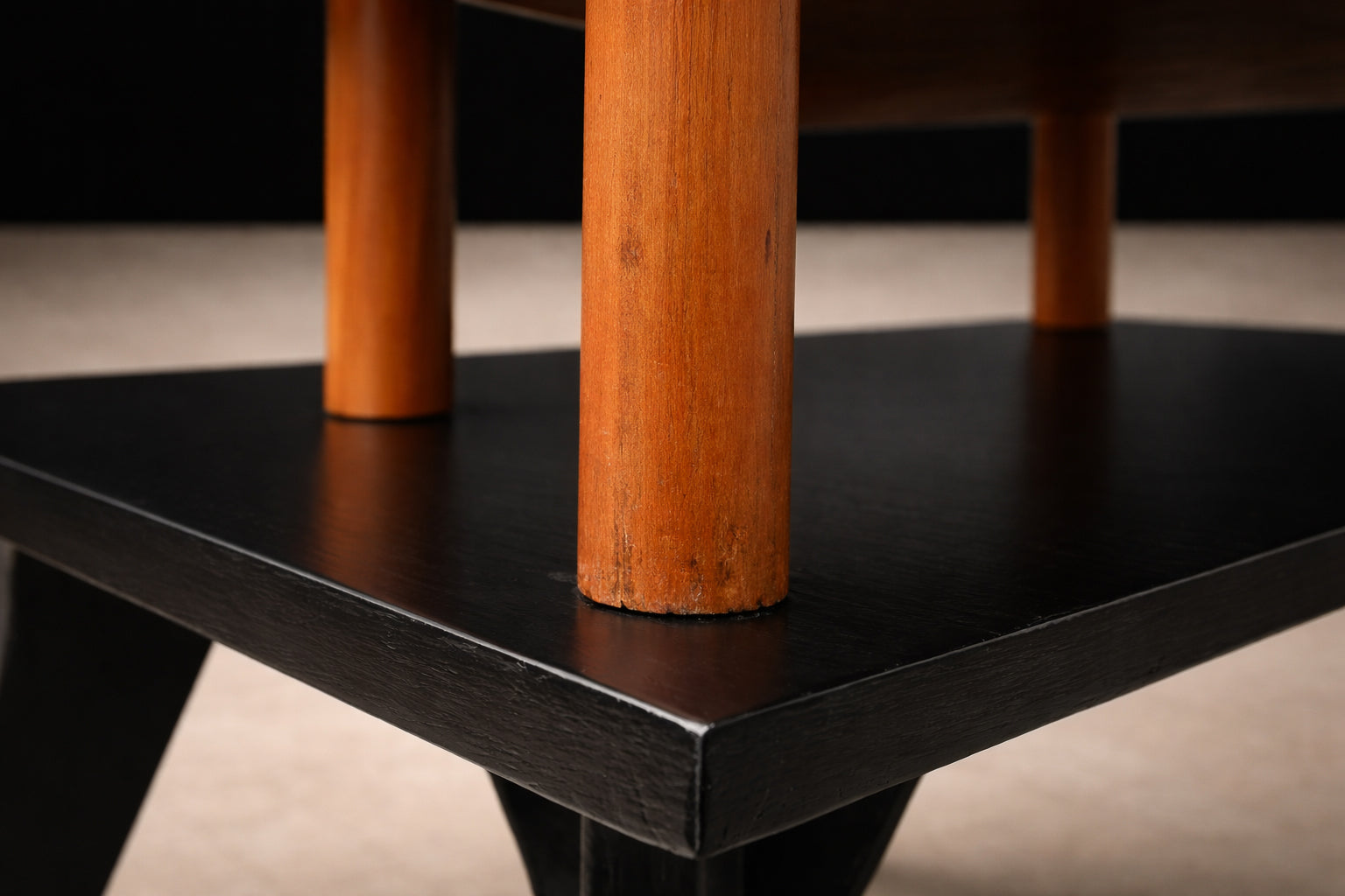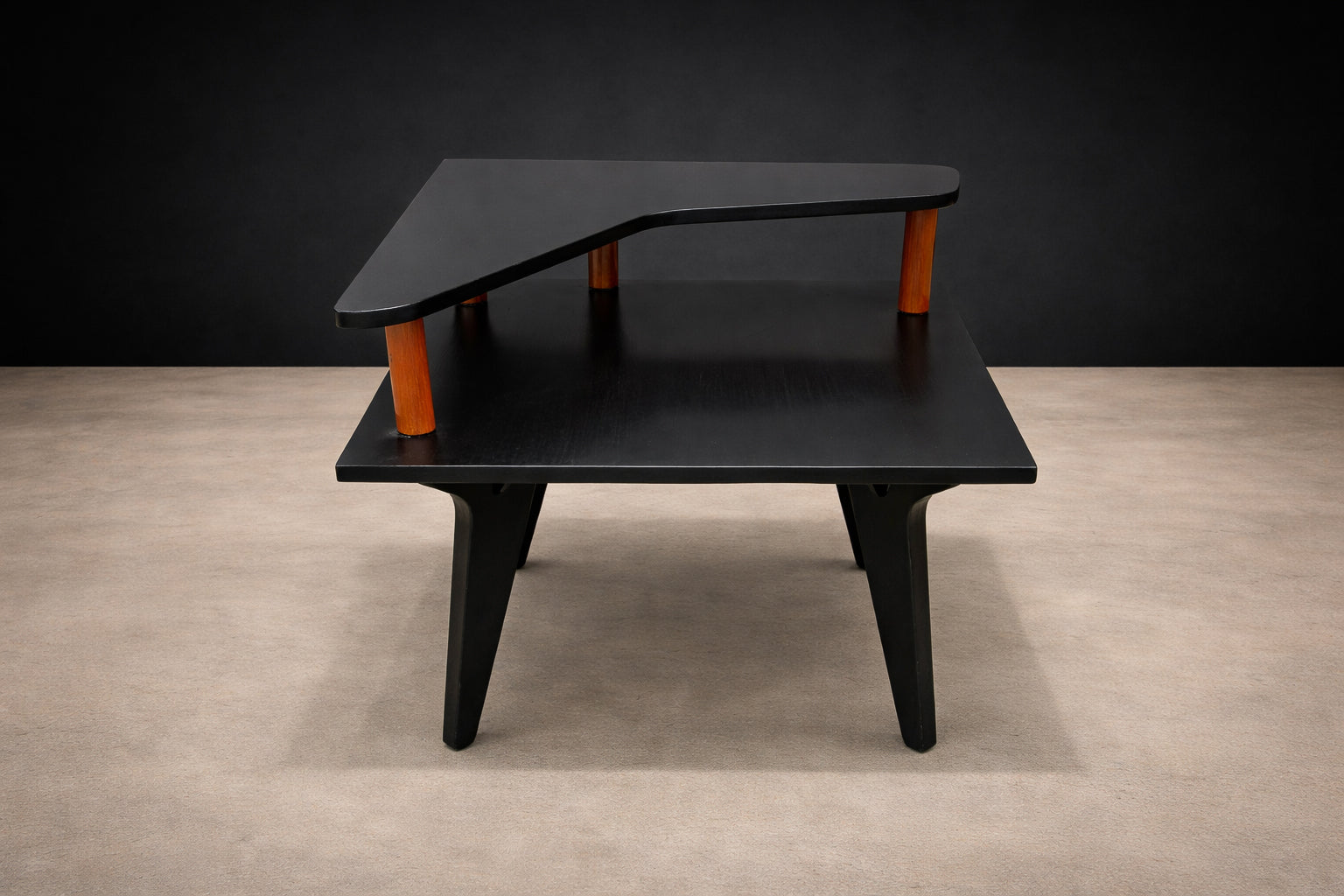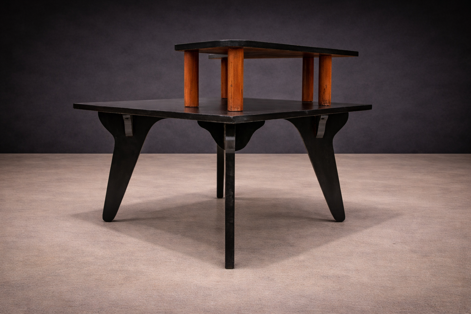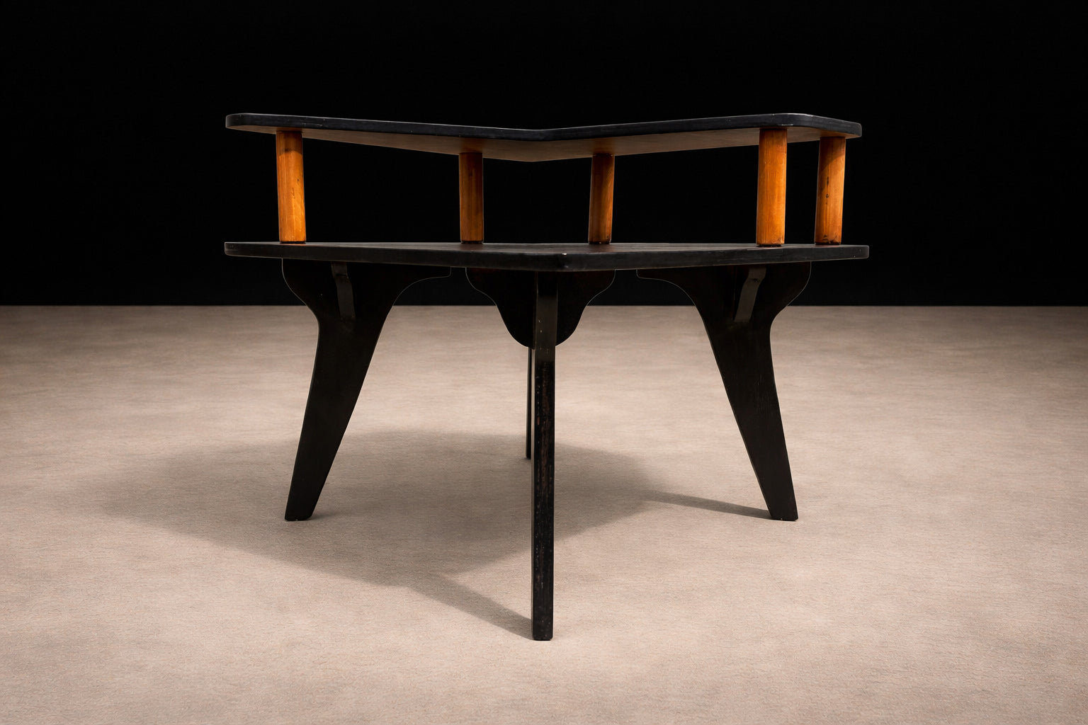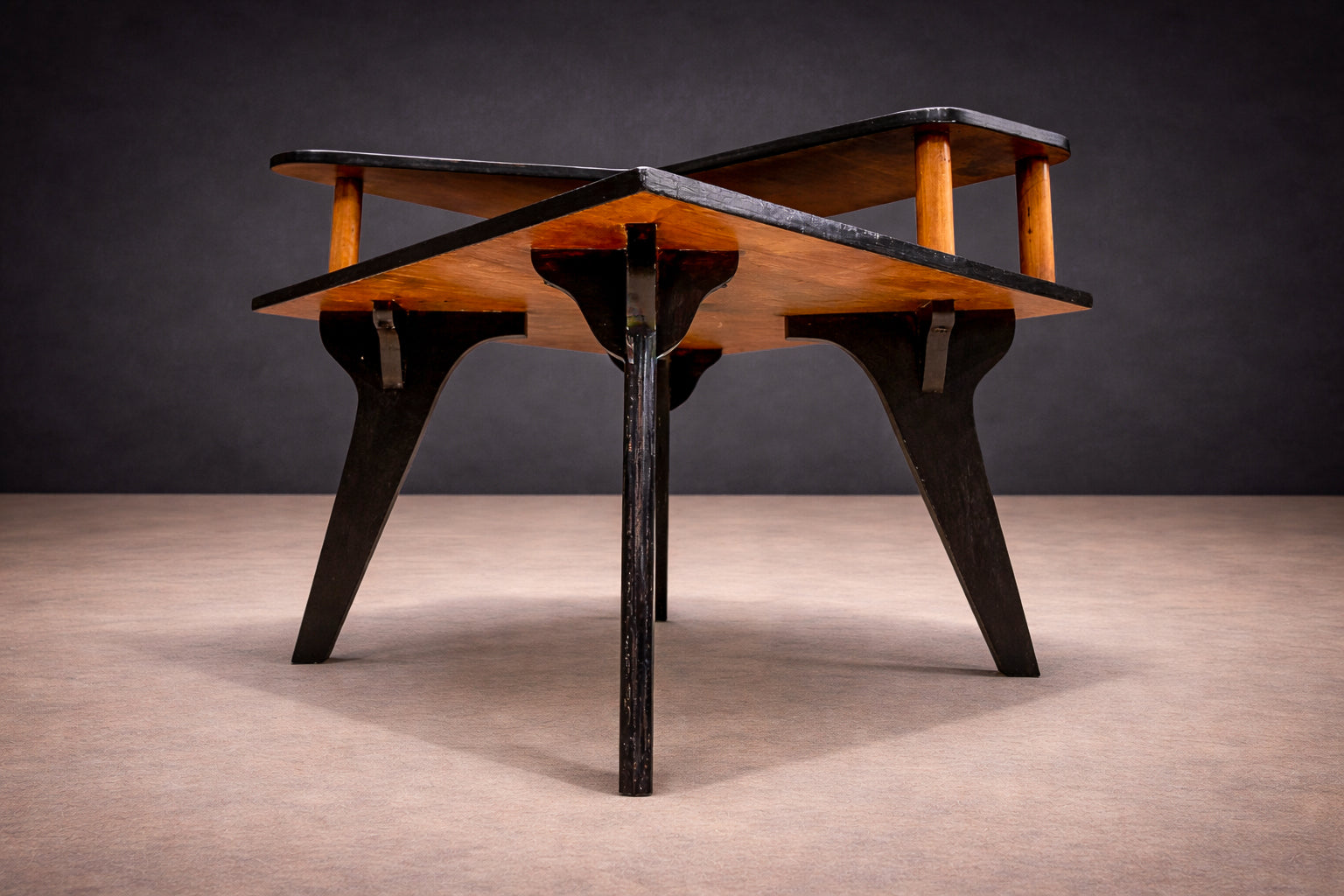 The table is articulated through a compact, two-tier composition supported by four sculpturally cut legs. The geometry is direct and balanced, with subtle curvature at the leg junctions softening the rectilinear planes. This interplay between precision and sculptural restraint is consistent with Zanine’s broader design language of the 1950s.