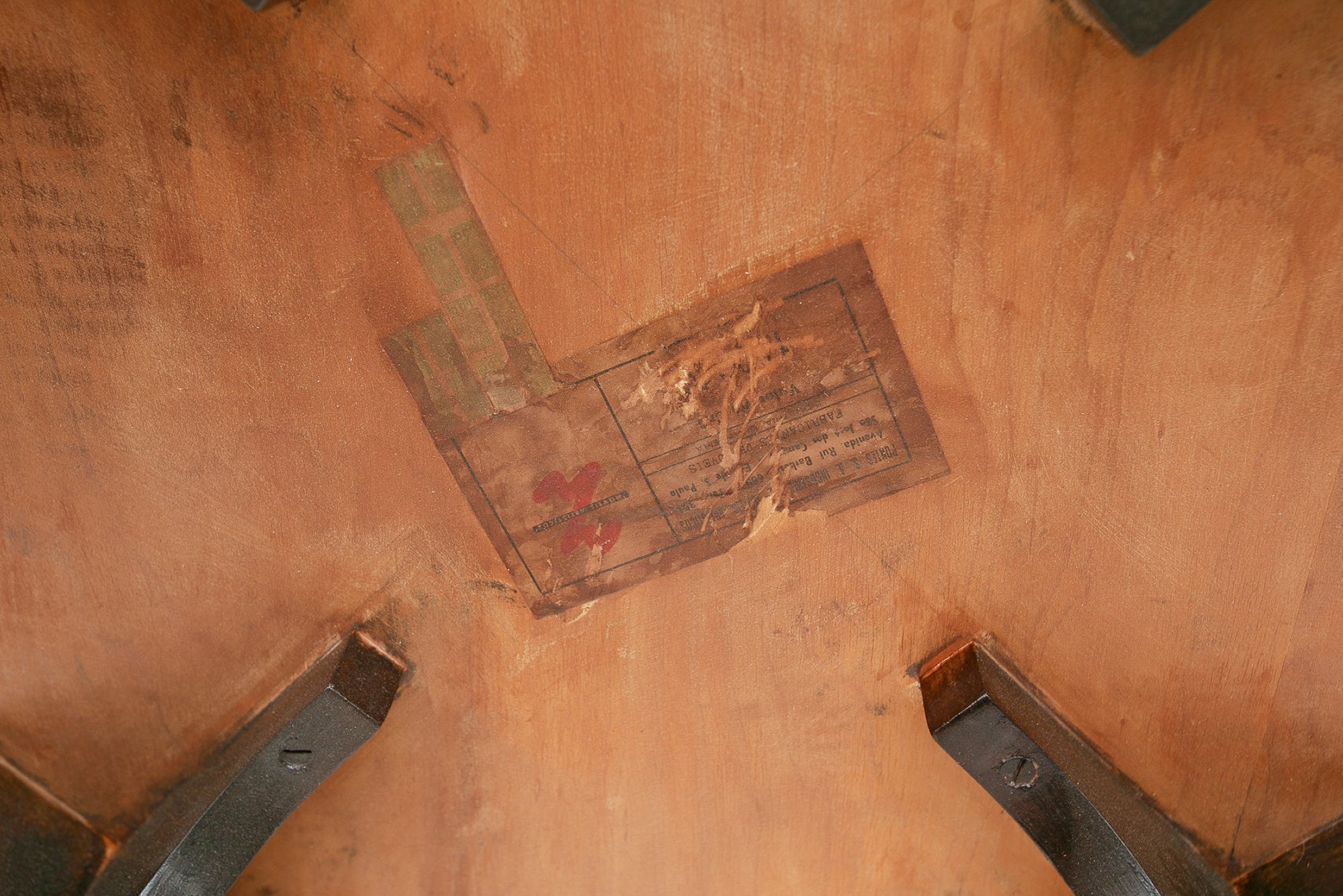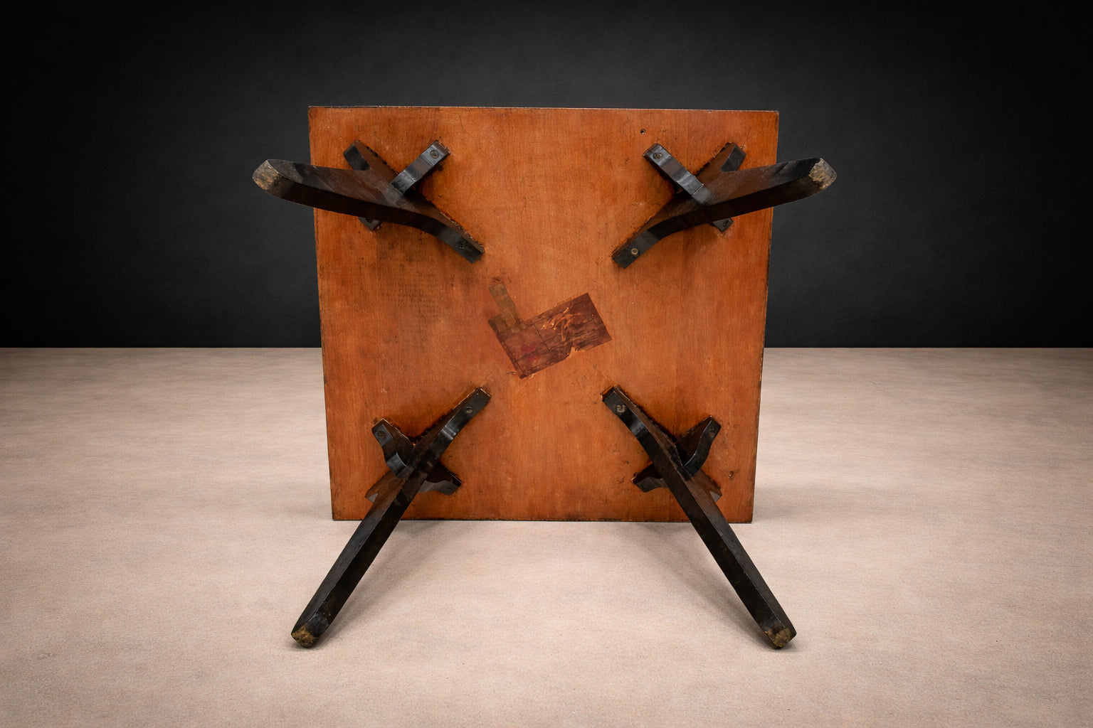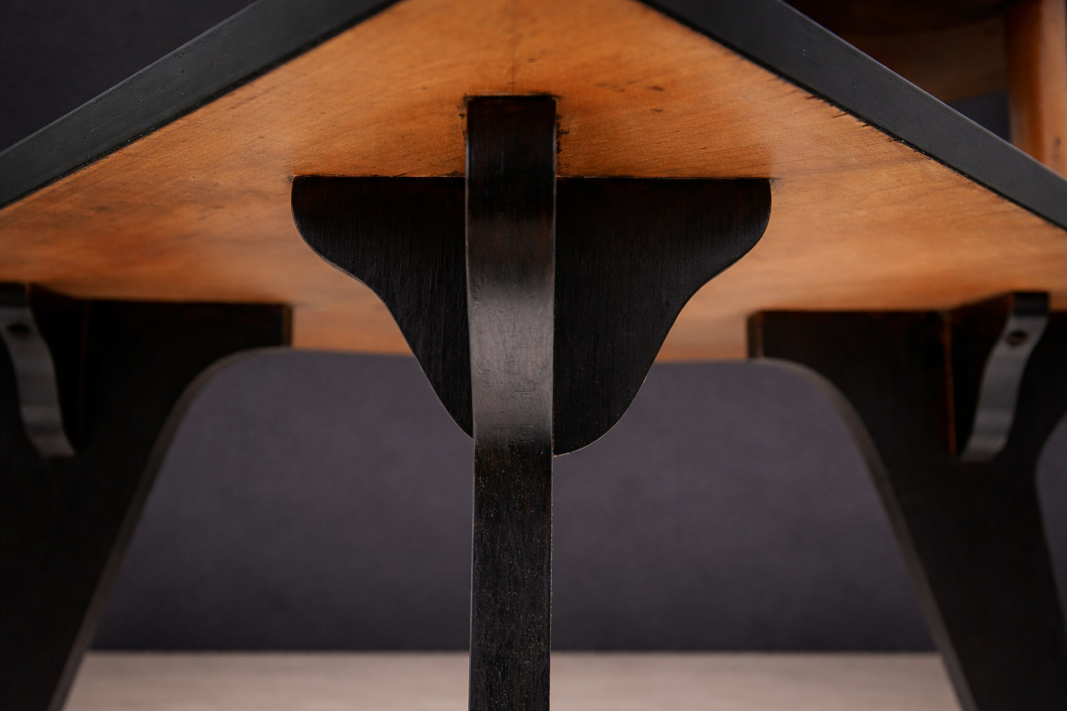 Constructed in plywood and finished in black paint, the piece emphasizes form and construction over surface embellishment. The uniform finish reinforces the graphic quality of the silhouette while allowing the structure to remain legible. Zanine’s manufacturing seal, located beneath the tabletop, confirms authorship and situates the table within his documented production.