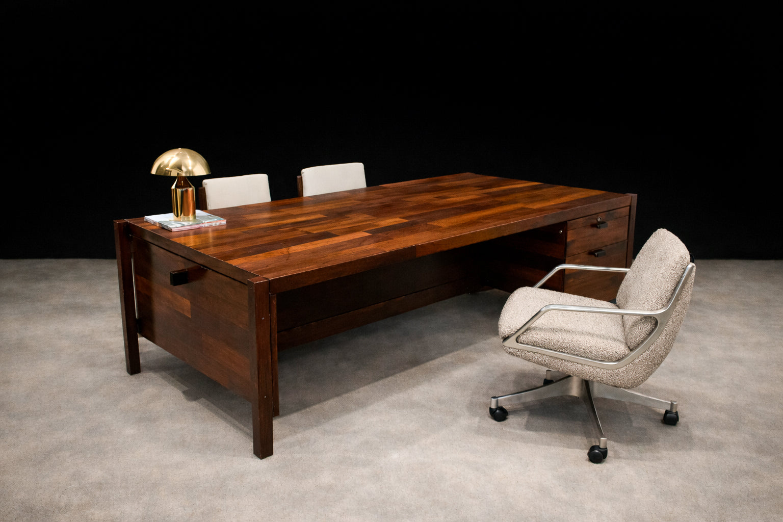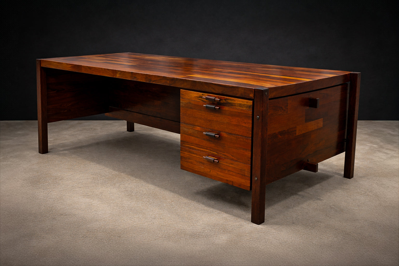 Crafted from Brazilian rosewood (jacarandá), the desk features Zalszupin’s distinctive patchwork construction, composed of a carefully assembled collage of rosewood offcuts, each displaying unique tonal variation and grain. This method—both expressive and resource-conscious—became a signature of his work, transforming material efficiency into a powerful visual language.