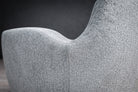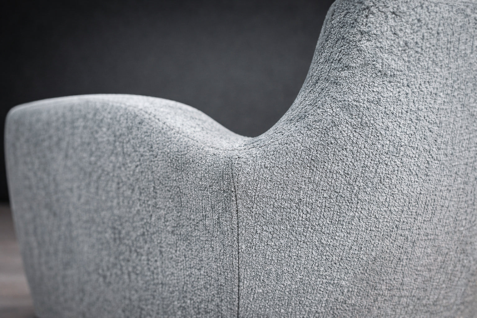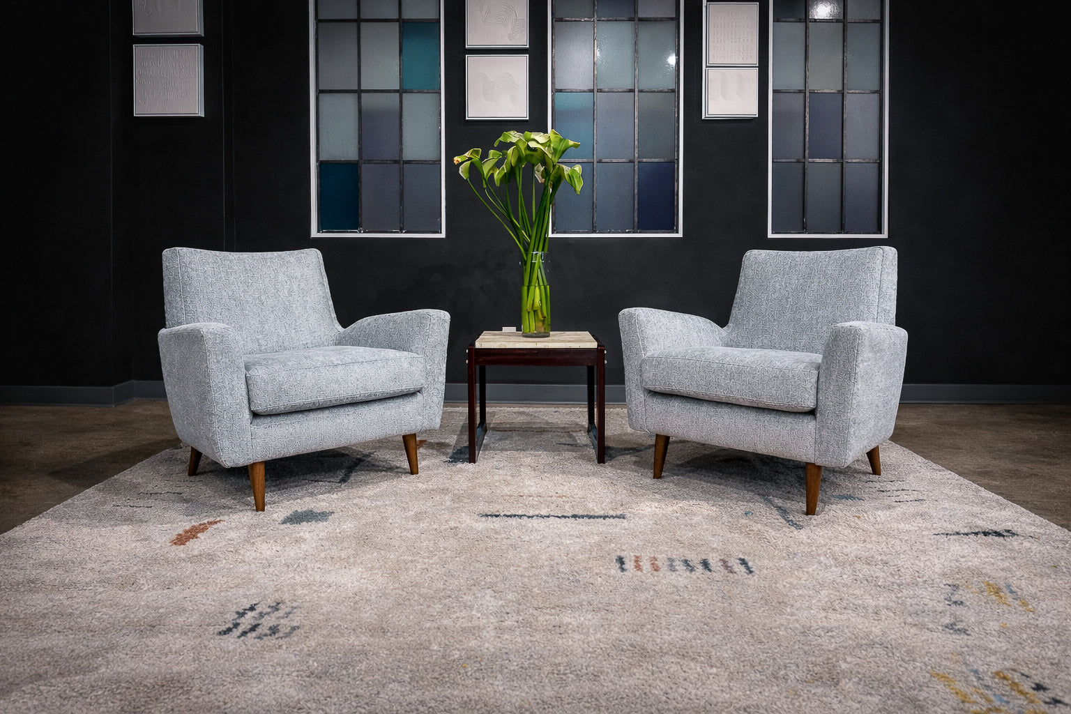 Upholstered in a light blue chenille with a lightly raised texture, the chairs offer both tactile depth and material durability. The dense fabric enhances the sculptural quality of the form while supporting long-term comfort. Solid wood legs, finished to reveal their natural grain, anchor the design and underscore its material integrity.