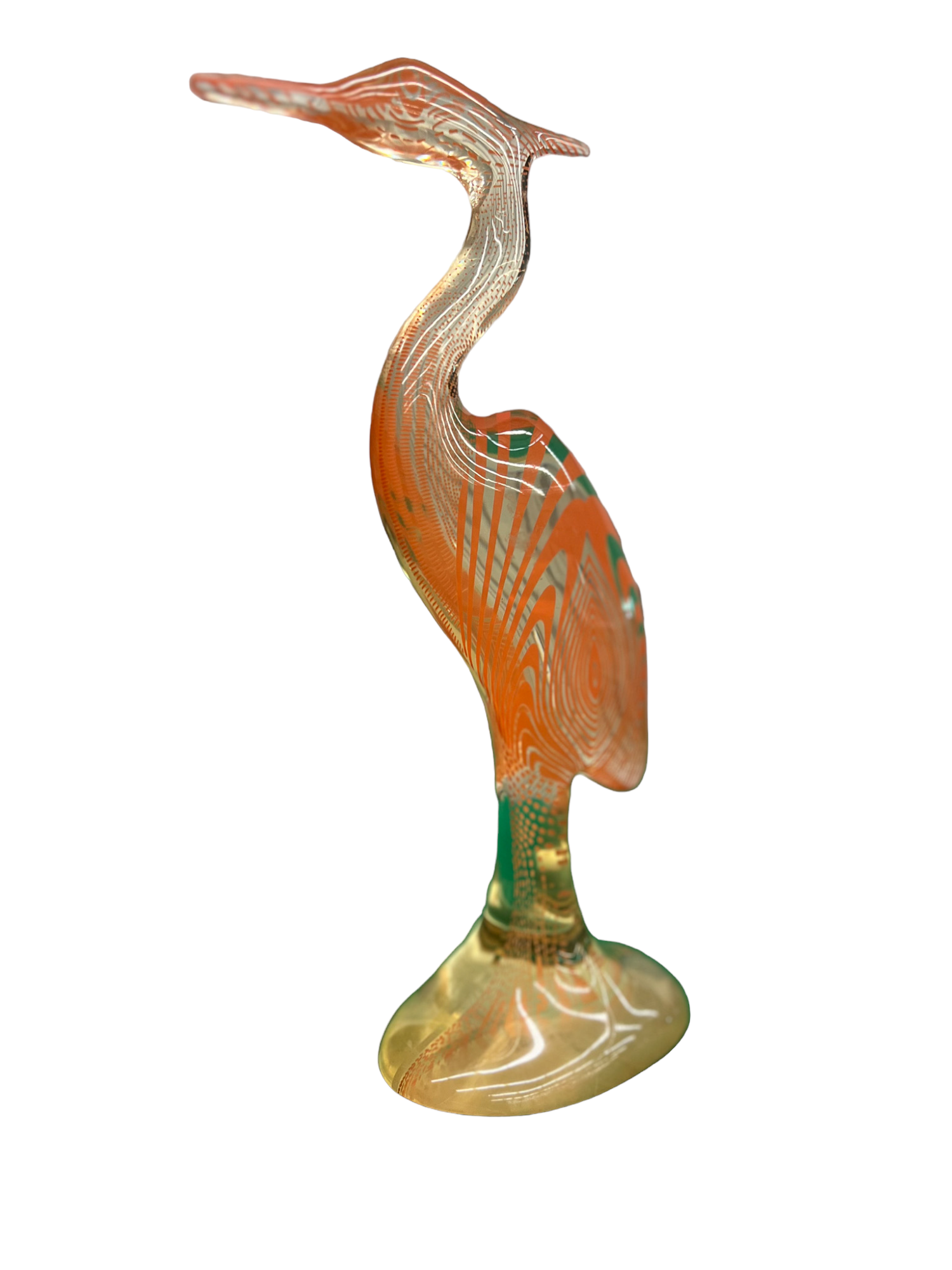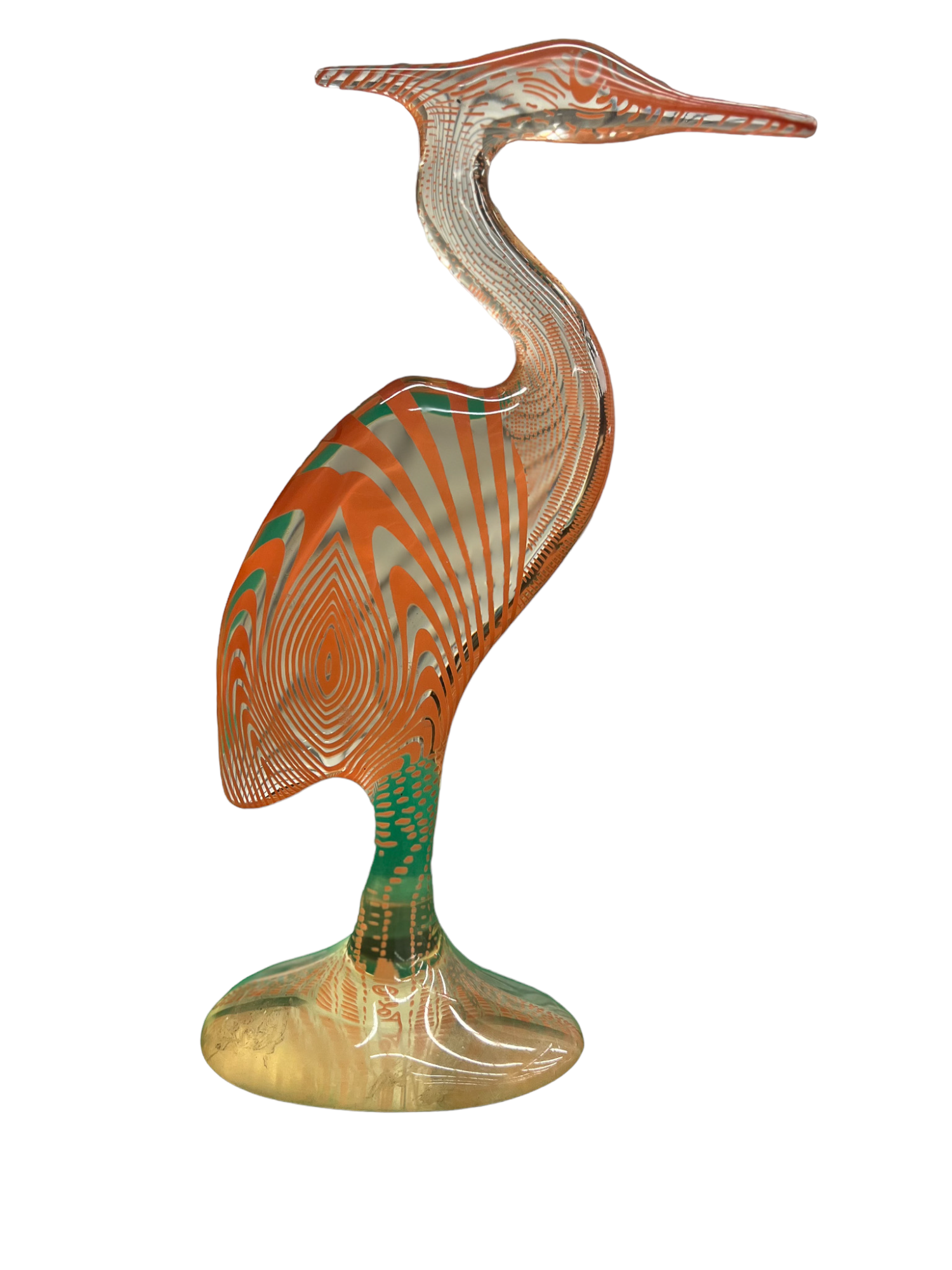 This is a stylized heron sculpture crafted from resin, featuring an elegant, elongated form. The surface is adorned with swirling patterns in vibrant orange, green, and amber tones, creating a dynamic, almost hypnotic visual texture. The translucent quality of the resin adds depth and luminosity, giving the piece a striking, modern presence. It stands on a sturdy base, balancing the delicate curves of the bird’s body and extended neck with an artistic flair. Perfect as a decorative art piece or collectible. Features its original makers Label on the base.