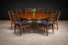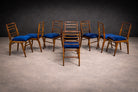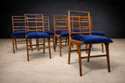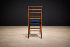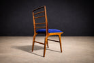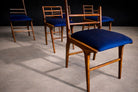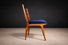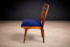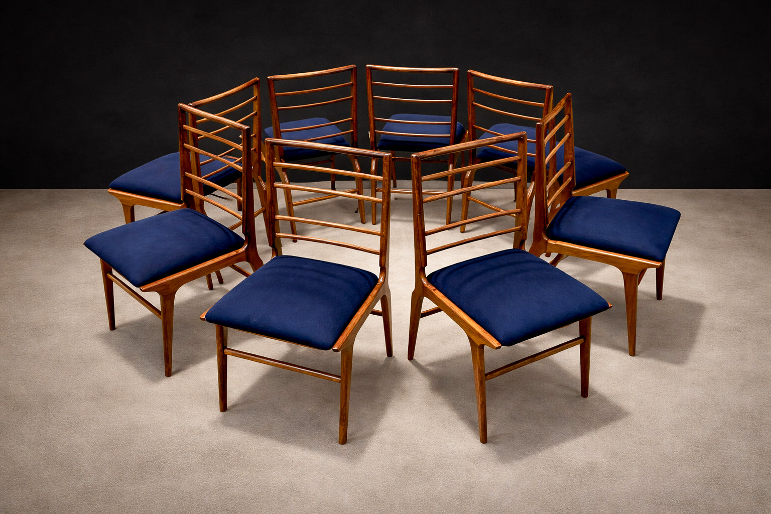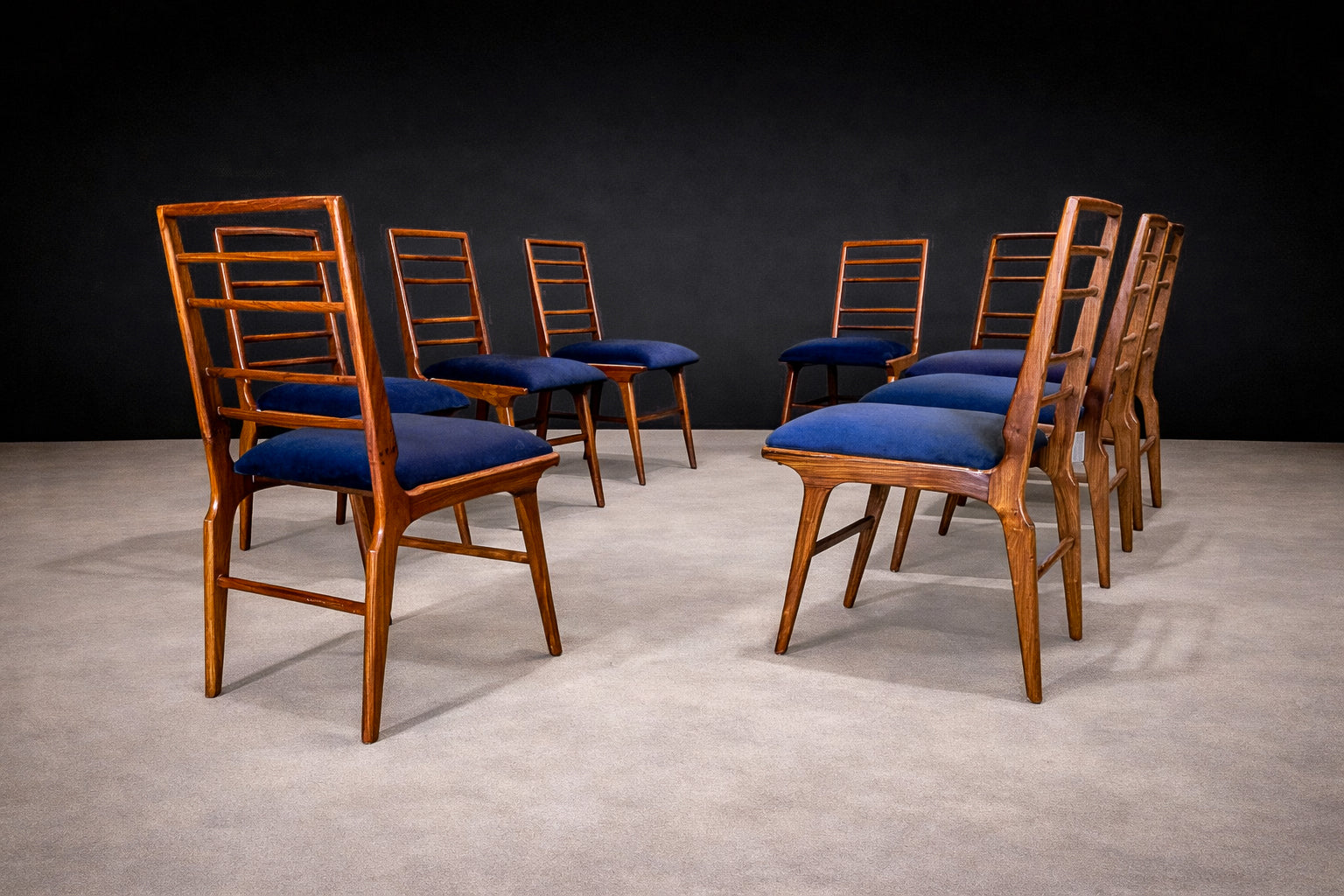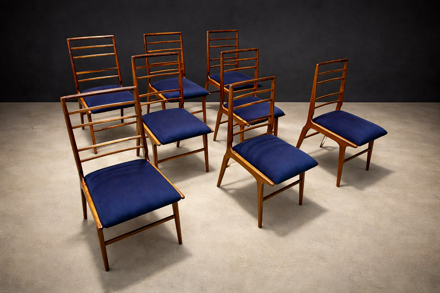 Crafted in solid caviúna wood, the frames display warm tonal variation and pronounced grain movement, now revealed through professional refinishing that respects the original character of the material. The seats have been newly reupholstered in deep blue fabric, introducing a restrained contrast that underscores the warmth of the wood without overwhelming it. The upholstery integrates seamlessly into the structure, preserving the chairs’ proportional balance and ergonomic intent.