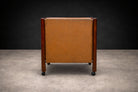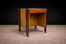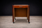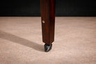Material contrast plays an important role in the design. The warmth of the rosewood veneer—now professionally refinished—reveals lively grain and tonal variation across the surfaces, emphasizing the natural character of the wood. The side panels are clad in leather, introducing a tactile counterpoint to the polished wood and metal elements. These materials are applied with restraint, reinforcing the piece’s functional purpose rather than serving as decoration.