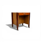 The form is defined by a rectilinear cabinet supported on four cylindrical legs fitted with chromed casters. This mobile base introduces a sense of lightness and flexibility, enabling the piece to function interchangeably as a side table or a compact filing cabinet. A single drawer is set discreetly into the upper section, maintaining the table’s visual clarity while providing practical storage.