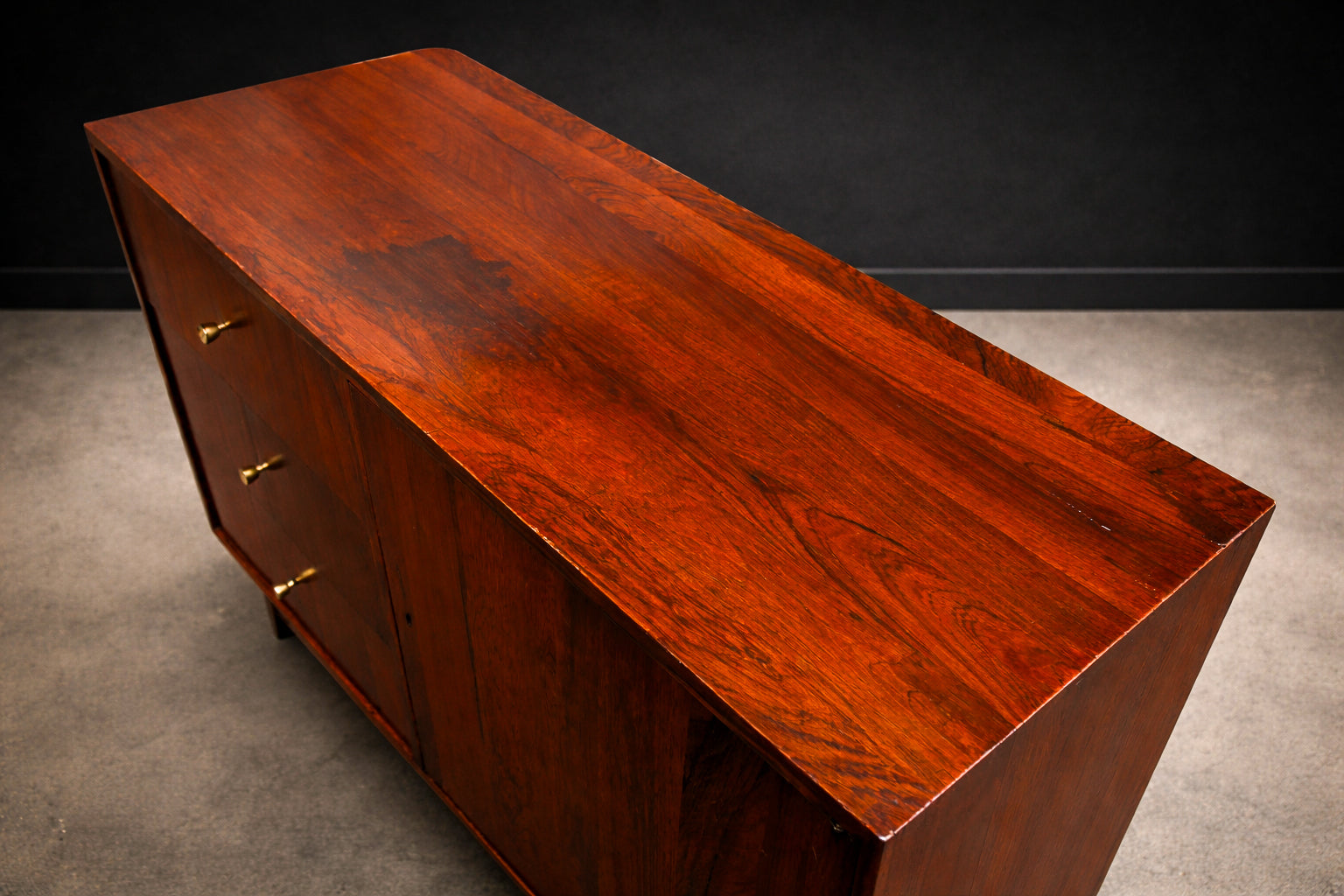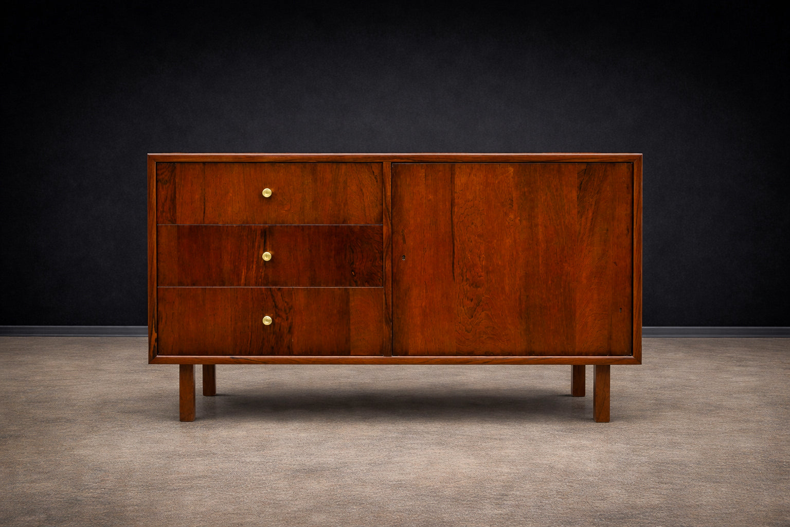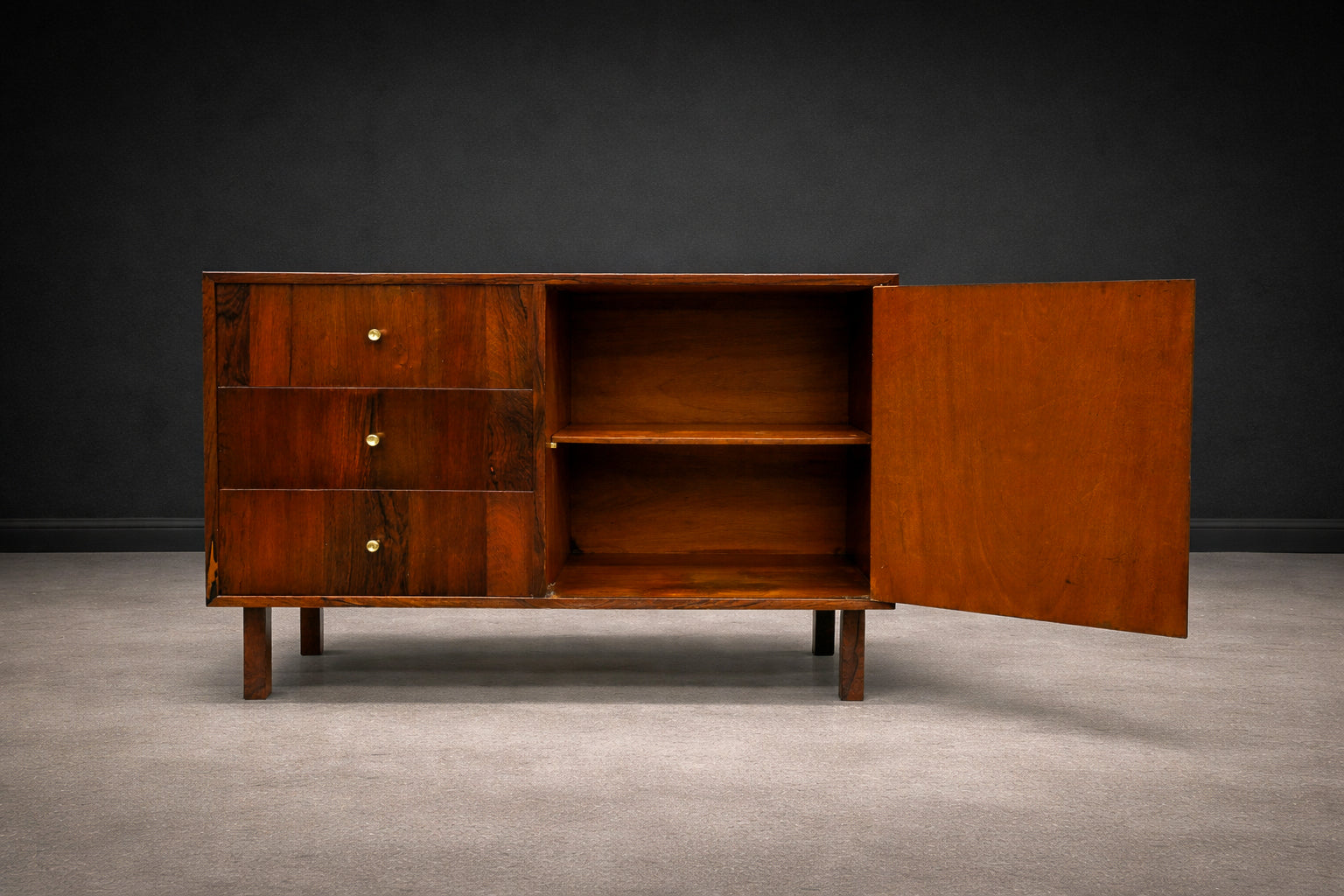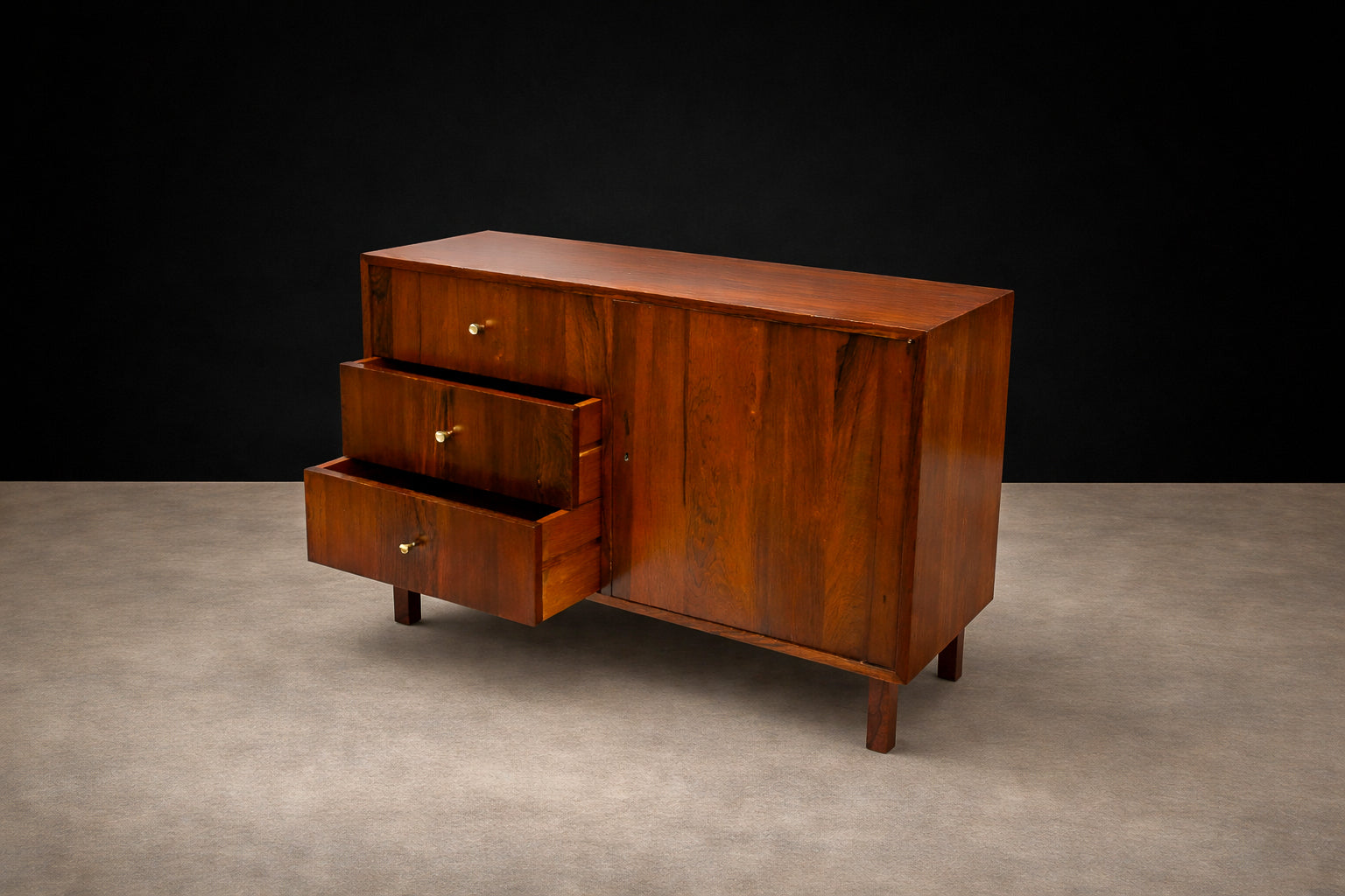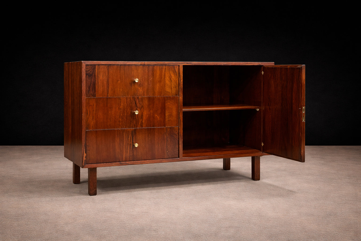 The sideboard is crafted entirely from Brazilian Rosewood, known as Jacaranda, featuring three drawers adorned with brass handles, along with a single door, a shelf, and supported by four square-shaped legs. Designed by Geraldo de Barros during his tenure at Unilabor in the 1950s, it reflects his iconic aesthetic characterized by straight lines, modular boxes, and the use of hardwood, metal, and formica. The manufacturing seal of Unilabor is located underneath the chest, attesting to its authenticity.