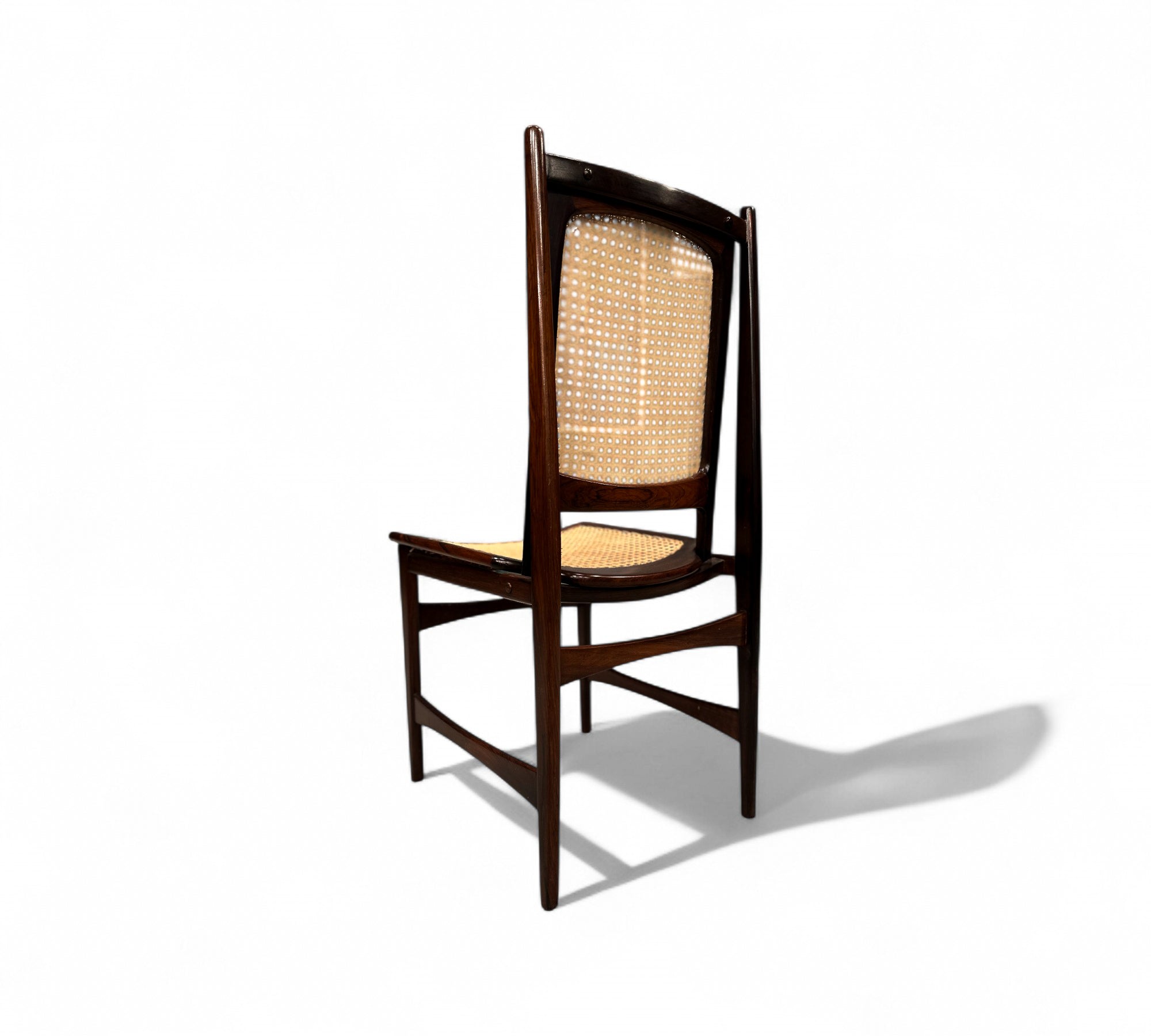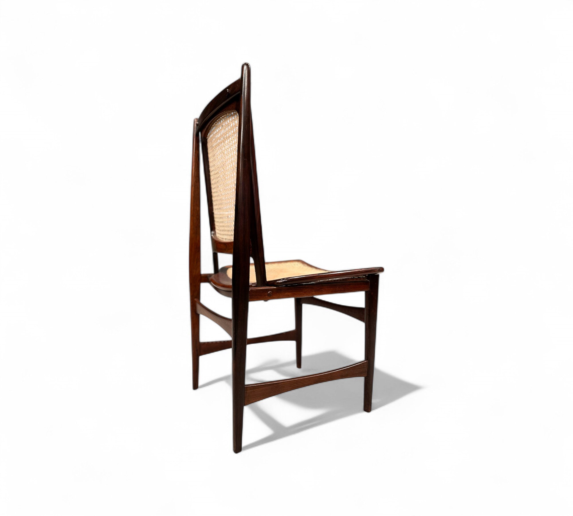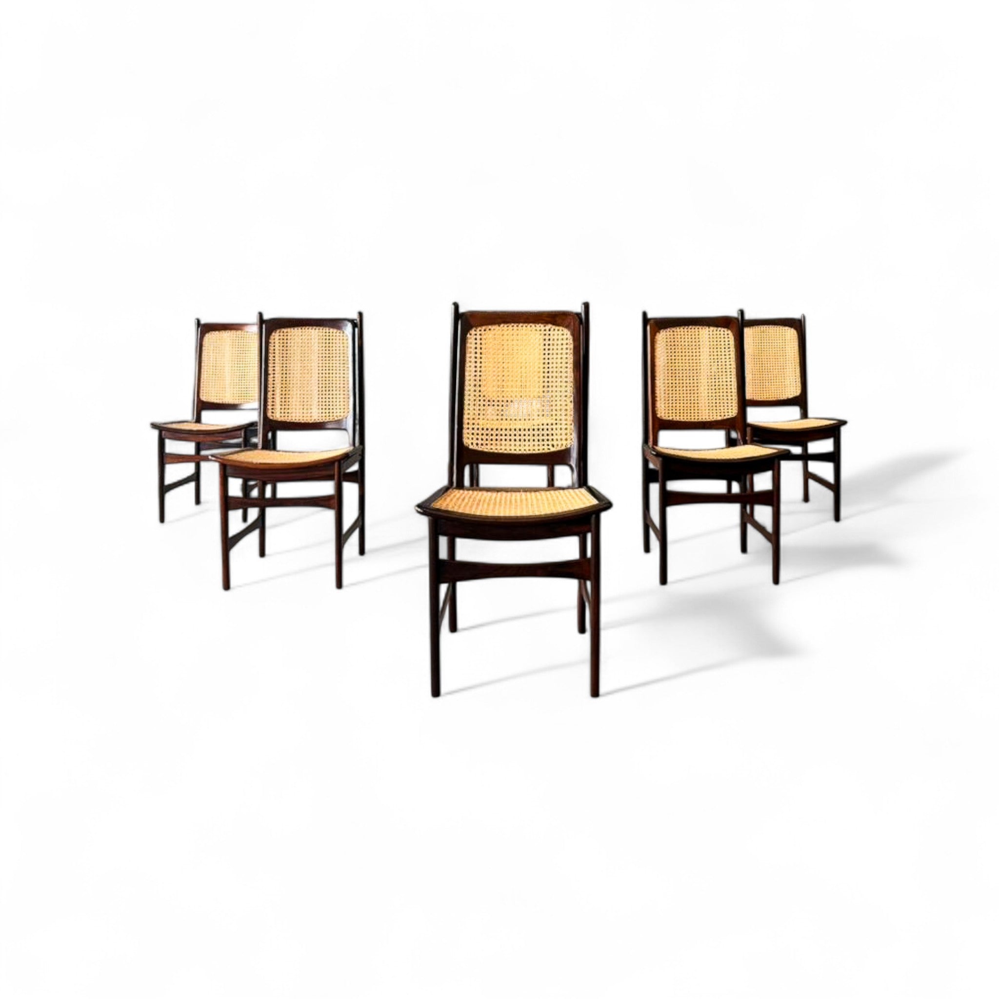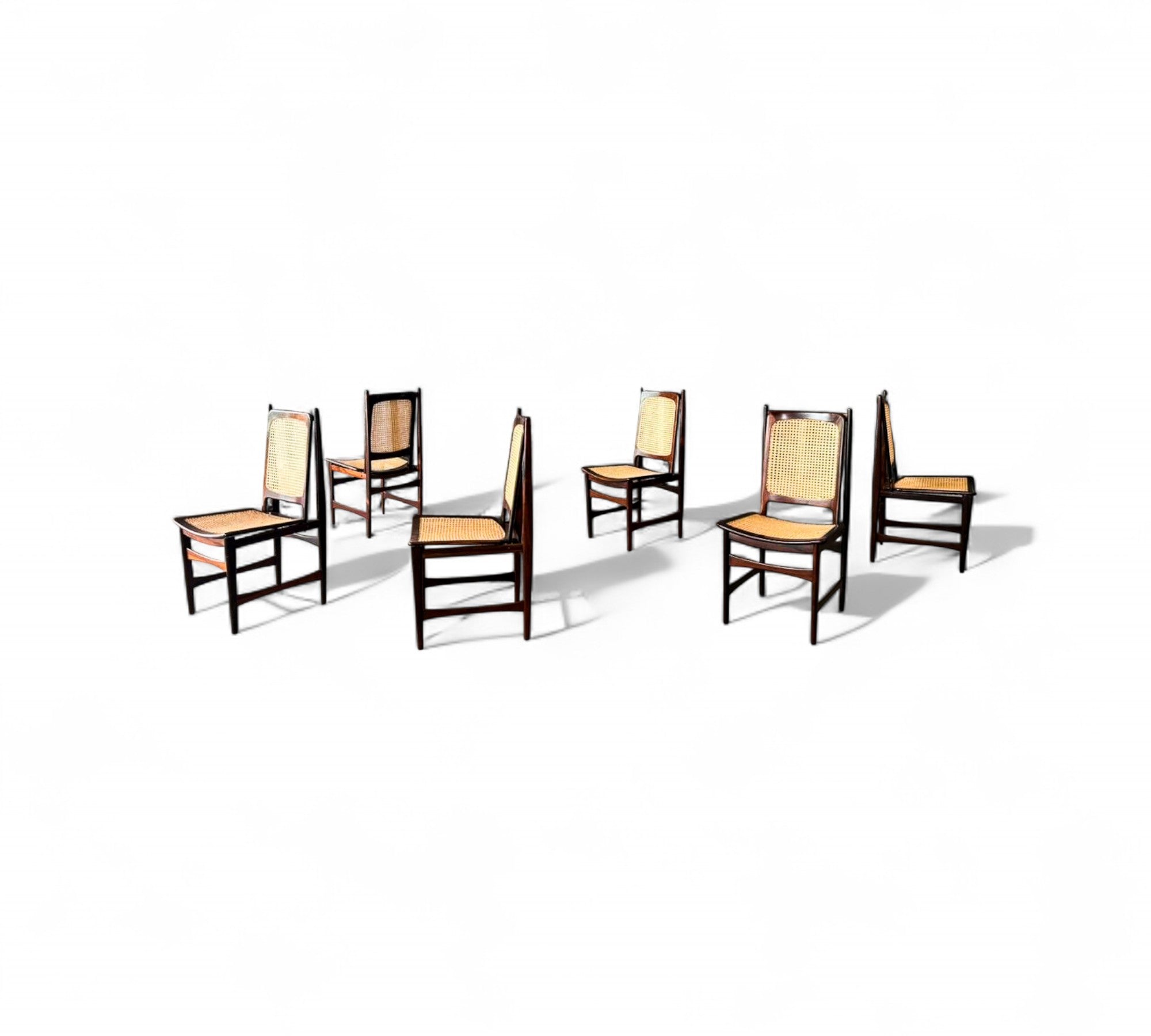 This set of Eight chairs was designed by Alexandre Rapoport in Brazil in the 1960s. The chairs are entirely made in Rosewood and have a seat and backrest in caning. Each chair is beautifully sculpted with a tall backrest and an inclined seat for comfort. The rosewood has been refinished and the caning is new.