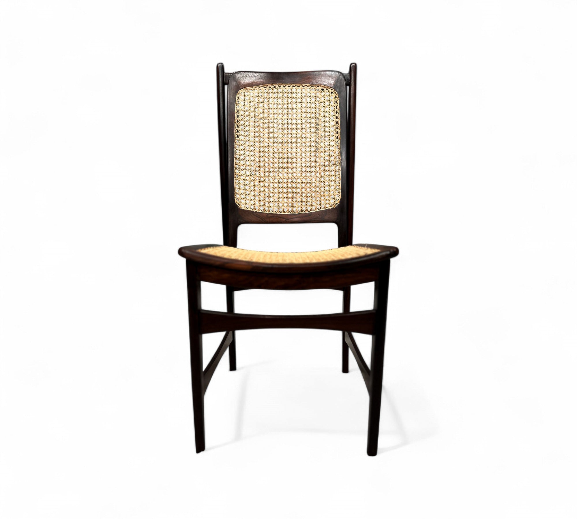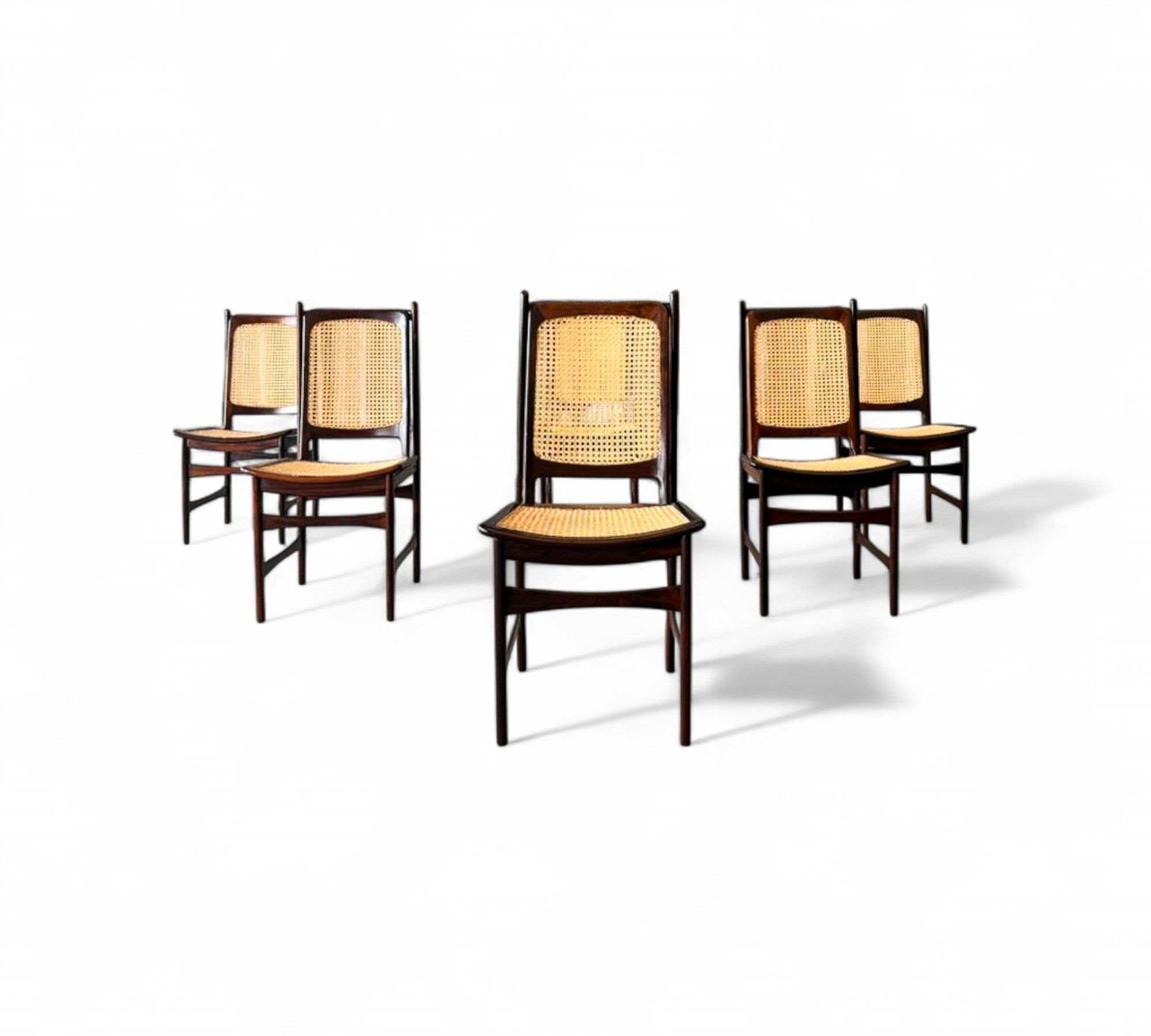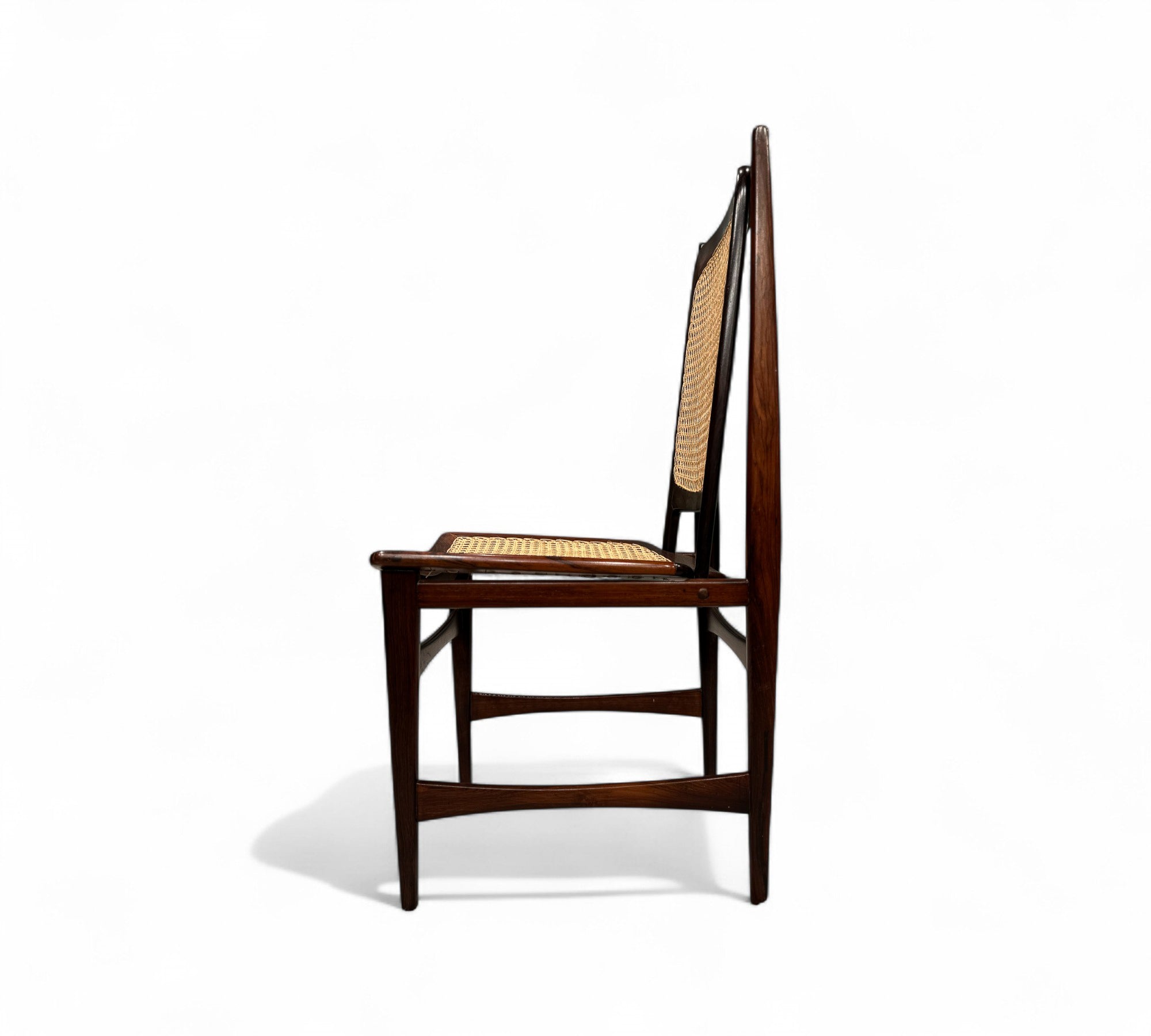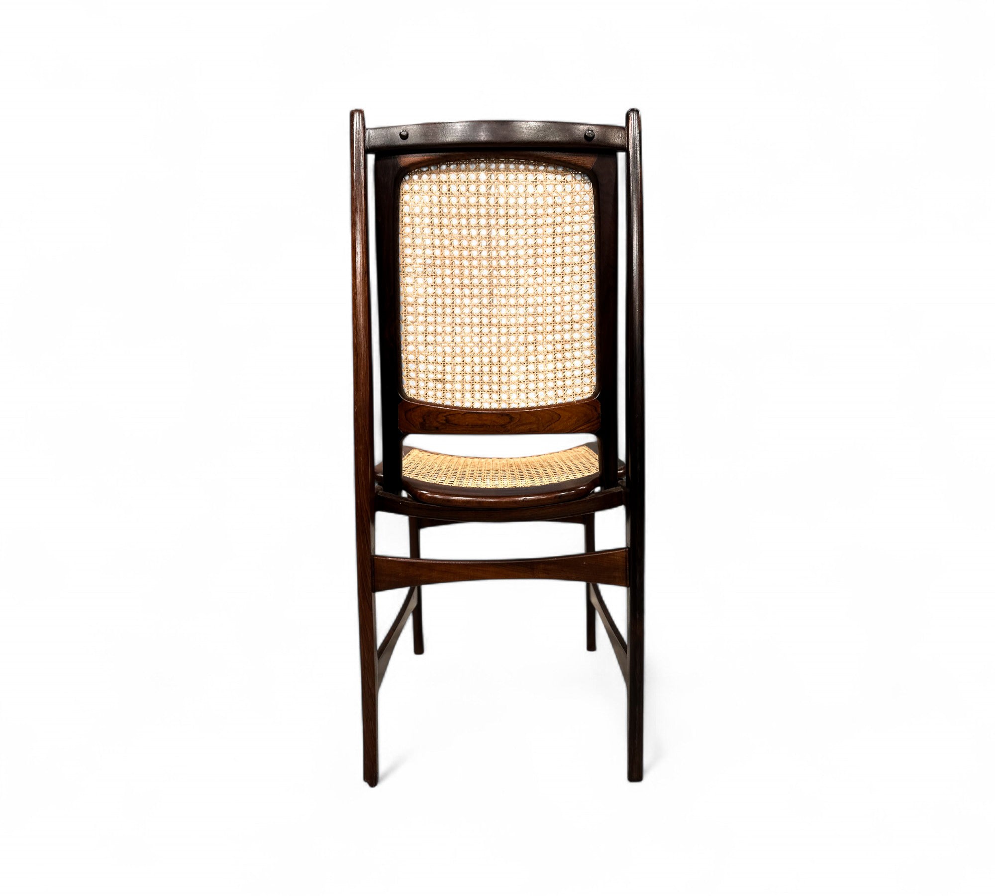 This set of Eight chairs was designed by Alexandre Rapoport in Brazil in the 1960s. The chairs are entirely made in Rosewood and have a seat and backrest in caning. Each chair is beautifully sculpted with a tall backrest and an inclined seat for comfort. The rosewood has been refinished and the caning is new.