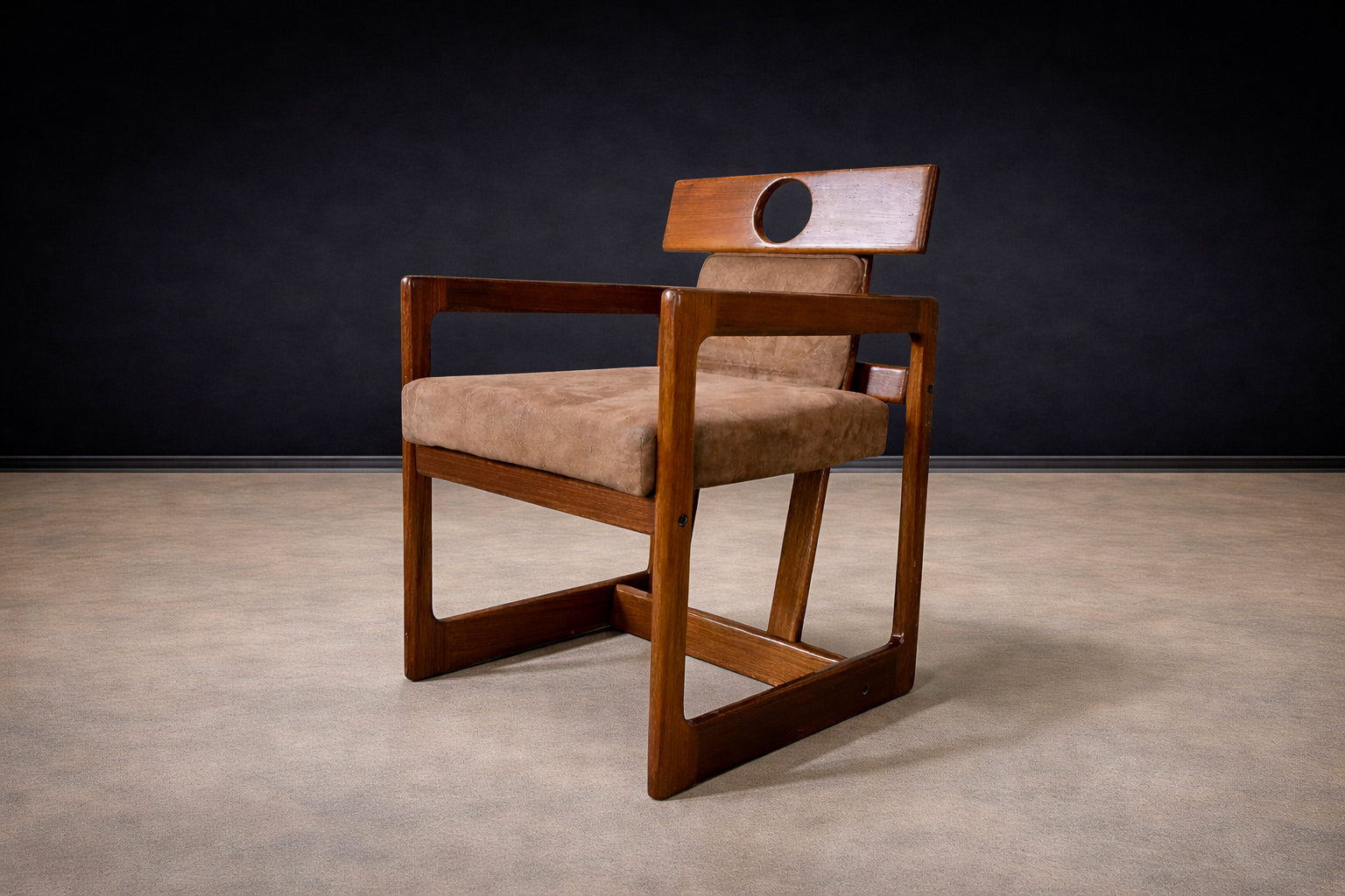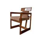 Crafted in solid Brazilian hardwood, the chair is defined by its distinctive rectangular, box-like base, which grounds the composition with visual weight and structural stability. This geometric foundation contrasts with the angled backrest and open arm structure, creating a dynamic relationship between mass and openness. The pierced backrest element introduces both ergonomic support and sculptural identity, diverging from conventional dining chair typologies.