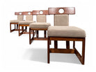 The table and four chairs have been beautifully restored and are in great condition. The chair frames are crafted from Brazilian hardwood, while the seats and backrests feature ultra-suede upholstery. The chairs boast a distinctive design, with a rectangular box-shaped base and a slanted backrest. The accompanying table shares several design elements with the chairs, including circular and straight line motifs. This set is available for purchase as a whole or individually. The listed price is for the entire set.