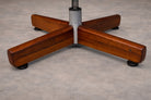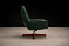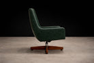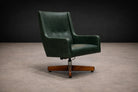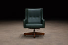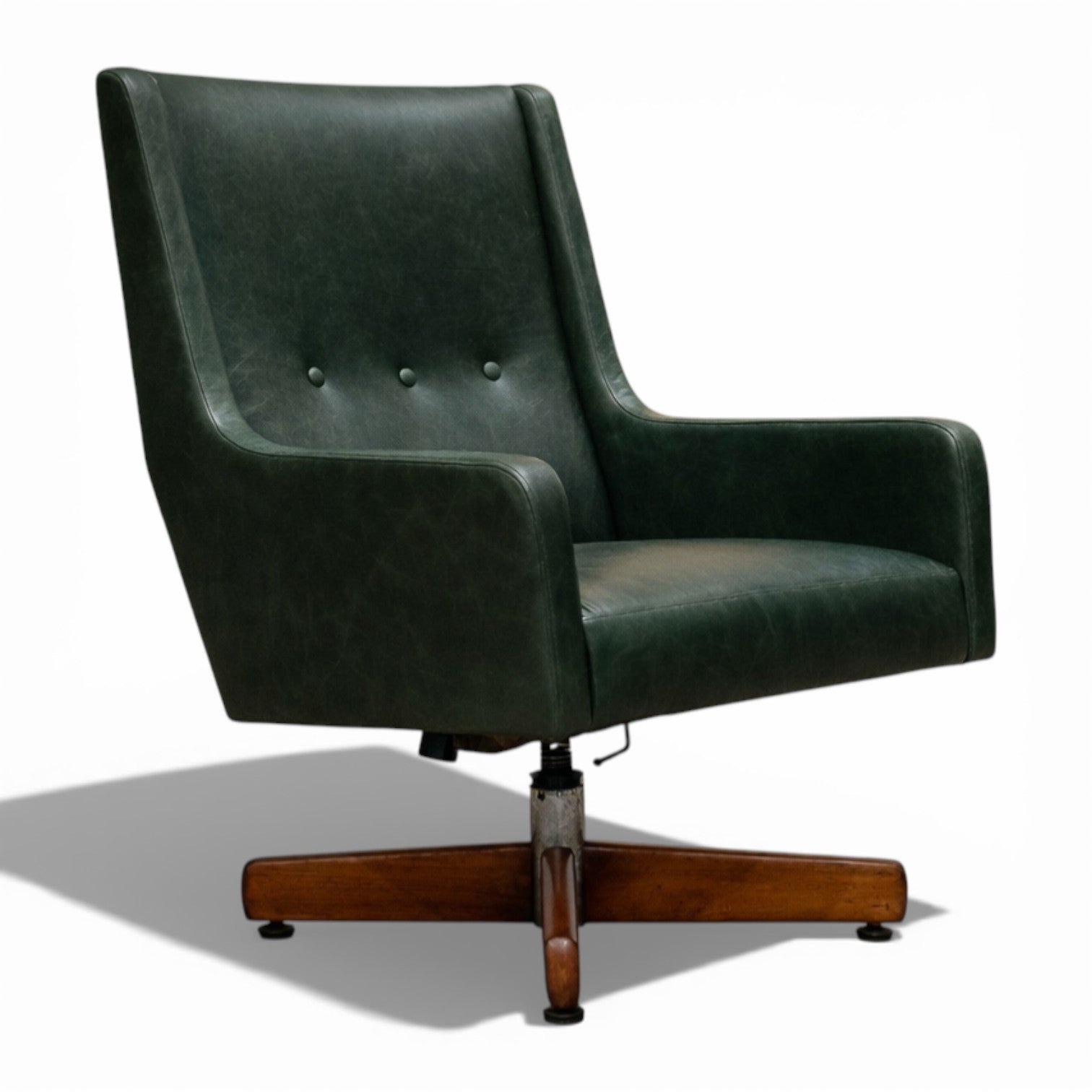 The wood has been professionally refinished, and the seat has been reupholstered in green leather, restoring the chair to a condition consistent with its original presentation. Discreet casters have been added to the base, allowing the chair to function comfortably as a modern office or desk chair.