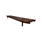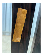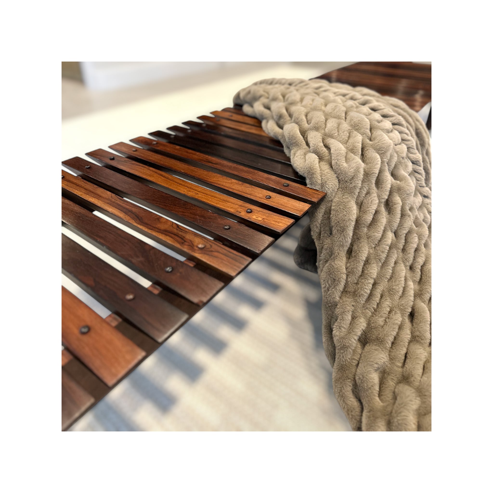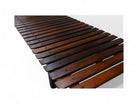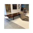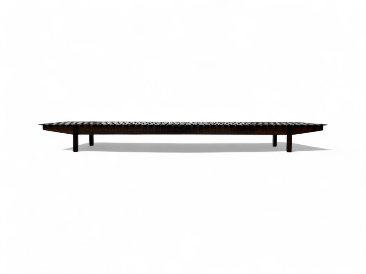 This bench features a low rectangular base with slats positioned latitudinally, embodying a simple yet elegant design. Small wood buttons delicately placed add a charming touch to its eye-catching appearance. Crafted from solid Rosewood, the bench exhibits beautiful natural tones and veins, showcasing Rodrigues' artistic vision in its finest form.