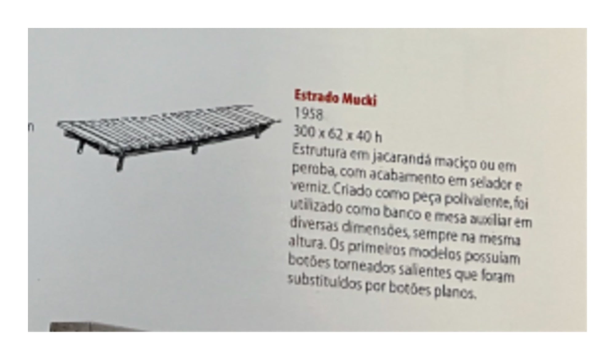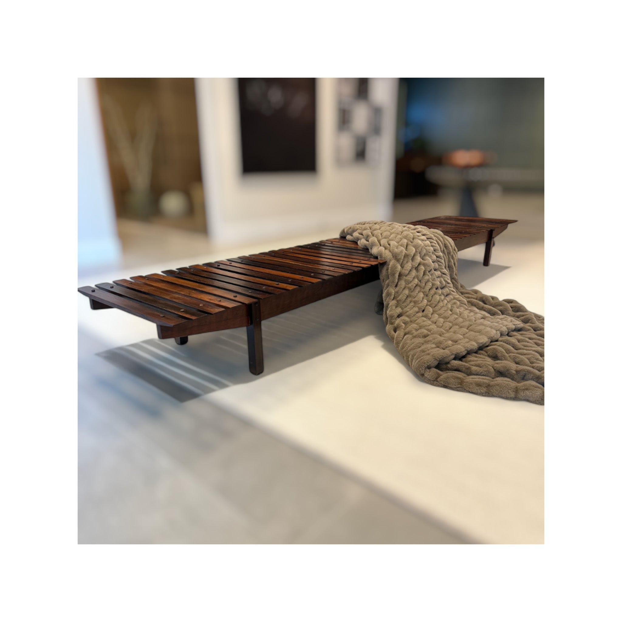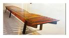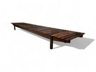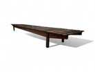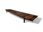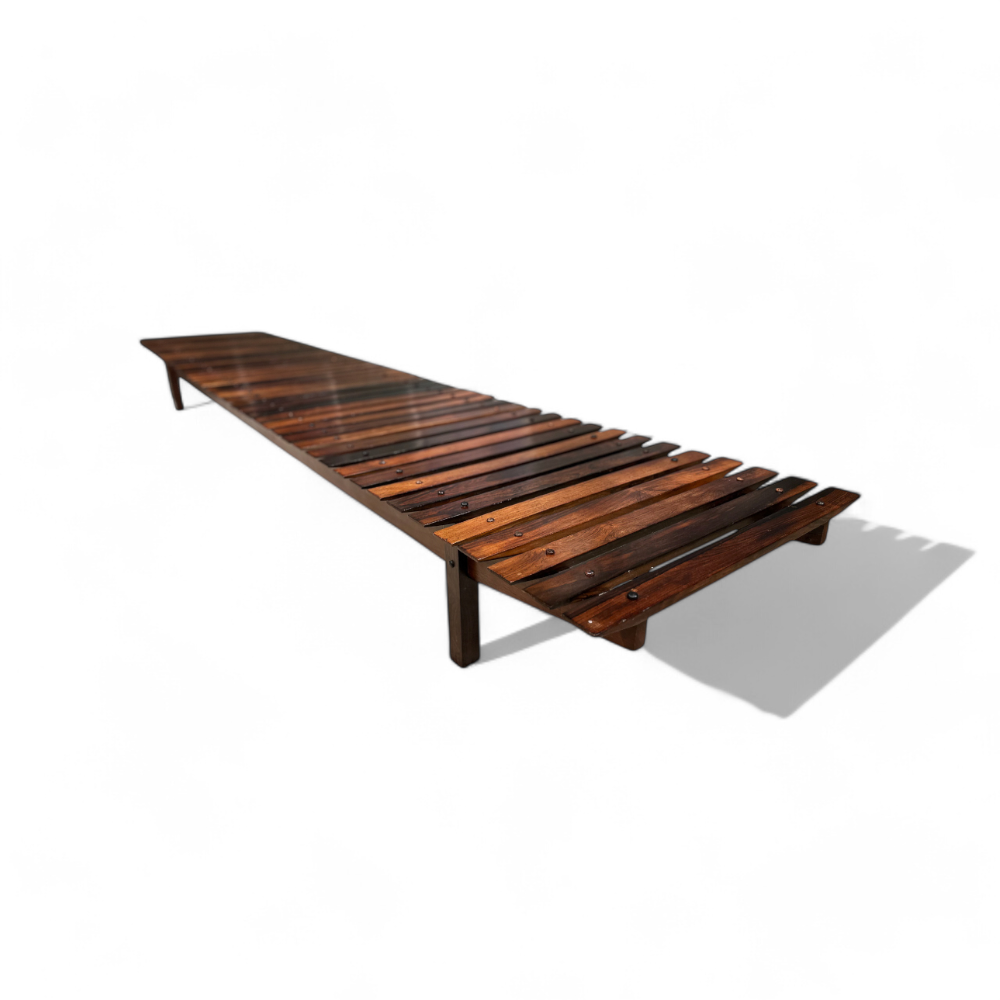 The "Mucki" bench, designed by Sergio Rodrigues in 1958 and manufactured by Oca, spans almost 10 feet, making it a versatile and striking piece suitable for both indoor and outdoor settings.