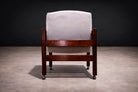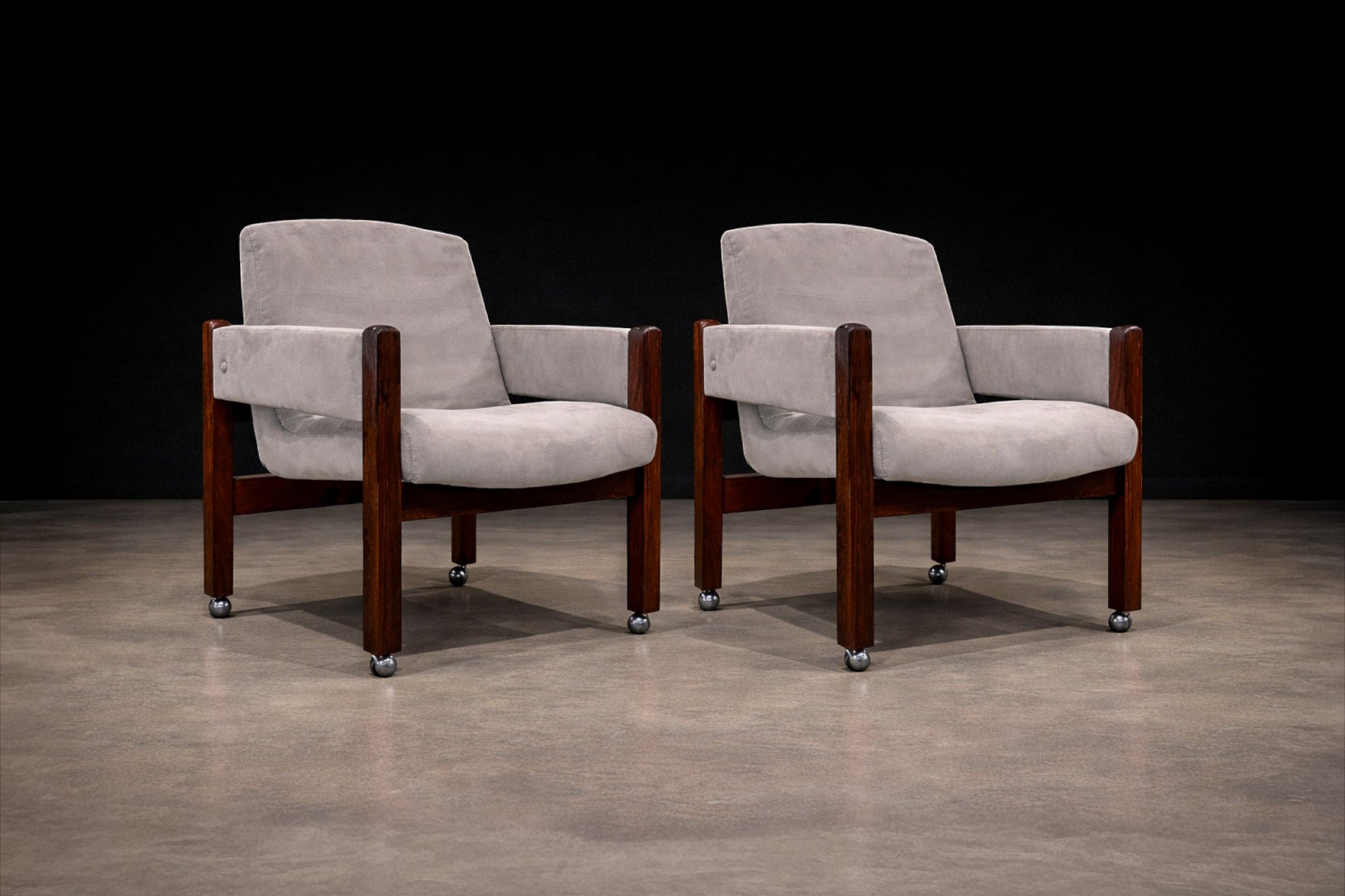 This pair is distinguished by the addition of chromed casters, which remain in excellent condition and enhance the chair’s functionality without detracting from its architectural presence. The Jimi armchair is documented in published literature on Sergio Rodrigues, with archival imagery shown in the final photograph.