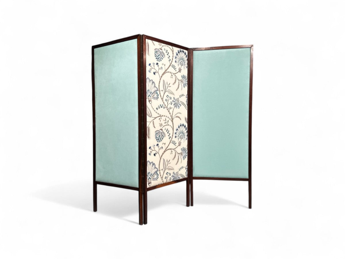 This striking screen comprises three panels crafted from Brazilian Rosewood. The wood has been carefully restored to highlight its beautiful natural veins. The upholstered panels feature two luxurious fabrics, with the central panels adorned with embroidered designs of natural motifs in Central Asian style. The ends are finished with ultra-smooth, silky Ultra suede in pistachio green. This versatile piece can serve as a room divider or an accent piece on its own. It can be fully extended, partially closed, or completely folded, depending on the space available. Regardless of its configuration, it is sure to be a showstopper.