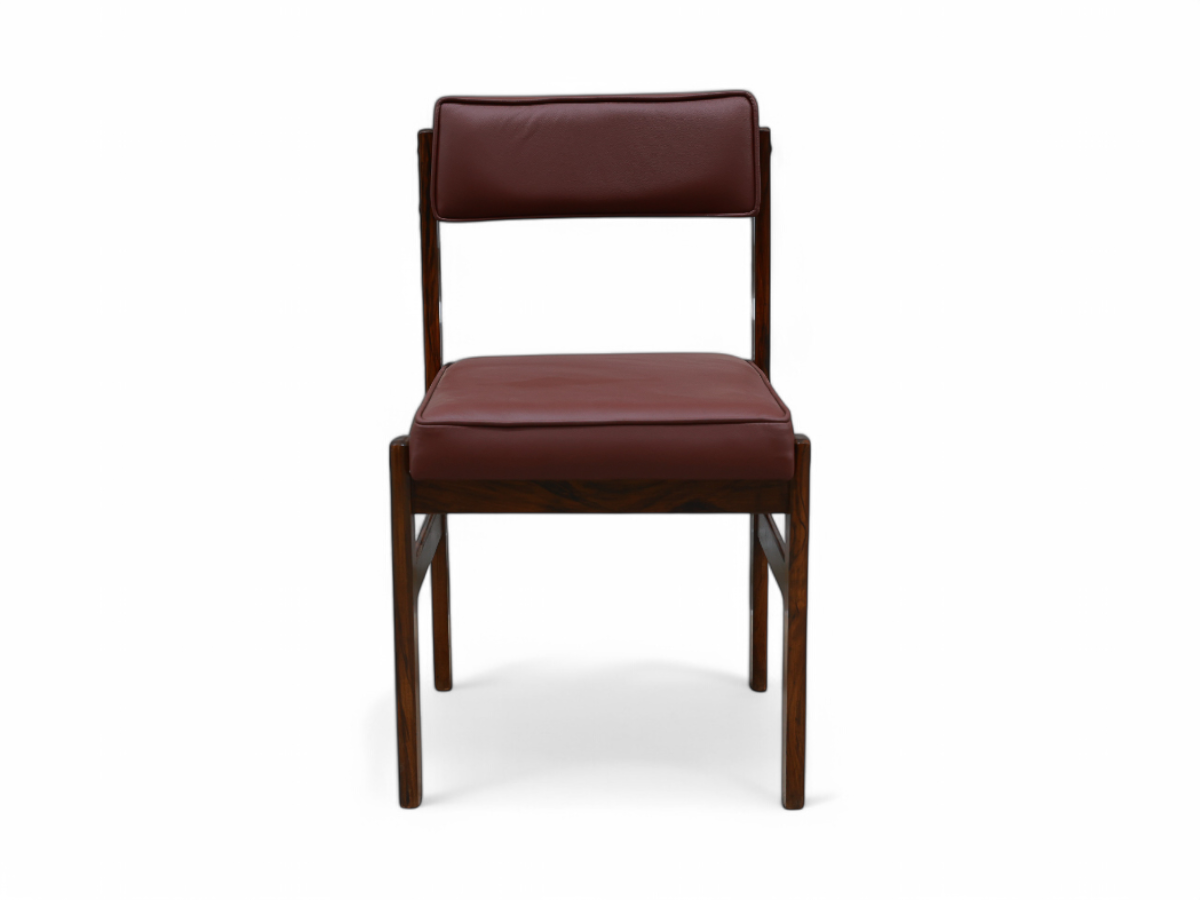 The "Tião" chair was designed by Sergio Rodrigues in 1959. The structure is in solid Brazilian Rosewood (Jacaranda) and they have been reupholstered in burgundy leather. The chair is in excellent condition. This comfortable, classic and elegant set would be a great addition to any style of home.