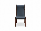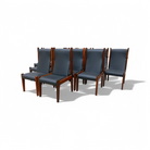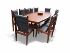 Each chair boasts a delicately curved backrest, enhancing ergonomic comfort during long meetings in the conference rooms they once graced. The original faux black leatherette upholstery has been faithfully recreated in genuine black leather, maintaining the set's original design intent. The rosewood frames have been refinished to reveal vibrant wood grains, showcasing their enduring beauty despite minor signs of age, primarily evident in the legs.