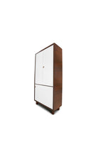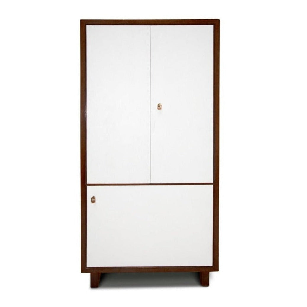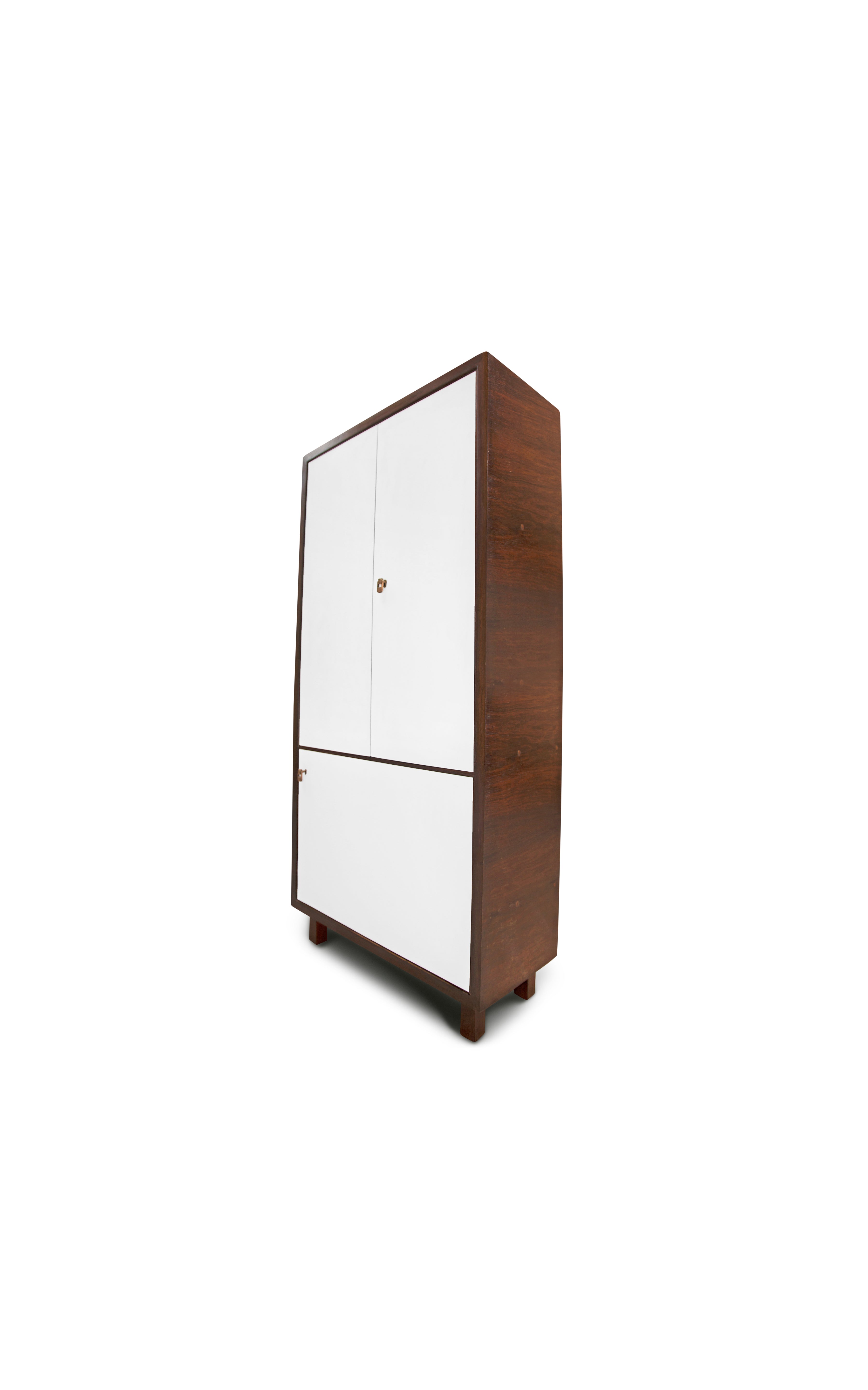 Discover an exquisite Brazilian modern cabinet, meticulously crafted by Liceu de Artes e Oficios in the 1960s. This extraordinary piece showcases the timeless beauty of Brazilian hardwood, adorned with elegant white formica and brass accents. Featuring three doors and two spacious compartments, this cabinet offers ample storage space for your belongings. One of the distinctive features of this cabinet is the original mirror in the back of the bottom compartment, which adds depth and a touch of vintage glamor. Supported by four sturdy hardwood legs, the structure exudes both strength and style. While the white formica has been replaced, the rest of the cabinet remains in its authentic state. The refinished wood surface reveals stunning natural veins, while the delicate brass finishes are impeccably preserved. The manufacturing seal, a testament to its quality, is proudly displayed on the back. Although there are small discreet holes in the back, likely made for cable routing purposes, they remain unseen from the interior. Embrace the opportunity to enhance your home with this remarkable piece, infusing it with the captivating allure of mid-century Brazilian modern style.
