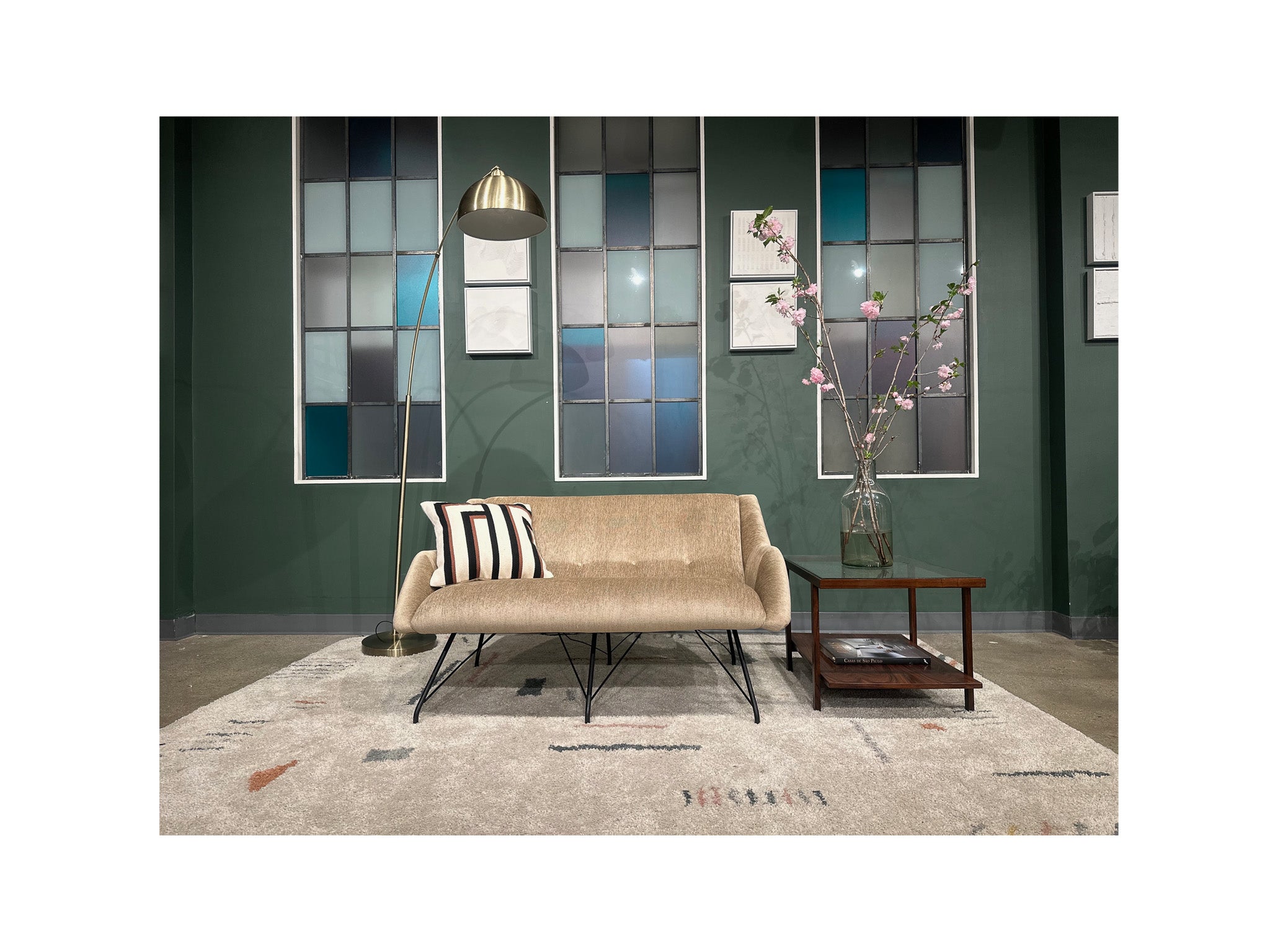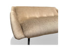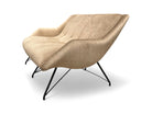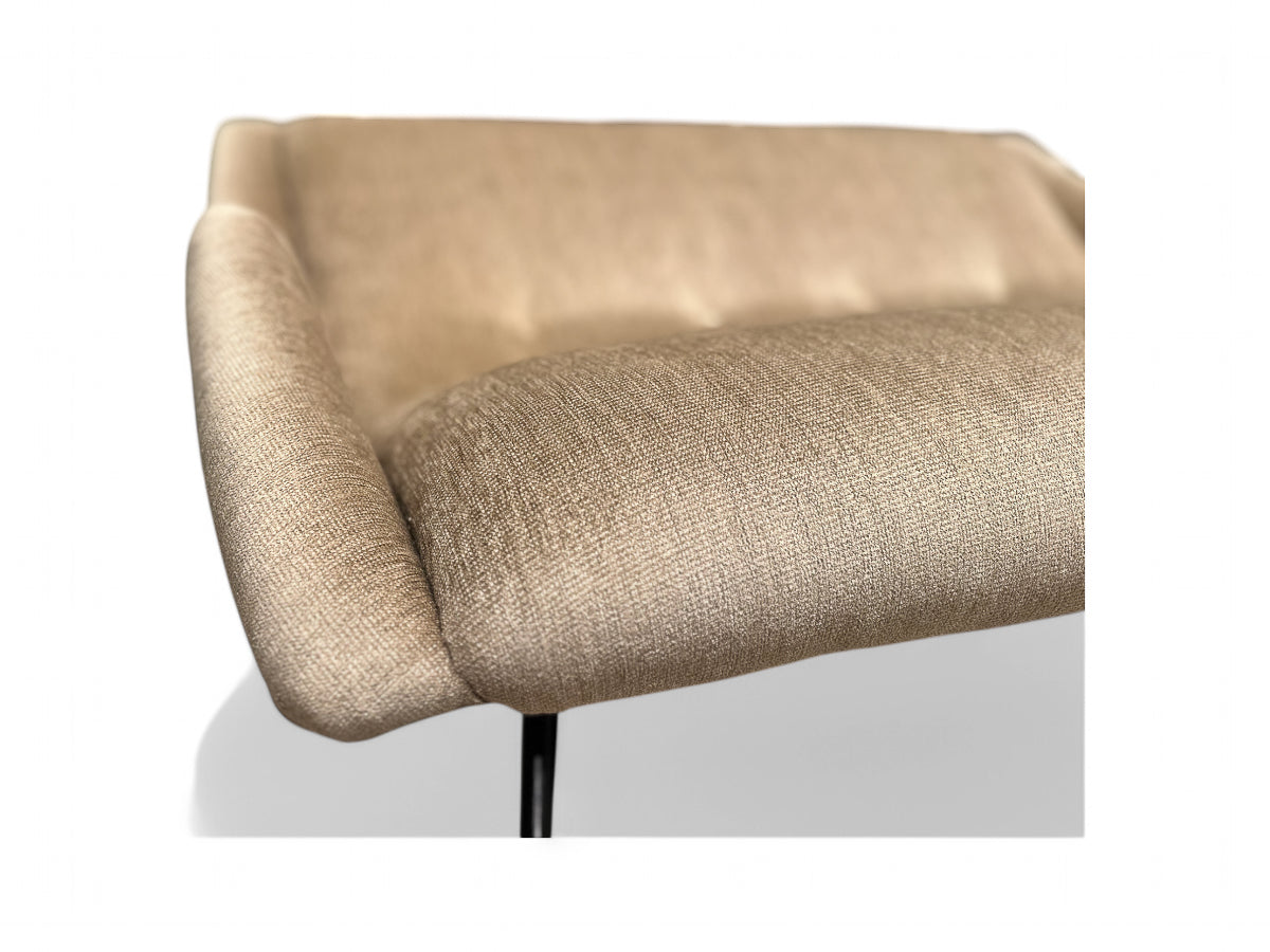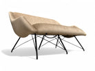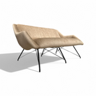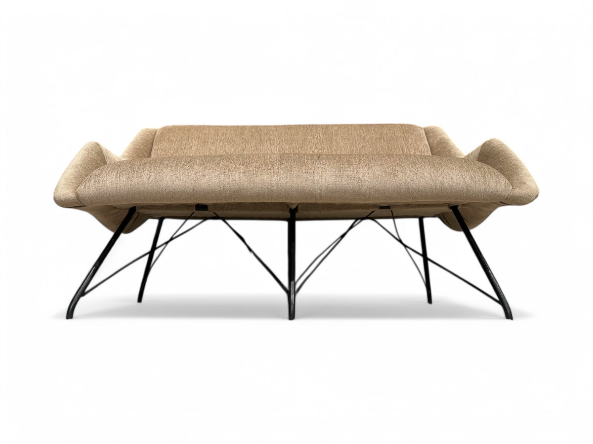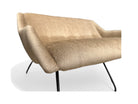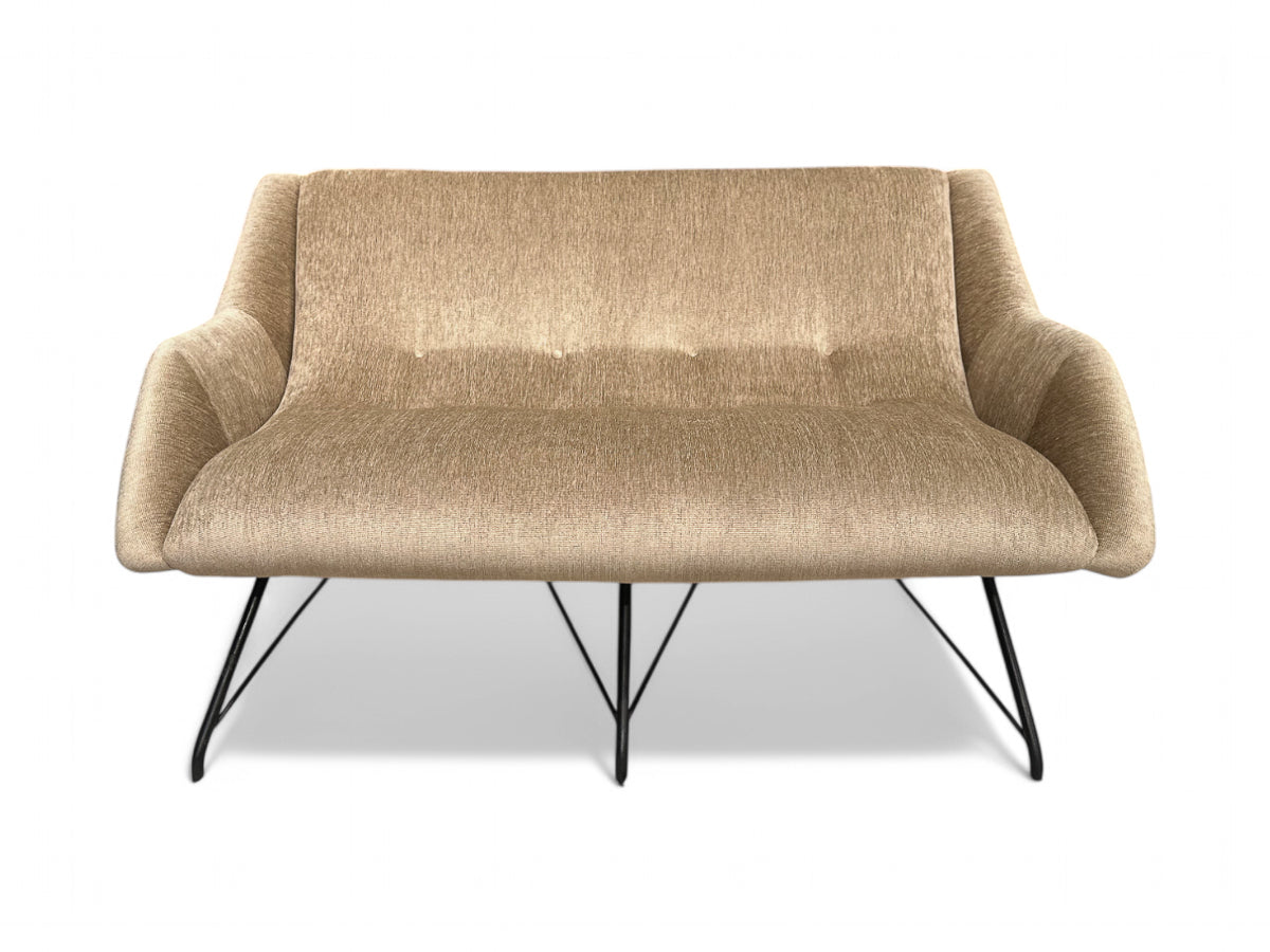 This loveseat, designed by Carlo Hauner and manufactured by Forma Móveis in Brazil in 1955, features a luxurious soft gold upholstery and a metal structure. Named “Concha” (Portuguese for "Shell") for its resemblance to an open seashell, this iconic mid-century modern piece is both comfortable and visually striking. It boasts an intricate and delicate iron base that supports the soft, curved, and newly reupholstered fabric. This gem of design captures the essence of mid-century modern aesthetics while offering superior comfort.