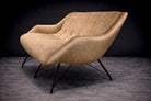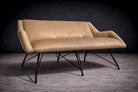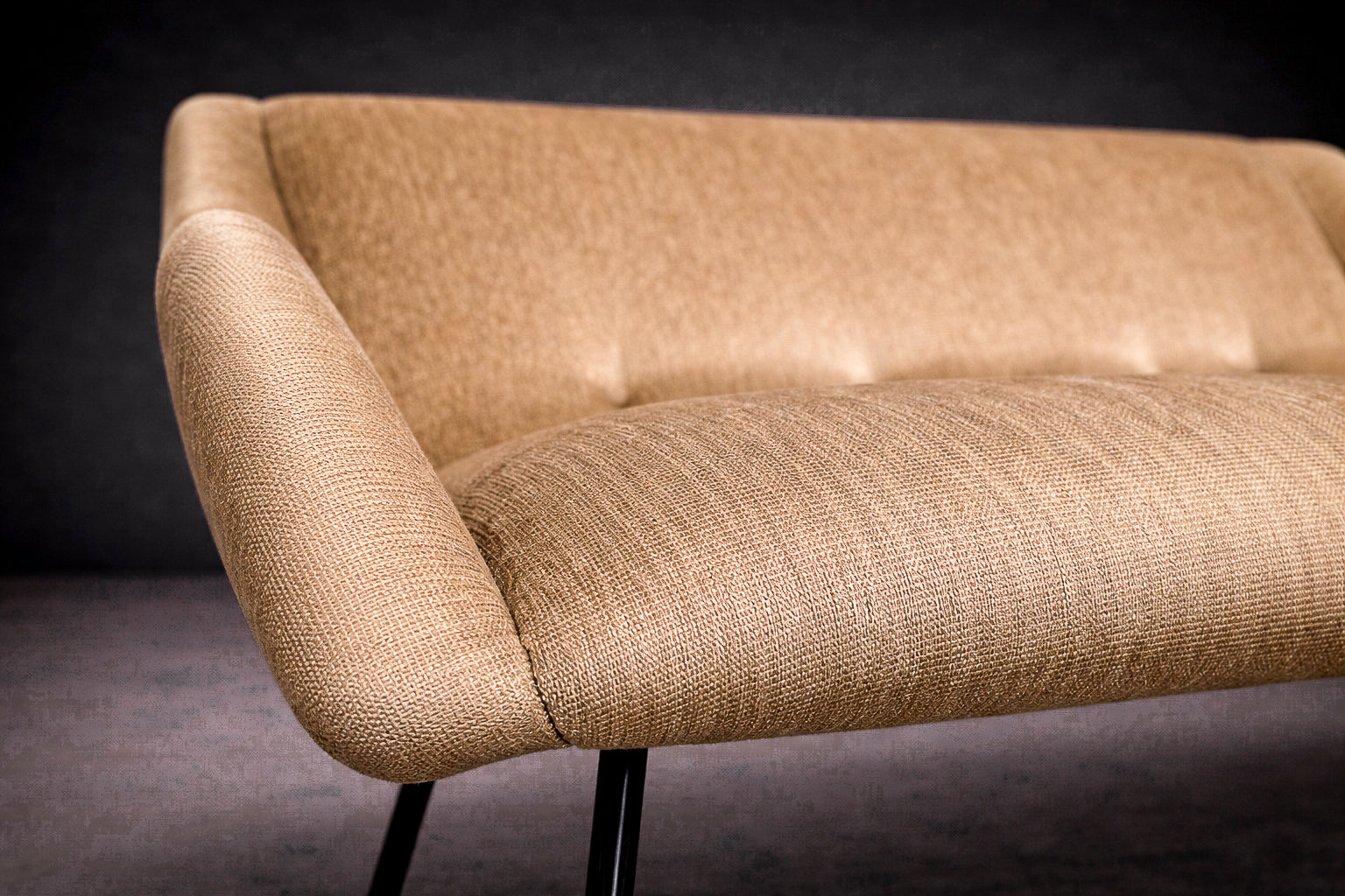 The metal structure has been carefully preserved, and the seating has been newly reupholstered in a soft brass colored fabric selected to complement the original design intent. Function is fully integrated into the form: the curved profile offers ergonomic support while maintaining an elegant, architectural presence. Presented in excellent vintage condition, the Concha loveseat remains a refined and increasingly scarce work, exemplifying the sophistication and material innovation that define Brazilian modern furniture of the 1950s.