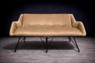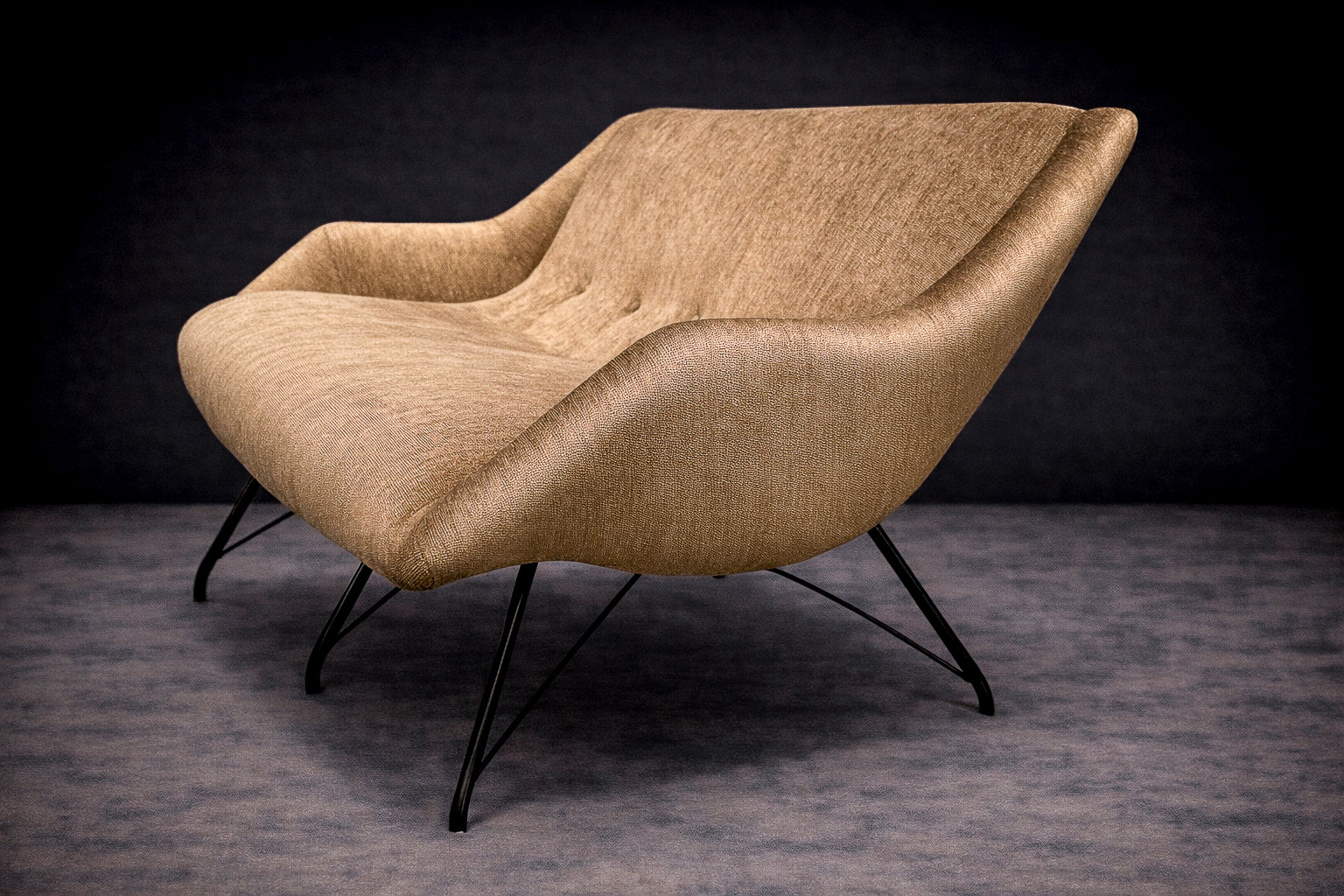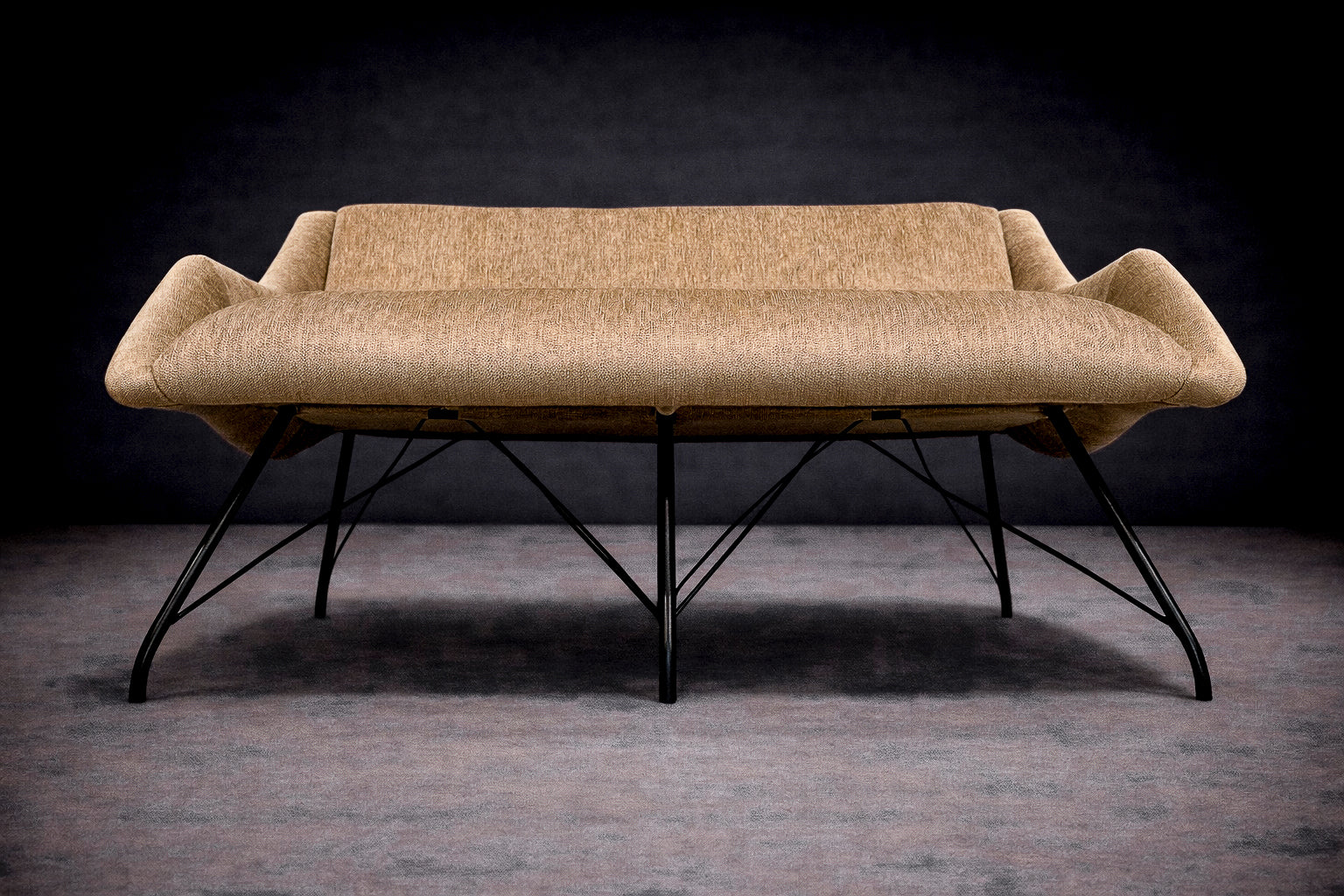 The loveseat is articulated through a softly curved seating form that appears to unfold from its structure, creating a sense of visual continuity and enclosure. This sculptural volume is anchored by a finely worked iron base, whose delicate lines provide both structural support and visual contrast.